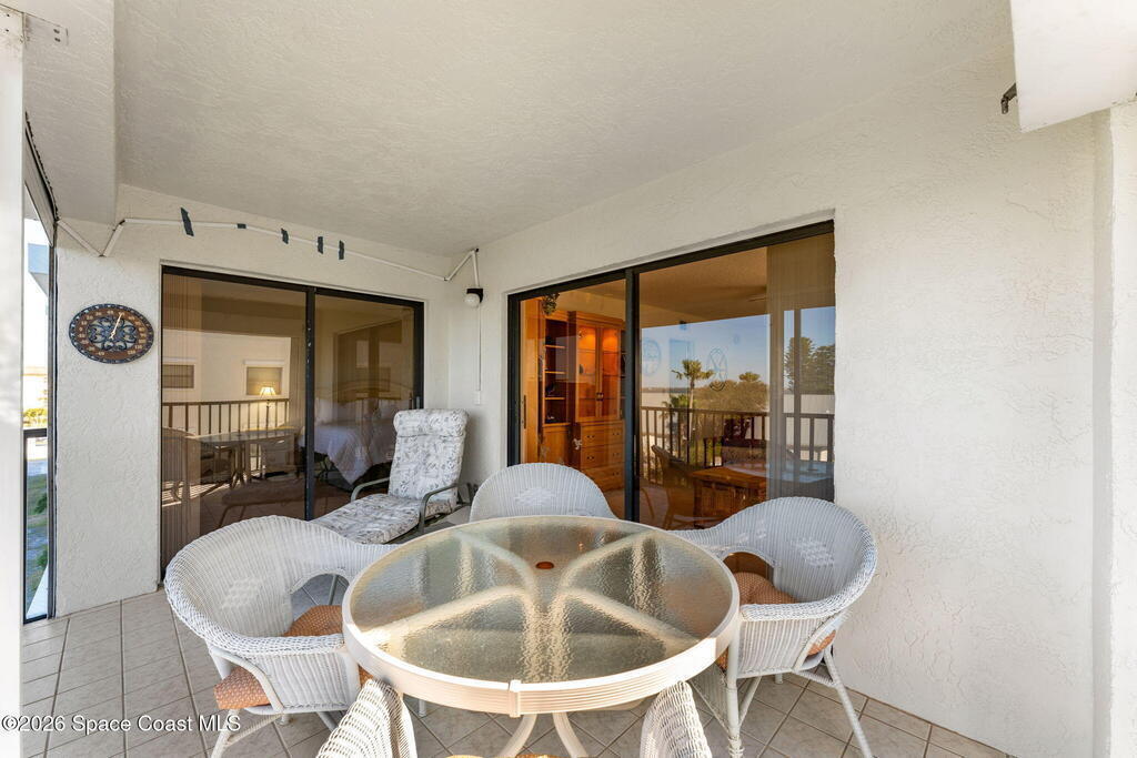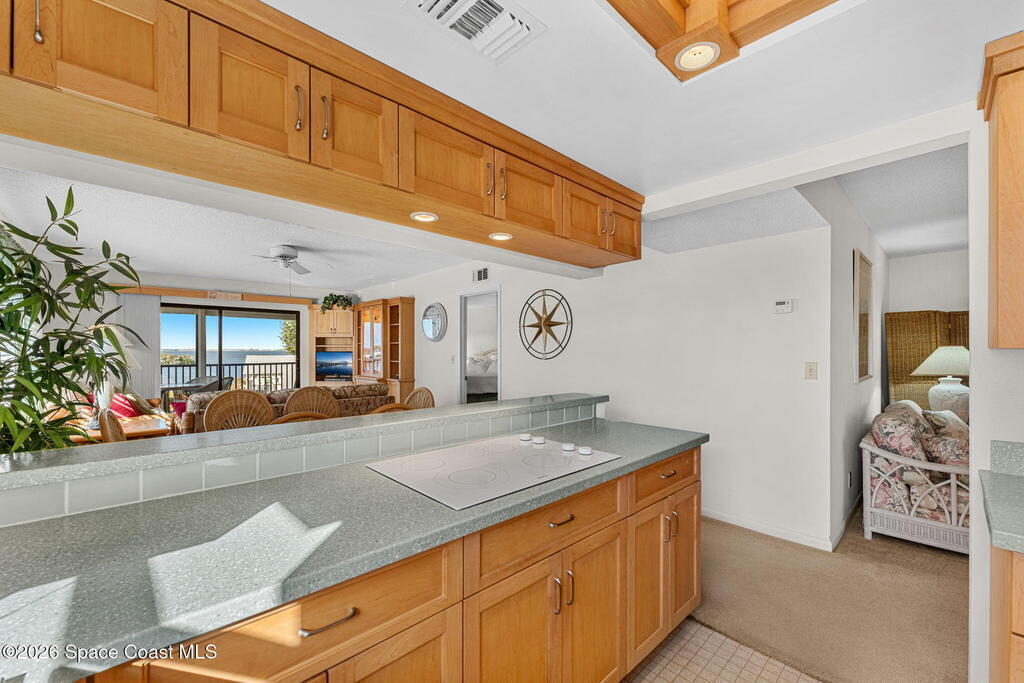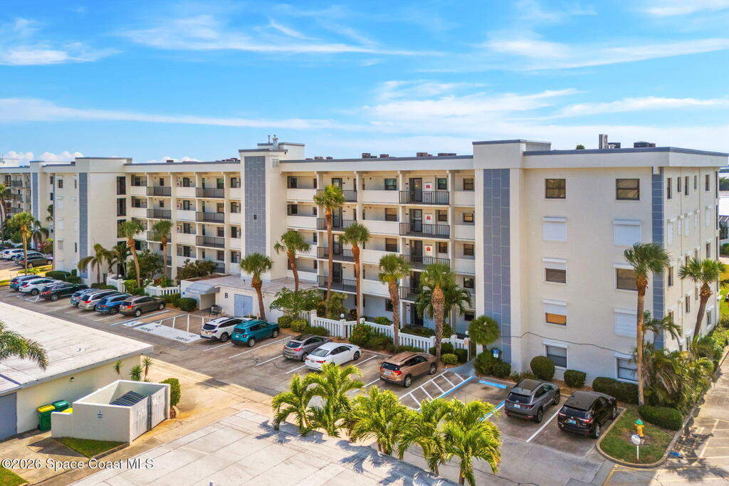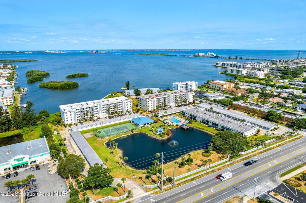 Rarely available 3-bedroom, 2-bath residence in Fountain Cove--an exceptional find in Cocoa Beach. Lovingly maintained as a second home, this fourth-floor unit offers custom wood cabinetry and Corian countertops in both the kitchen and baths, complemented by matching custom built-ins in the living room. Plush carpeting creates comfortable retreats in each bedroom. Enjoy sweeping Banana River views from the private balcony and the primary suite, where dual closets lead into a well-appointed en-suite bath. The balcony has recently completed restoration and is equipped with shutters for added peace of mind. Fountain Cove offers an inviting waterfront lifestyle with a pool, clubhouse, shuffleboard, river access, and car wash station. A deeded private one-car garage plus ample open parking complete this special offering.