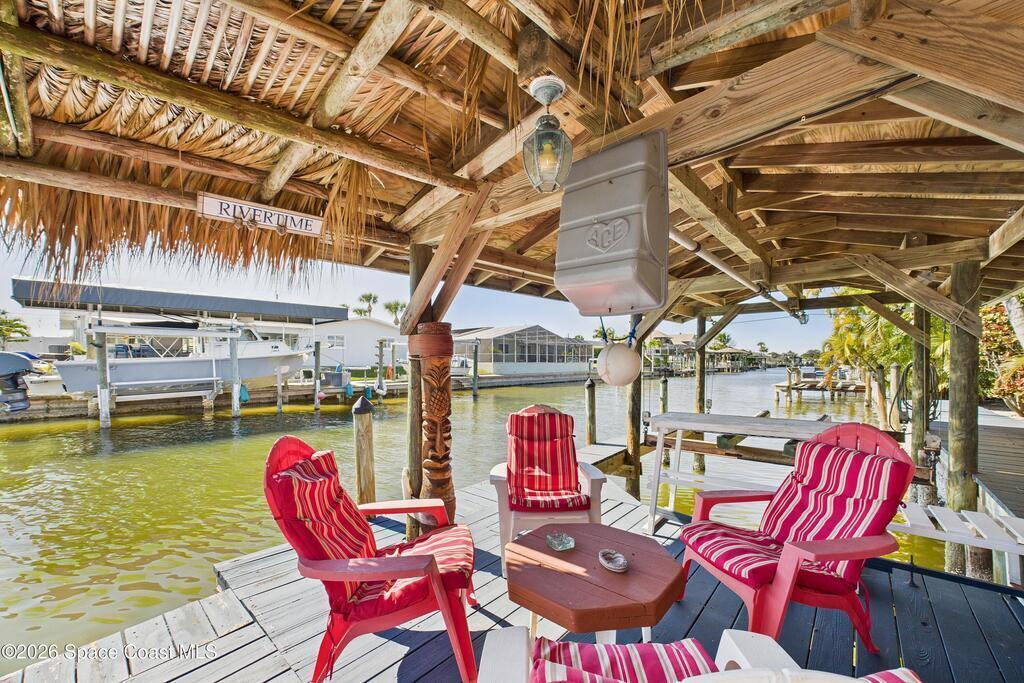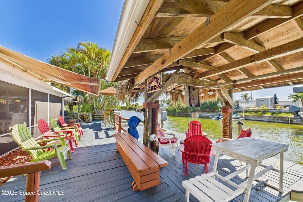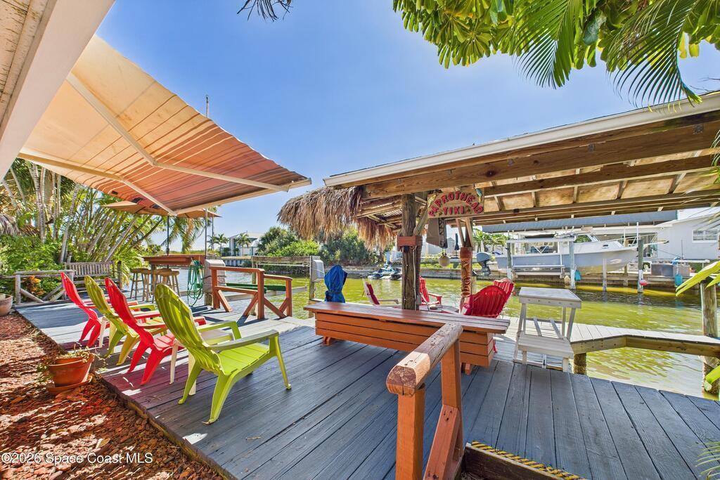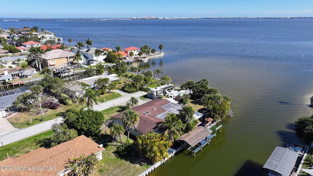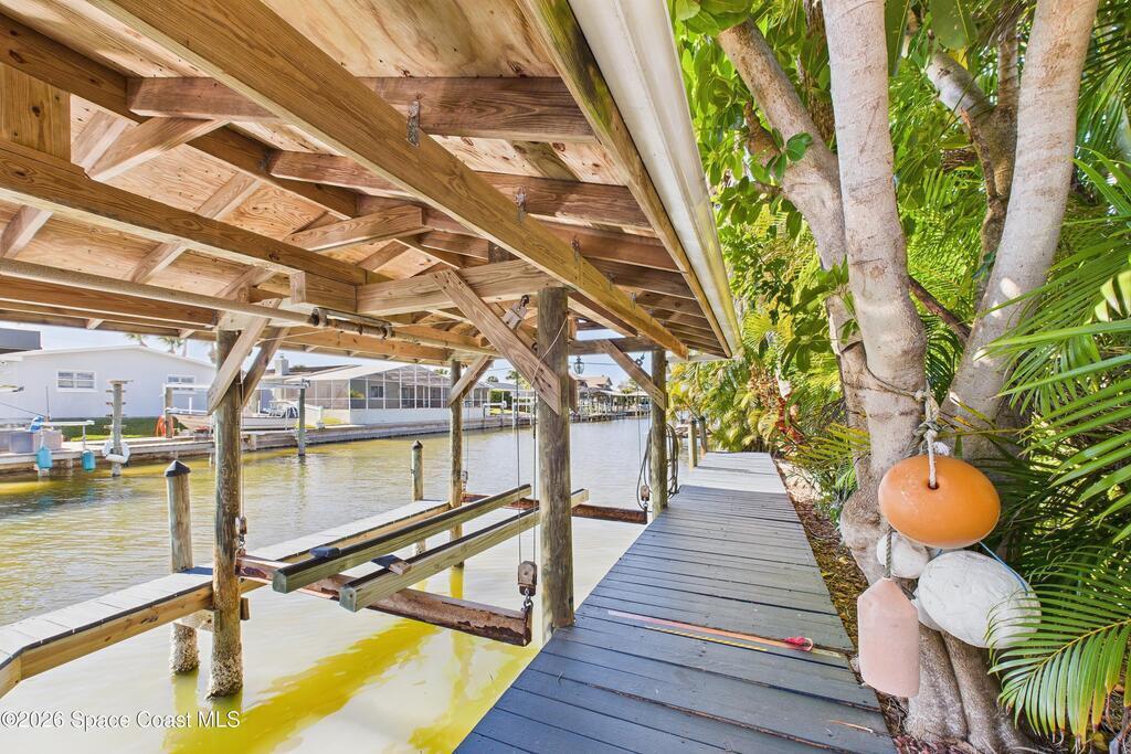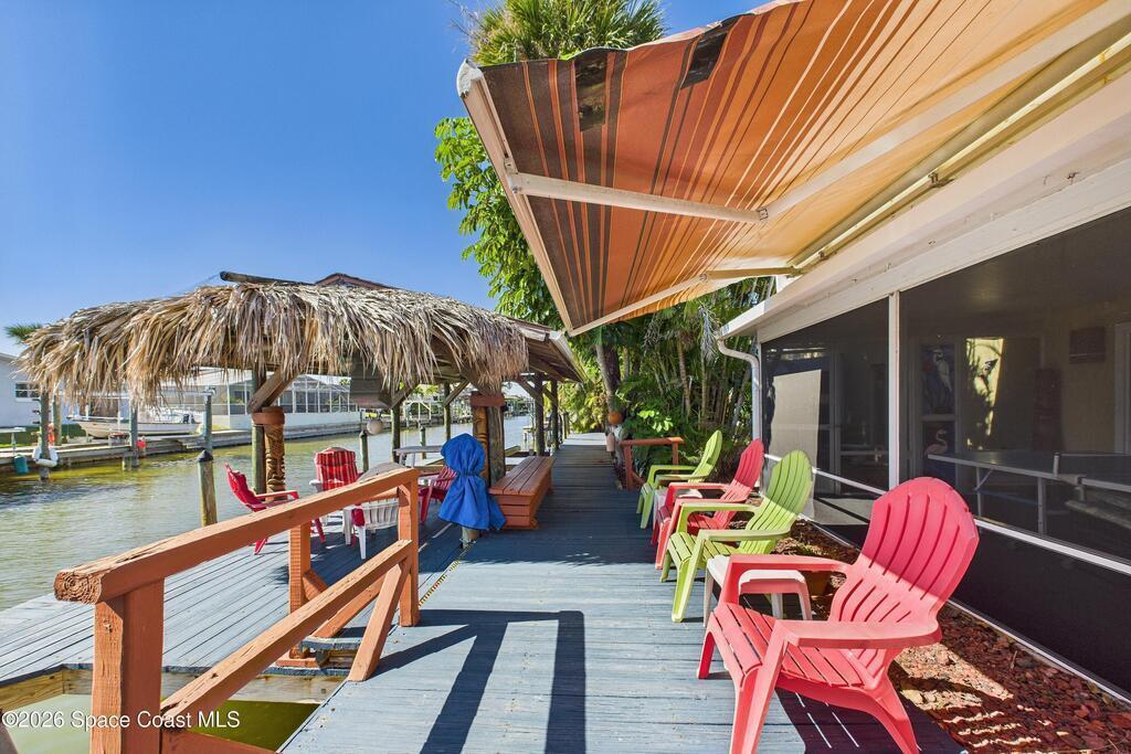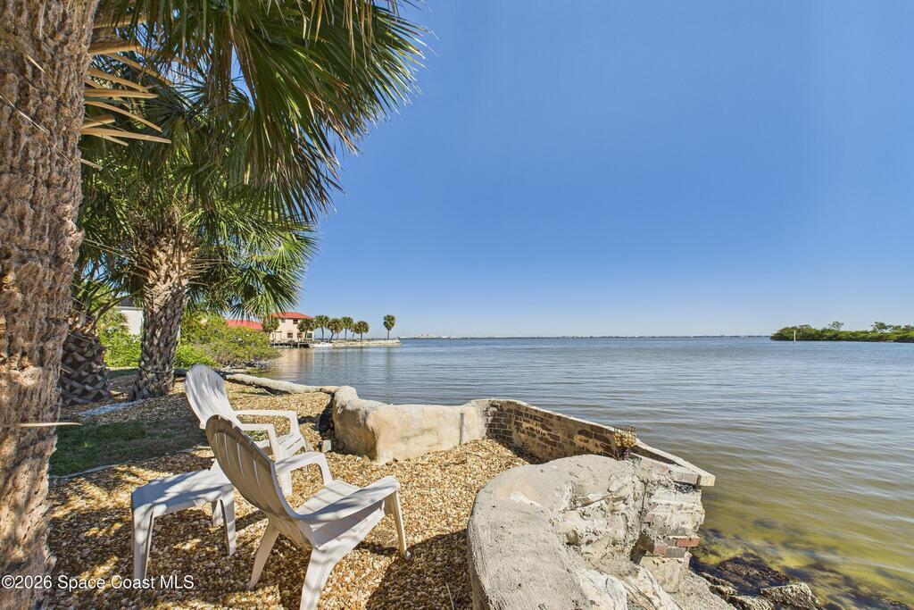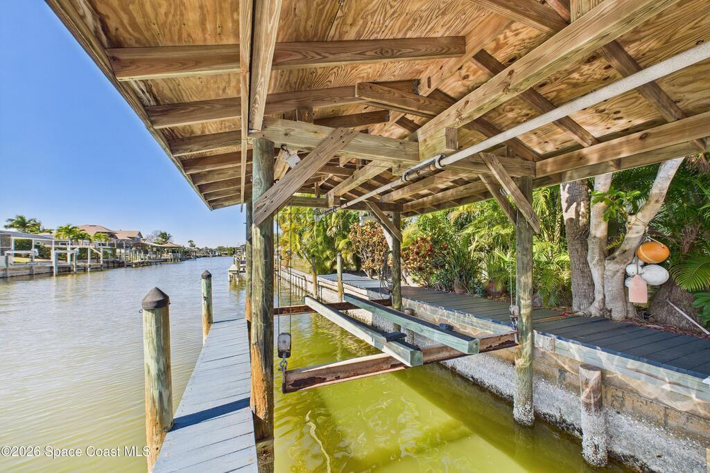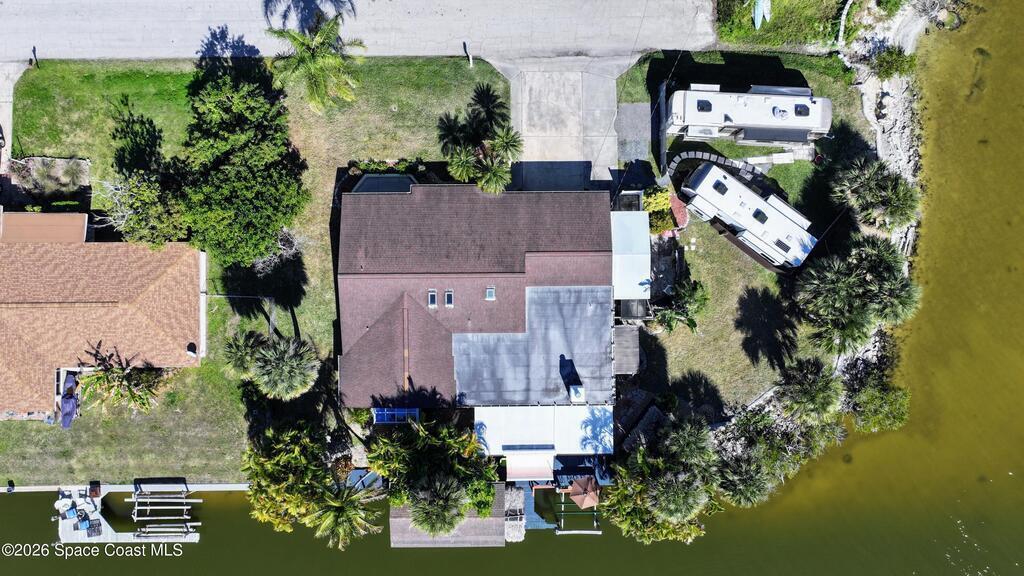 Waterfront living at its finest on an oversized lot with 224 feet of direct river and deep-water canal frontage offer breathtaking River views. This 3-bedroom, 2-bath home offers two additional bonus rooms, currently used as an art studio and home gym, providing flex space for work, creativity, guests or open it all up. Enjoy daily waterfront beauty with the ability to watch rocket launches and cruise ships from your own backyard, with nearby Port Canaveral. The primary features a full window solarium sitting area, perfect for taking in canal scenery. Boaters will appreciate two boat lifts with ample dock space. The property also offers Accordion shutters and impact sliders for added storm protection and peace of mind. extra parking for boats, RVs, or trailers, complete with RV water and electrical hookups for easy plug-and-play convenience. This is a rare opportunity to own a versatile, well-positioned waterfront home with unmatched views, storage, and lifestyle amenities.
