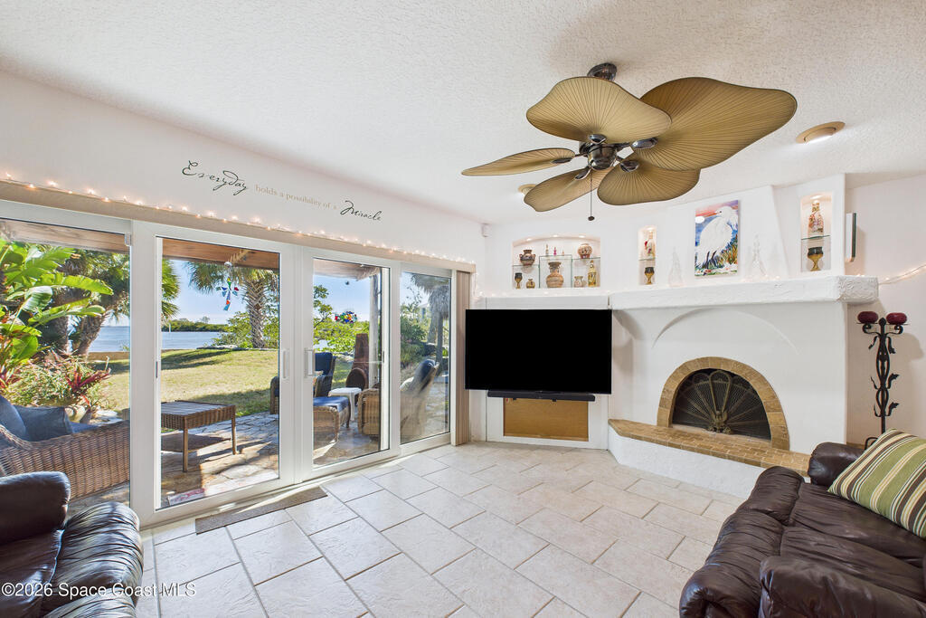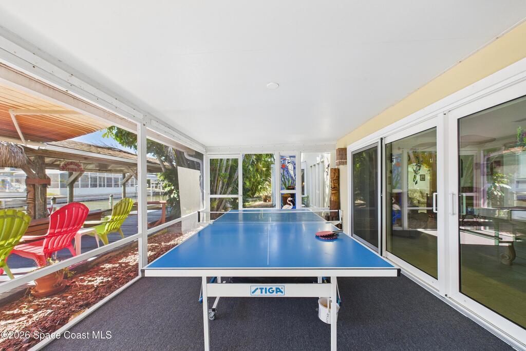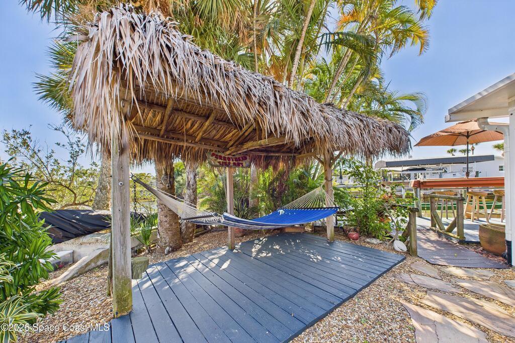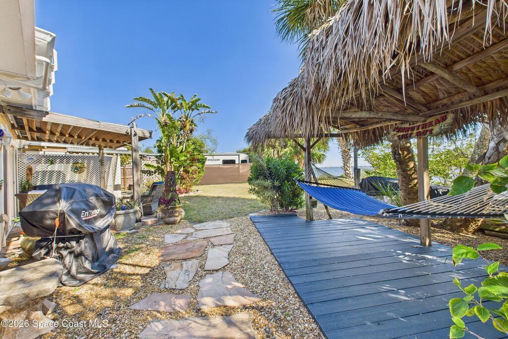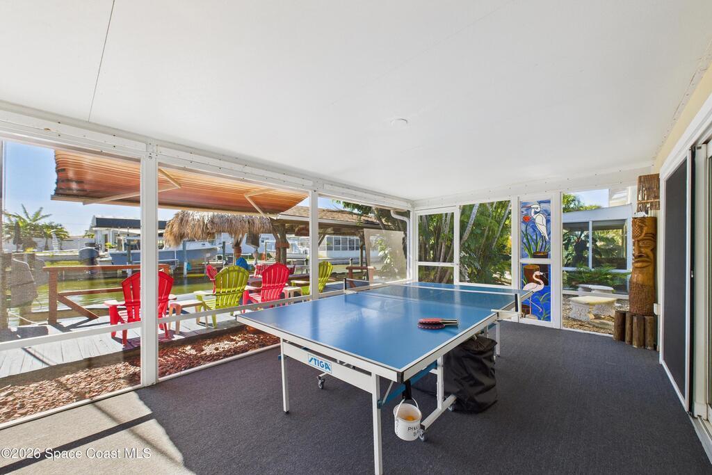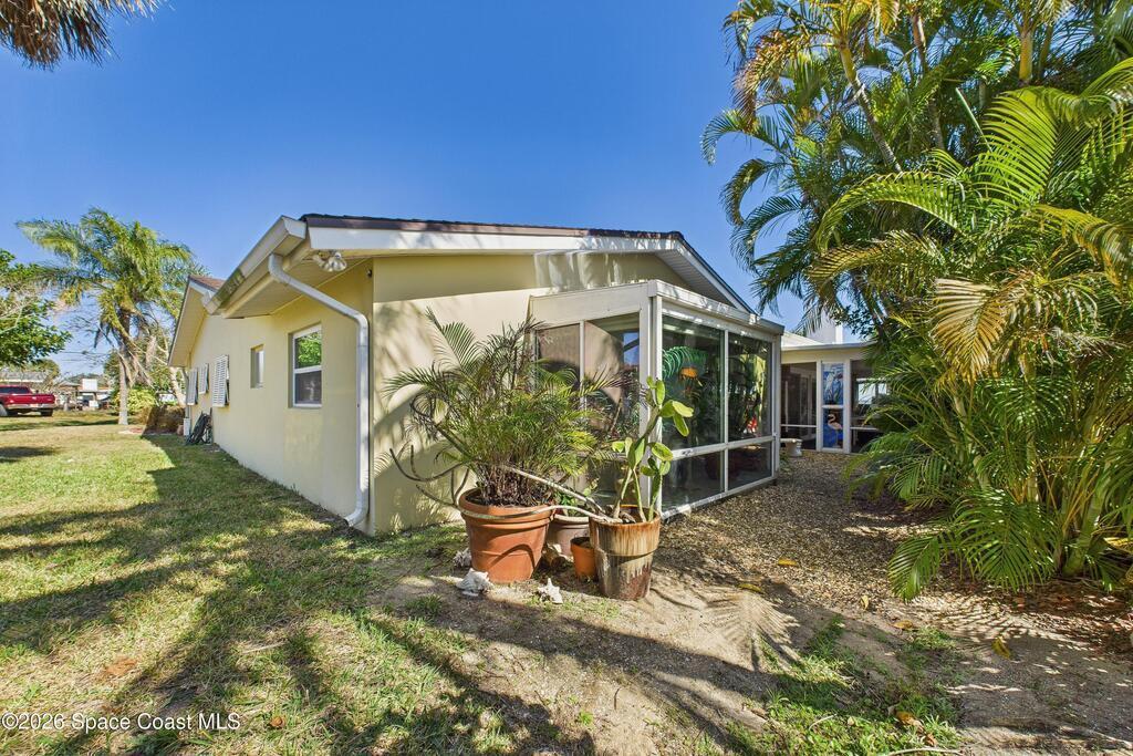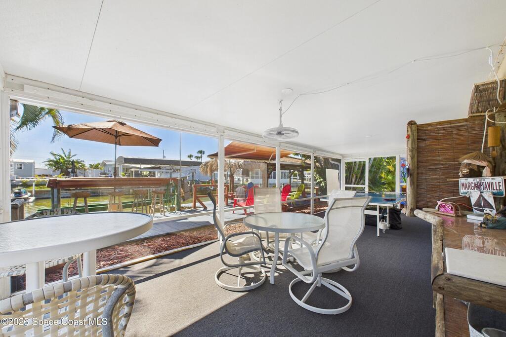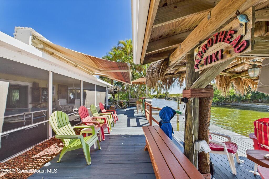 Waterfront living at its finest on an oversized lot with 224 feet of direct river and deep-water canal frontage offer breathtaking River views. This 3-bedroom, 2-bath home offers two additional bonus rooms, currently used as an art studio and home gym, providing flex space for work, creativity, guests or open it all up. Enjoy daily waterfront beauty with the ability to watch rocket launches and cruise ships from your own backyard, with nearby Port Canaveral. The primary features a full window solarium sitting area, perfect for taking in canal scenery. Boaters will appreciate two boat lifts with ample dock space. The property also offers Accordion shutters and impact sliders for added storm protection and peace of mind. extra parking for boats, RVs, or trailers, complete with RV water and electrical hookups for easy plug-and-play convenience. This is a rare opportunity to own a versatile, well-positioned waterfront home with unmatched views, storage, and lifestyle amenities.