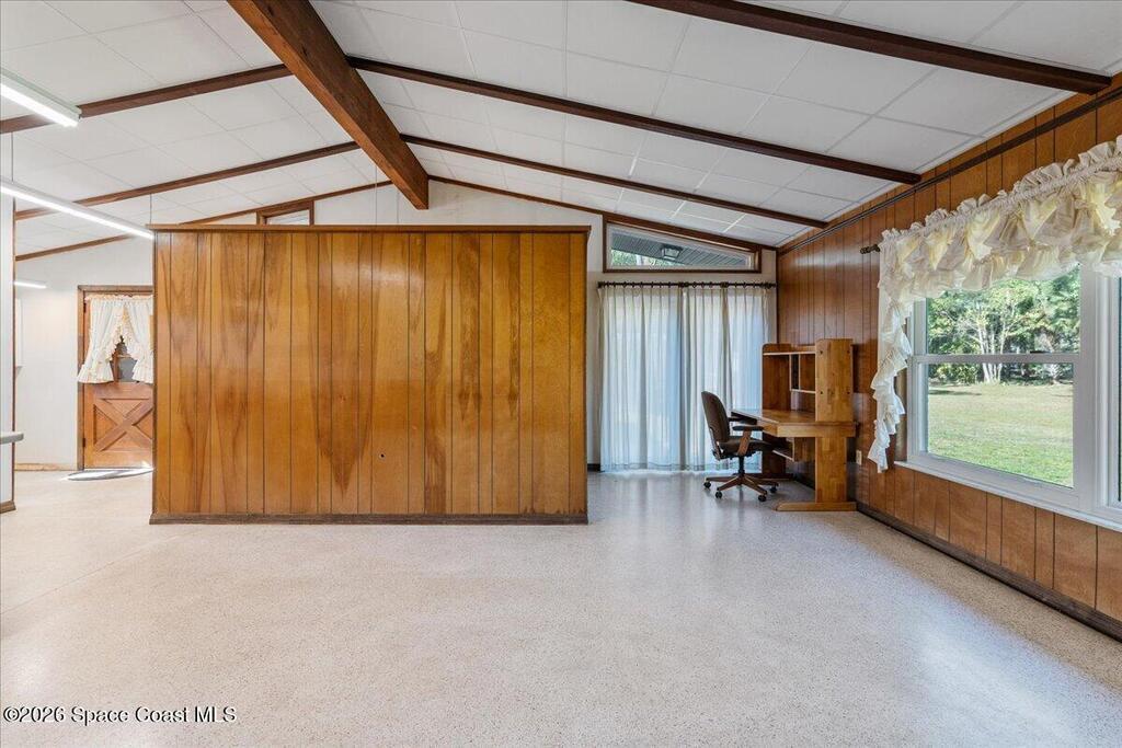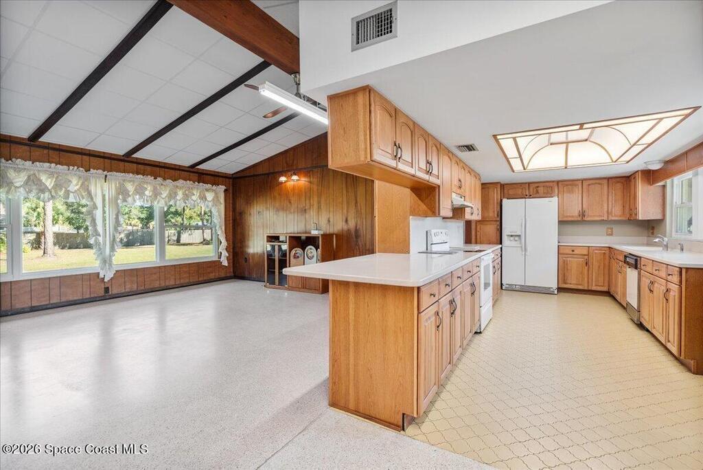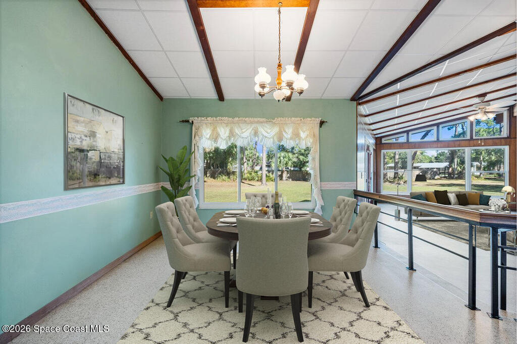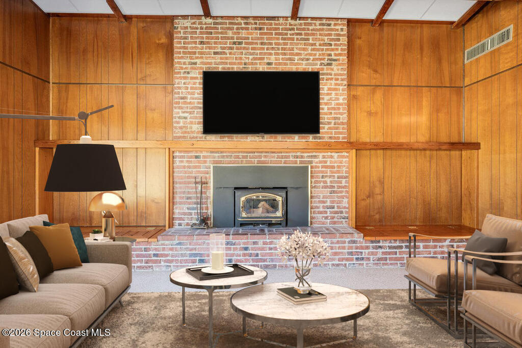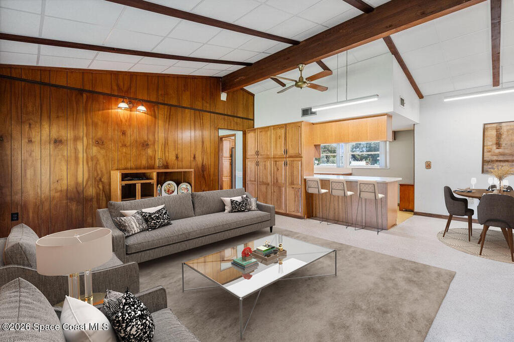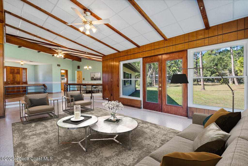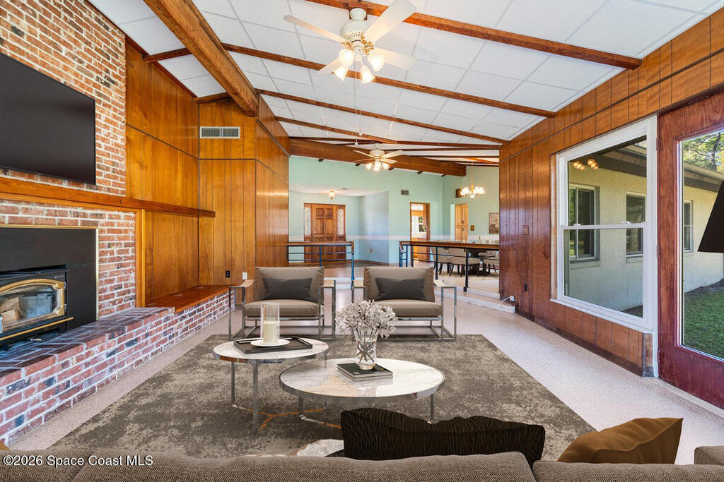 Set on four private acres, this mid-century modern ranch-style estate is a rare blend of architectural authenticity, thoughtful updates, and future potential. With over 2,700 square feet of single-story living, the home offers expansive spaces designed to feel both grounded and open, exactly as mid-century design was meant to be. Inside, original details steal the show. Exposed wood beams stretch across vaulted ceilings, adding warmth and character, while original terrazzo floors run throughout, delivering durability, style, and a timeless nod to the home's roots. Anchoring the main living area is a striking brick fireplace that serves as both a focal point and a gathering place, equal parts cozy and architectural. Walls of windows bring the outdoors in, flooding the space with natural light and framing peaceful views of the surrounding acreage. The layout flows effortlessly into an updated kitchen where modern functionality meets classic design, making everyday living and enter-