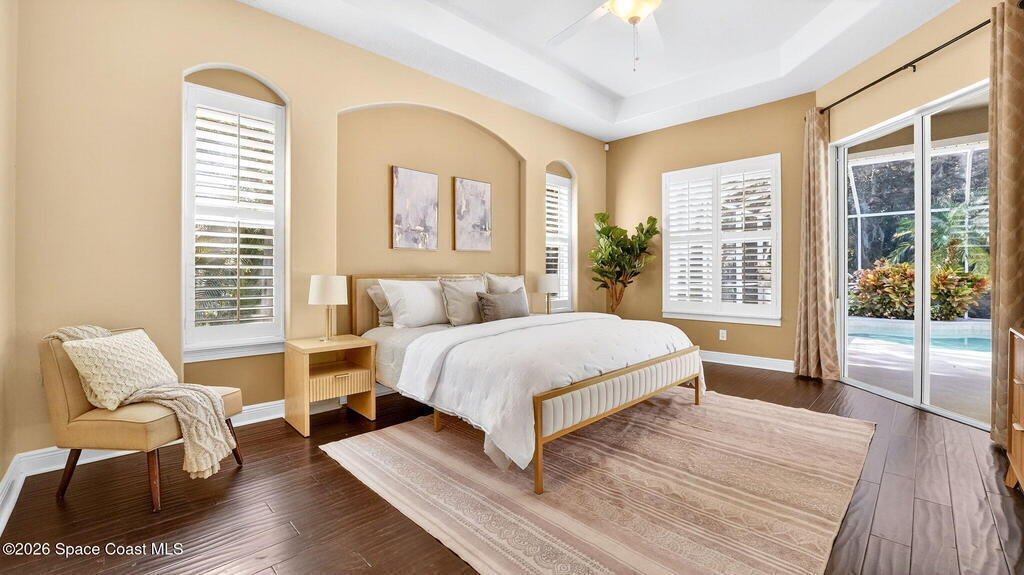 This custom-built pool home sits on a 1/2-acre lot with a peaceful preserve backdrop, offering exceptional privacy and space. Inside, soaring ceilings and an open, light-filled layout create a warm and welcoming feel from the moment you enter. The kitchen opens seamlessly to the living areas, making everyday living and entertaining easy. A versatile bonus room provides flexibility for a home office, playroom, media space, or multigenerational living. Step outside to a covered, screened patio overlooking the private backyard and sparkling pool--perfect for relaxing or hosting family and friends. Additional features include tile and wood flooring, plantation shutters, crown molding, an oversized 3-car garage, large paver driveway, and a 2019 roof. Located in an established community with mature surroundings and convenient access to Space Coast employers, beaches, and everyday amenities.