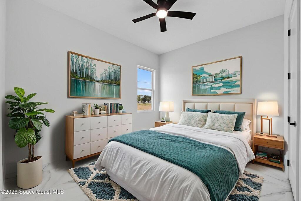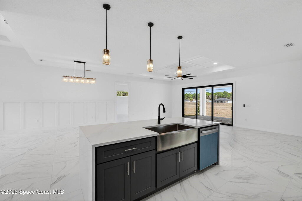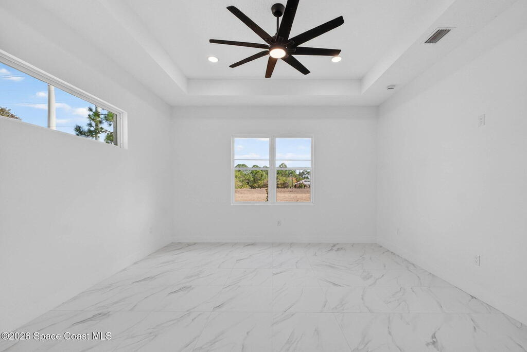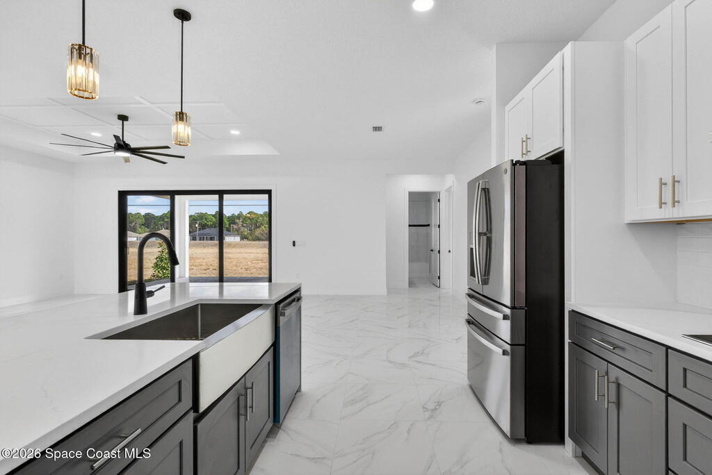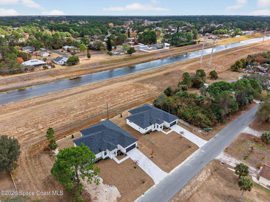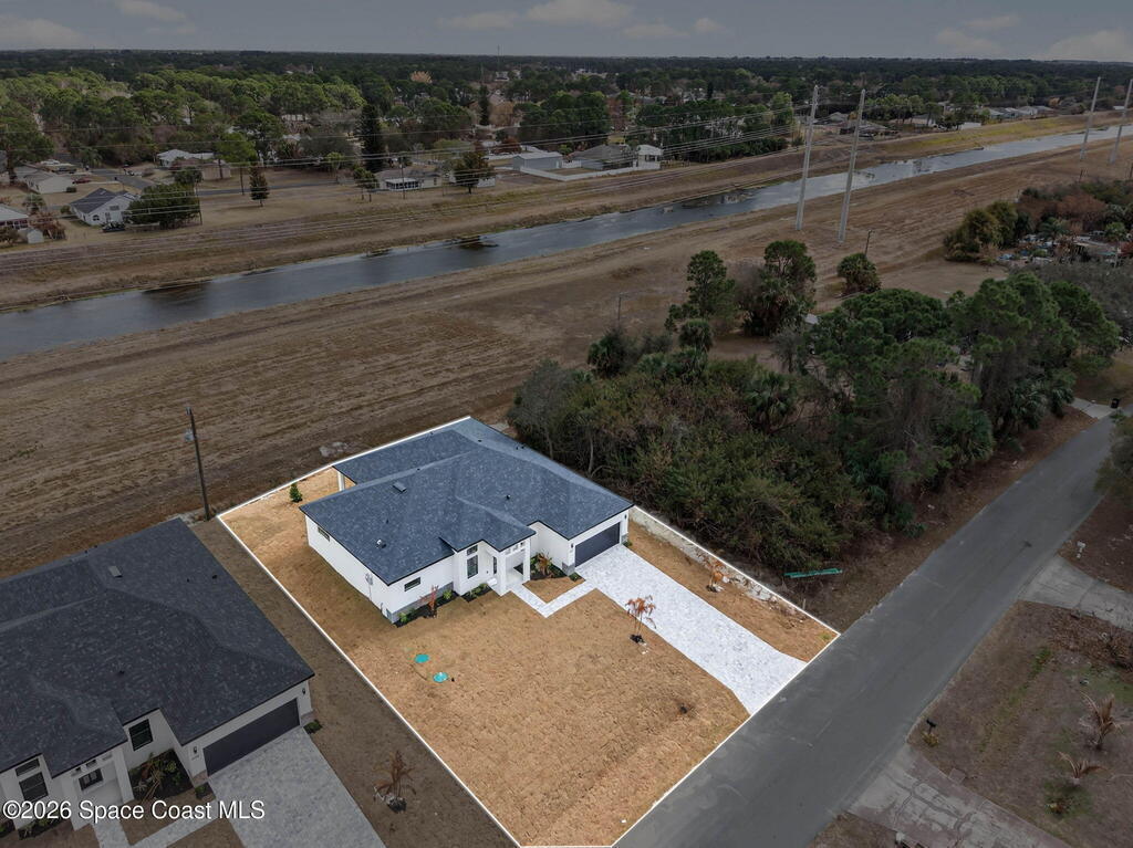 A rare canal-front new construction offering elevated modern living in Northwest Palm Bay. This 2,350 sq ft residence features true 10-foot ceilings with dramatic double tray details, creating a grand architectural presence. Designer 24'' x 24'' tile flooring flows seamlessly throughout, complementing the home's refined contemporary aesthetic.The gourmet kitchen features a wall oven and high end appliance package, ideal for entertaining and everyday living. The spa-inspired primary suite offers a freestanding soaking tub and spacious walk-in shower.Enjoy a covered patio overlooking the tranquil canal, providing privacy and a peaceful outdoor setting. Additional highlights include a luxury paver driveway, paver patio, smart lock system, Impact windows, and modern energy-efficient construction. A rare opportunity to own a thoughtfully designed canal-front residence built for comfort, prestige, and lasting value.