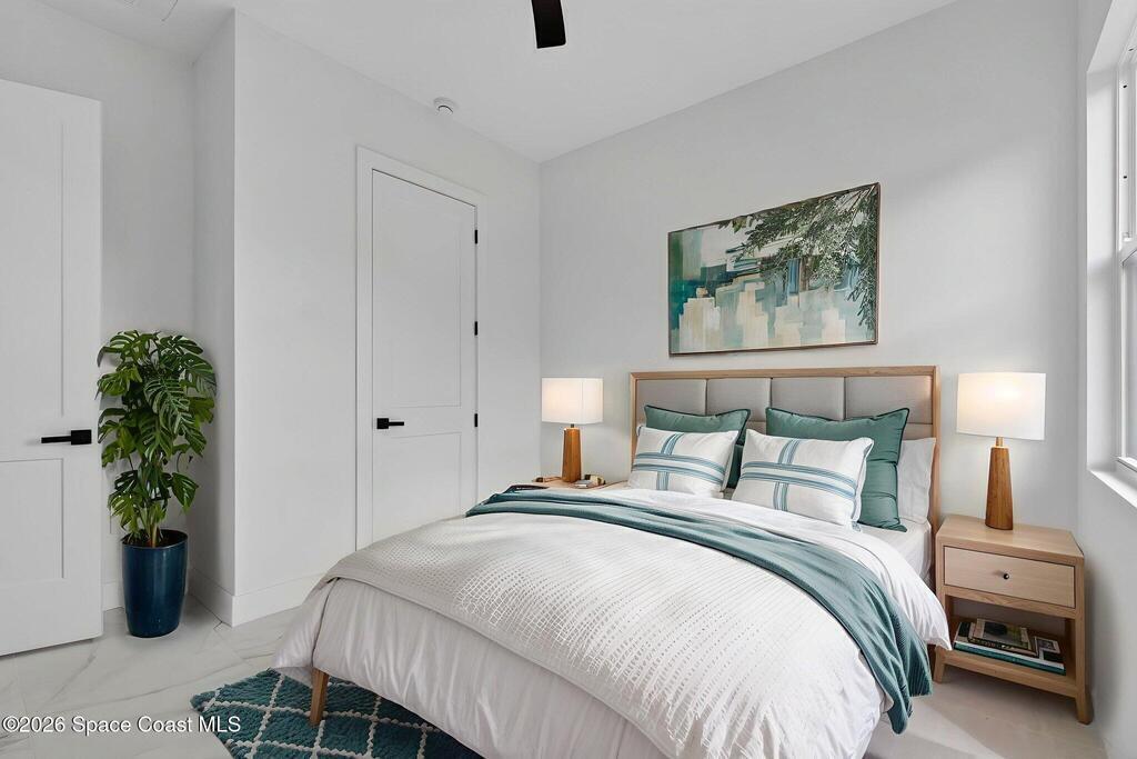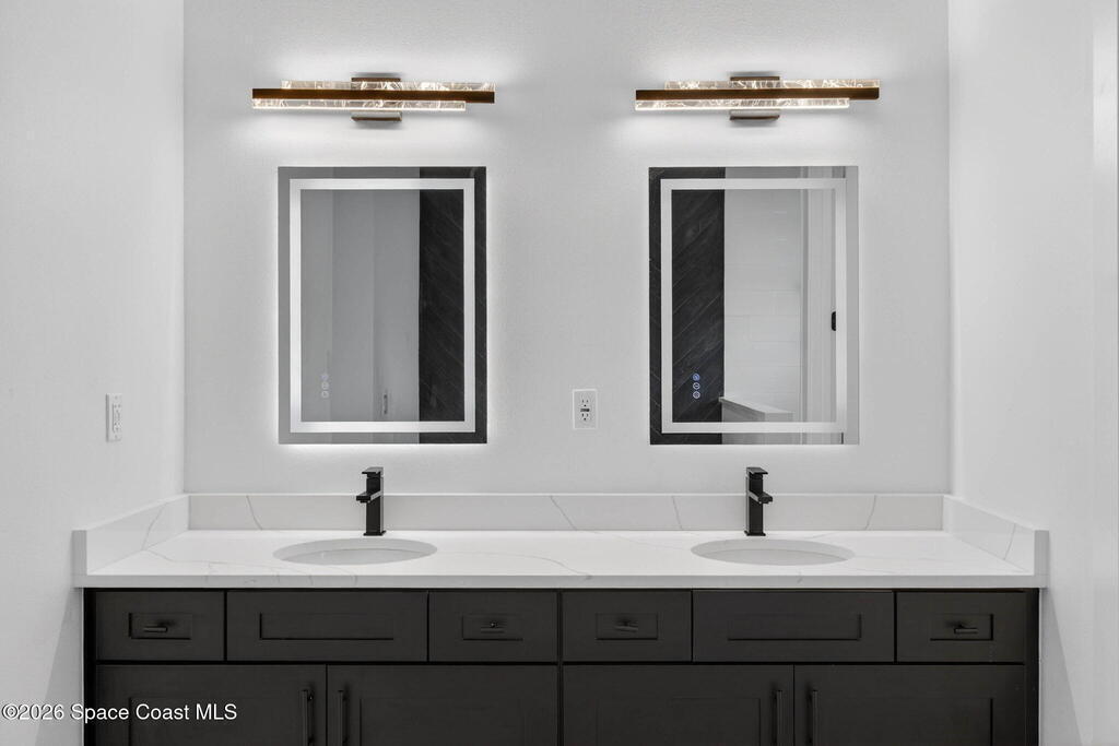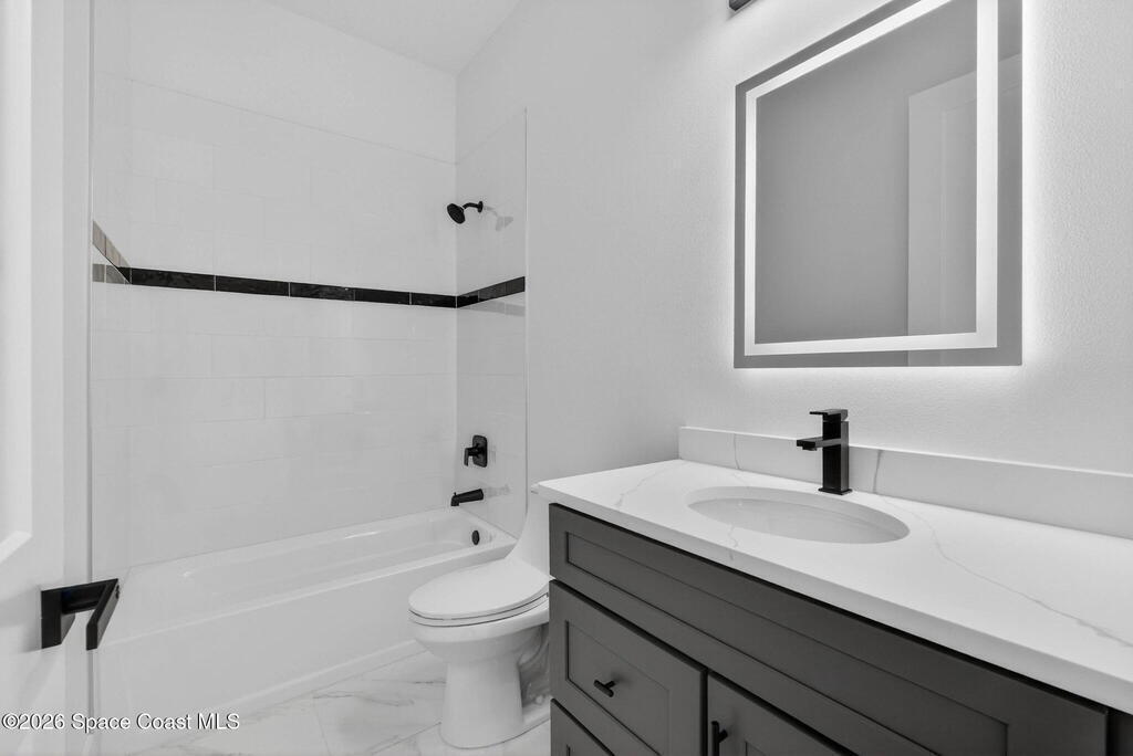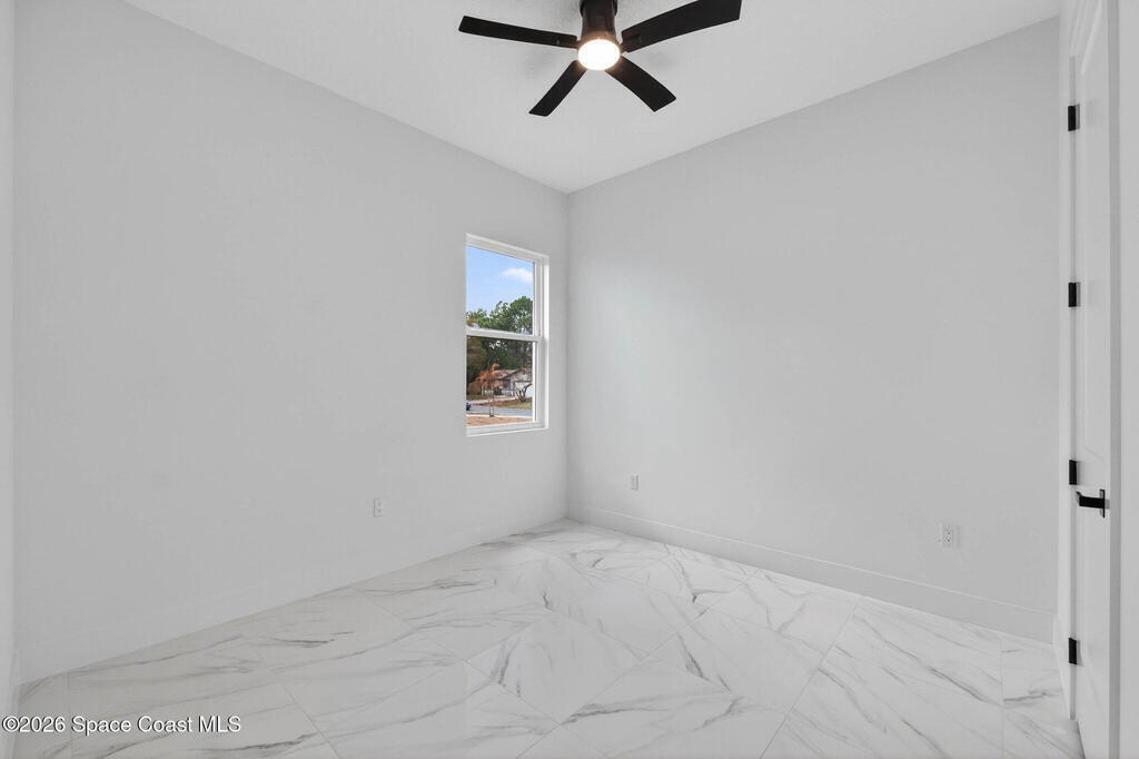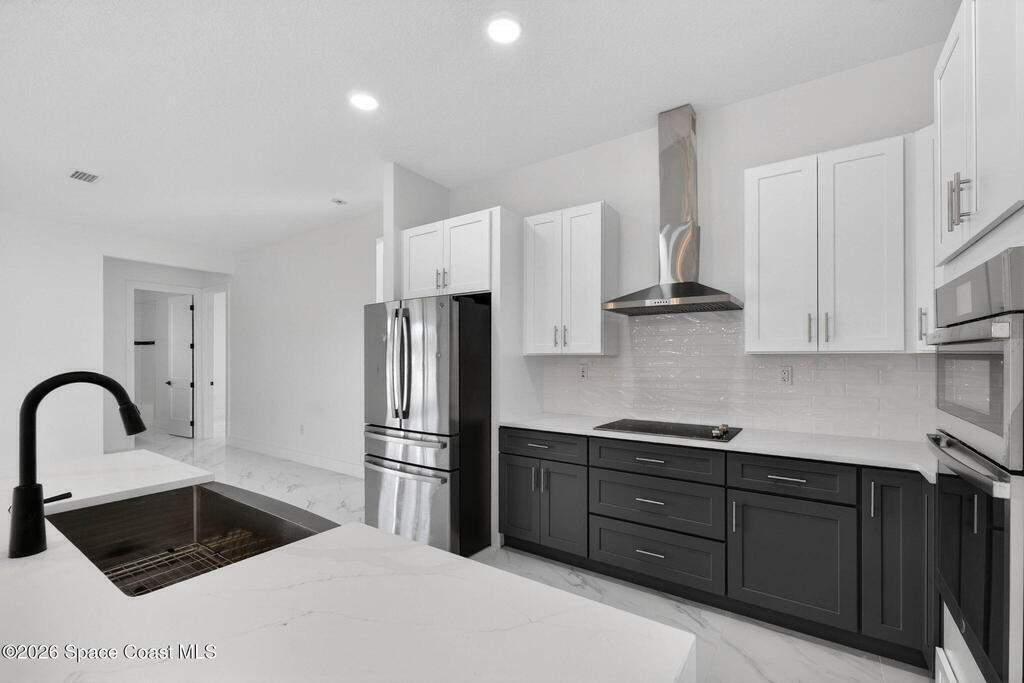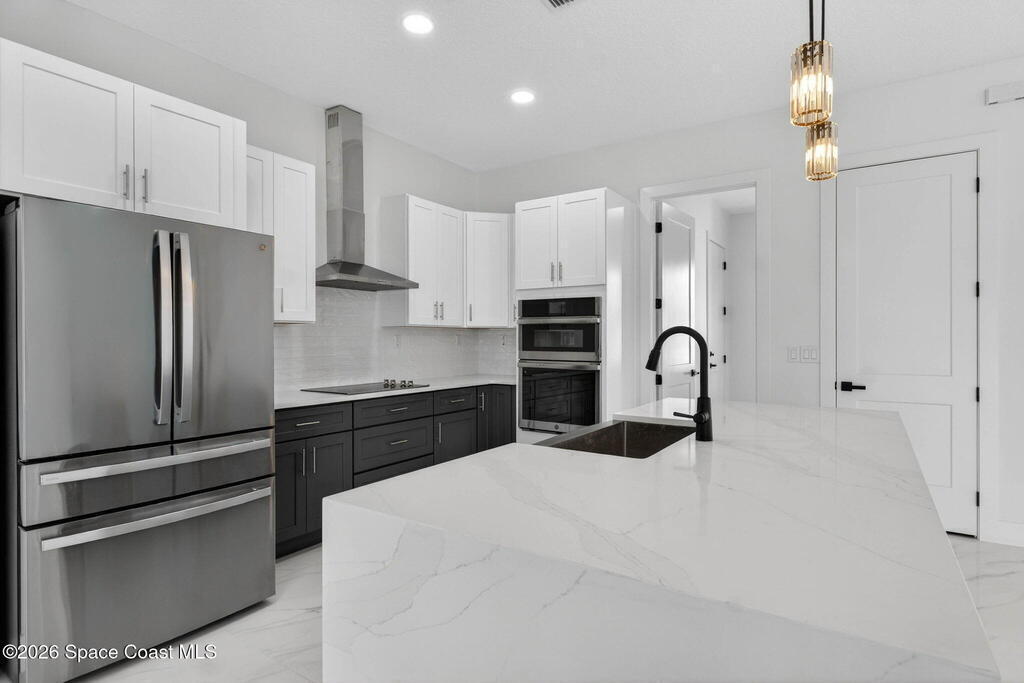 A rare canal-front new construction offering elevated modern living in Northwest Palm Bay. This 2,350 sq ft residence features true 10-foot ceilings with dramatic double tray details, creating a grand architectural presence. Designer 24'' x 24'' tile flooring flows seamlessly throughout, complementing the home's refined contemporary aesthetic.The gourmet kitchen features a wall oven and high end appliance package, ideal for entertaining and everyday living. The spa-inspired primary suite offers a freestanding soaking tub and spacious walk-in shower.Enjoy a covered patio overlooking the tranquil canal, providing privacy and a peaceful outdoor setting. Additional highlights include a luxury paver driveway, paver patio, smart lock system, Impact windows, and modern energy-efficient construction. A rare opportunity to own a thoughtfully designed canal-front residence built for comfort, prestige, and lasting value.
