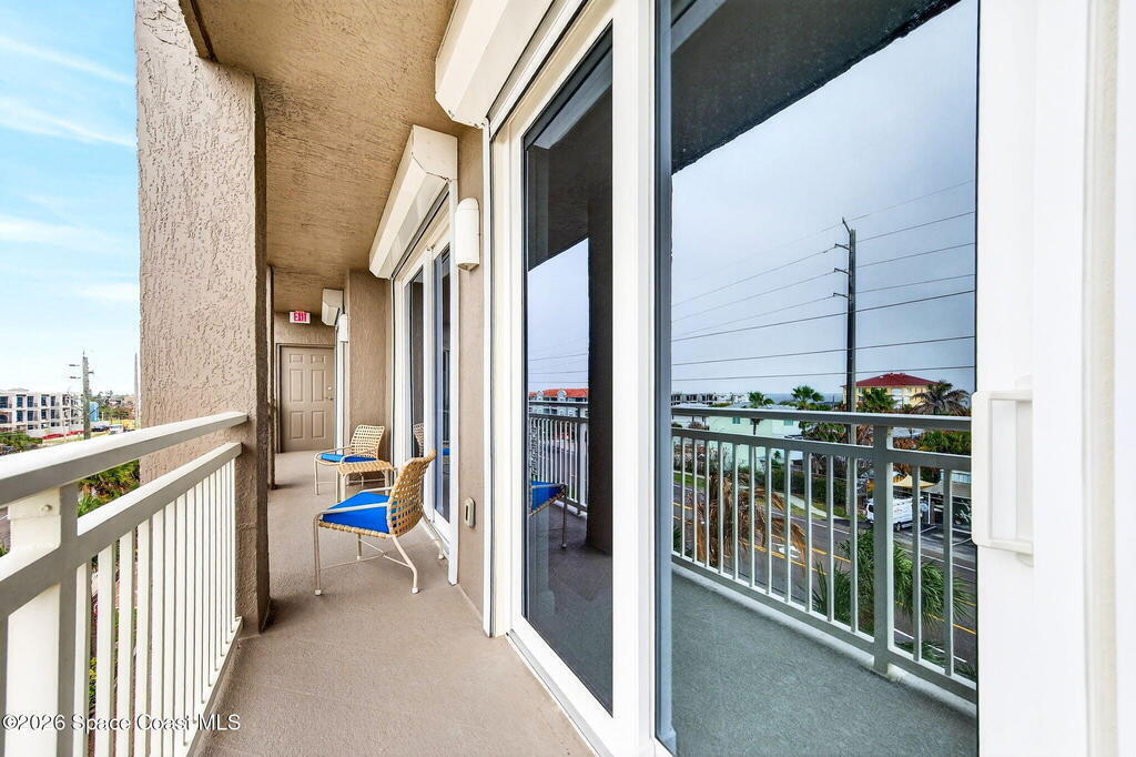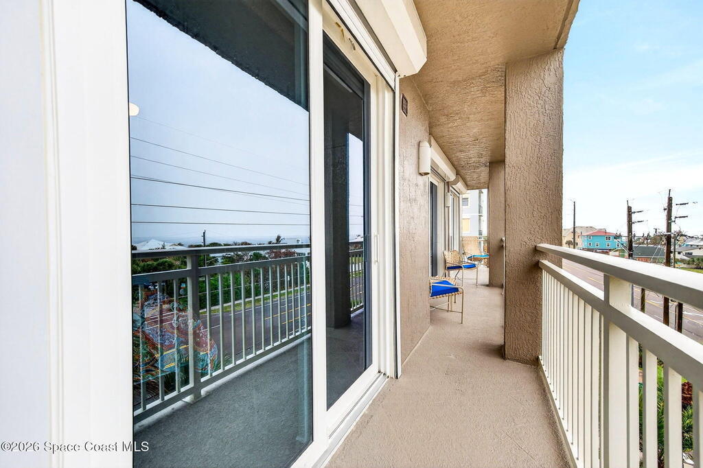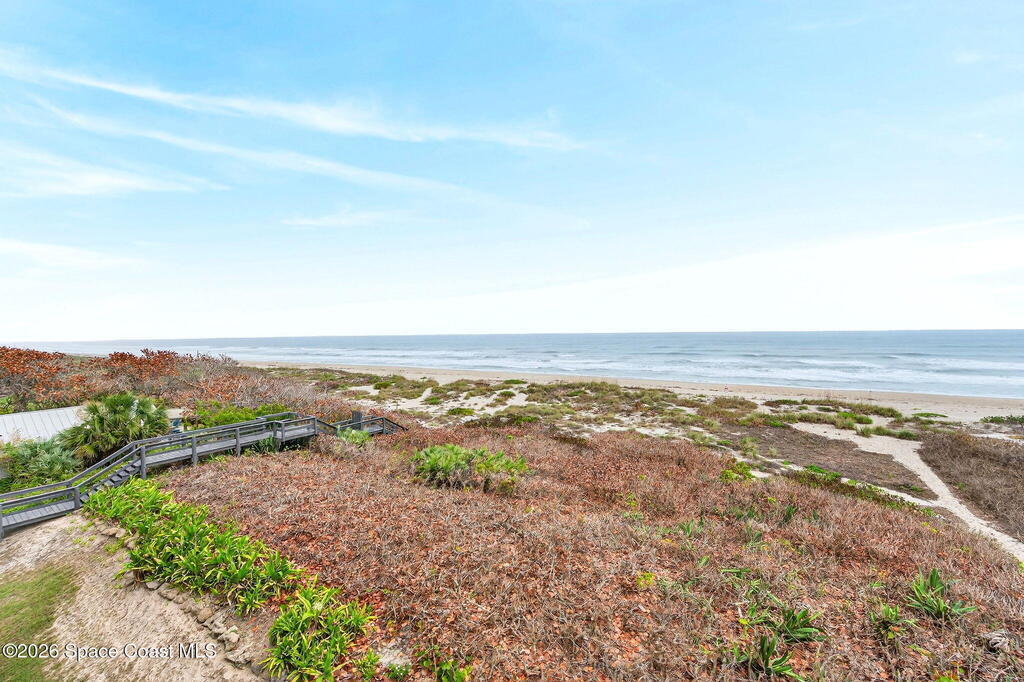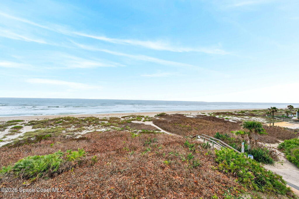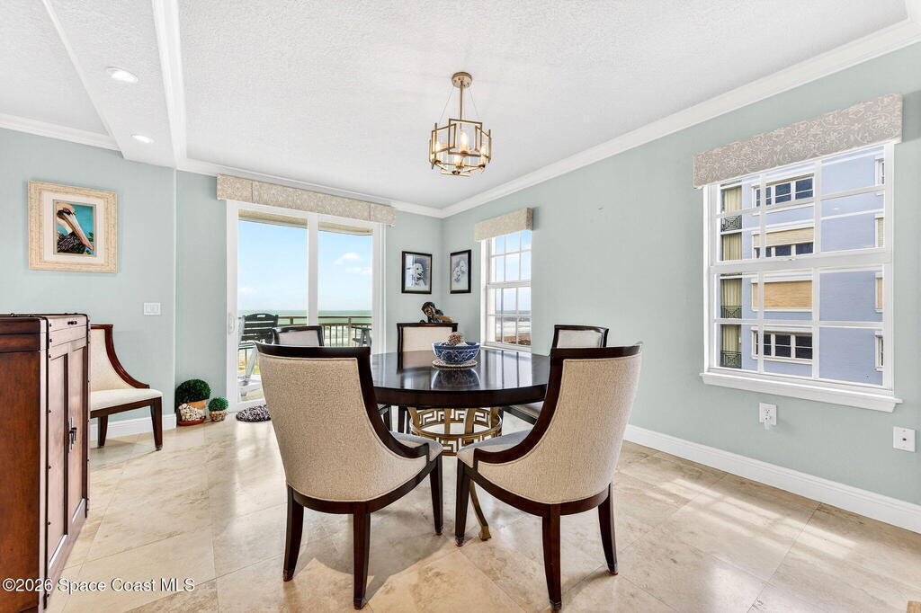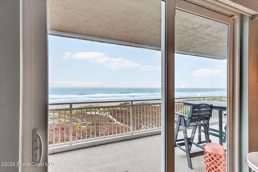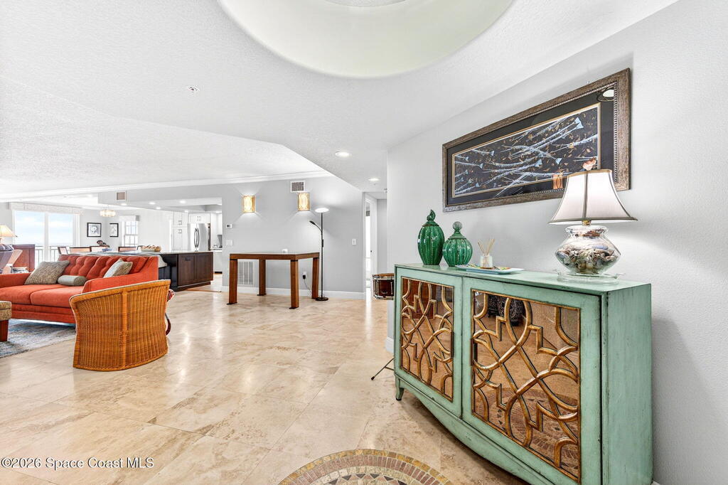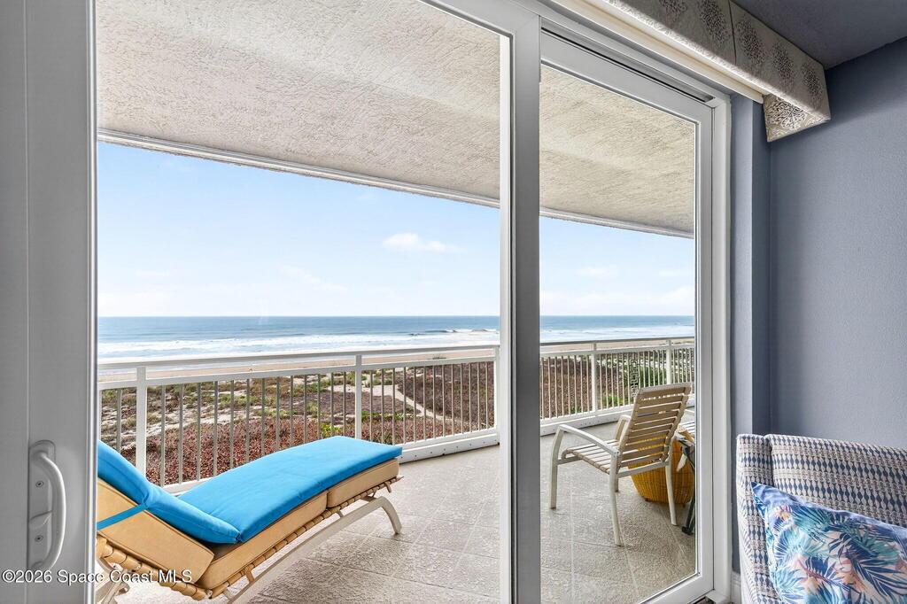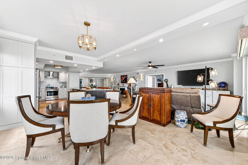 Discover breathtaking ocean and river views from this stunning southeast corner 3-bedroom, 3-bath residence at The Carlyle in South Cocoa Beach. Step directly from the secure elevator into your private vestibule and experience the thoughtful custom details throughout. Flooded with natural light, the spacious open-concept floor plan creates an inviting living environment. The meticulously chef's kitchen features rich wood cabinetry, an oversized island with seating, a gas cooktop with a sleek vent hood, and premium stainless steel appliances. Completely open to the living, dining, and conversation areas, the kitchen offers sweeping views of the ocean and centers around a cozy fireplace.New impact sliding glass doors beautifully frame the picturesque scenery of the ocean and river, while full home shutters provide added peace of mind. Enjoy morning coffee on the east balcony as the sun rises over the Atlantic, and unwind on the west balcony with spectacular sunset views over the river.