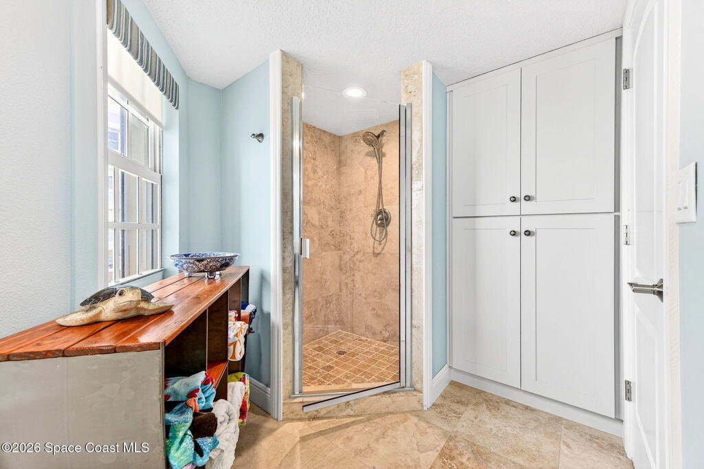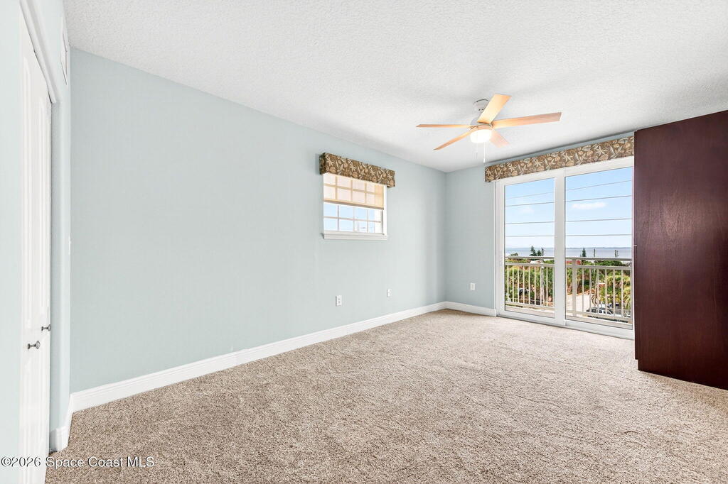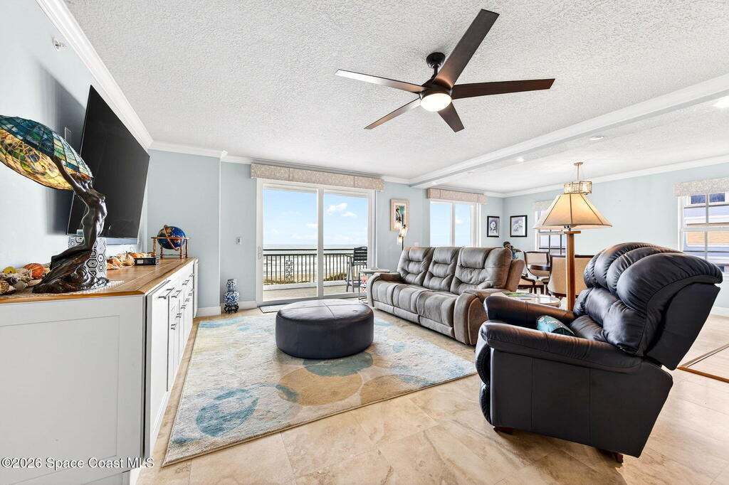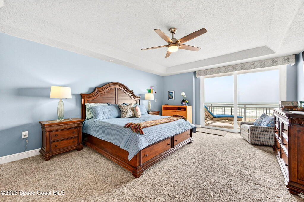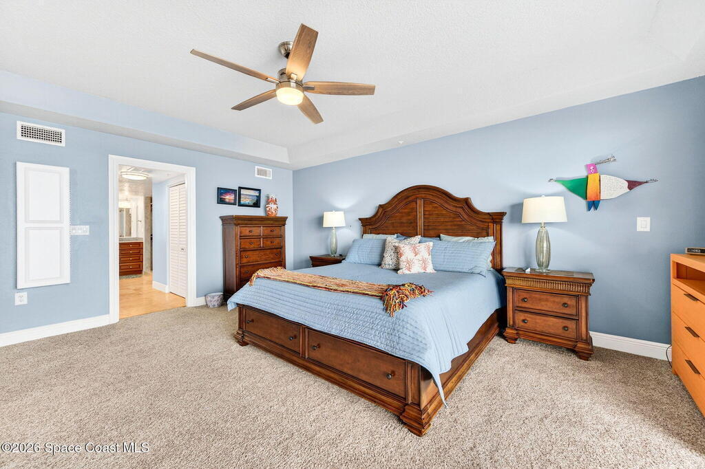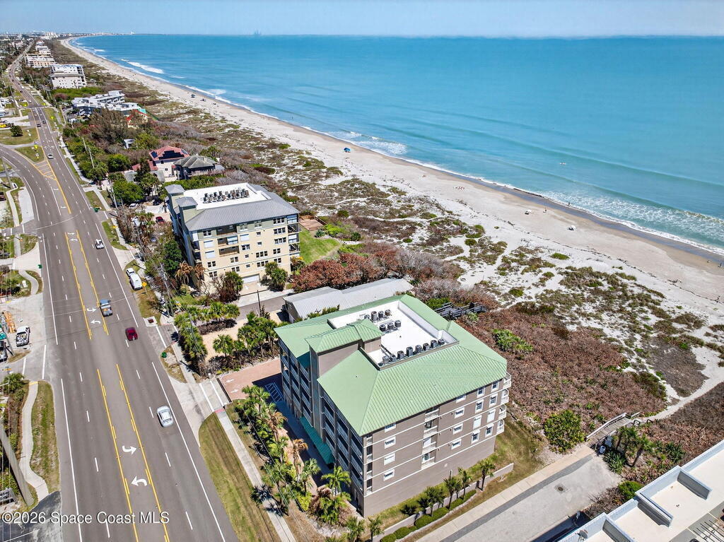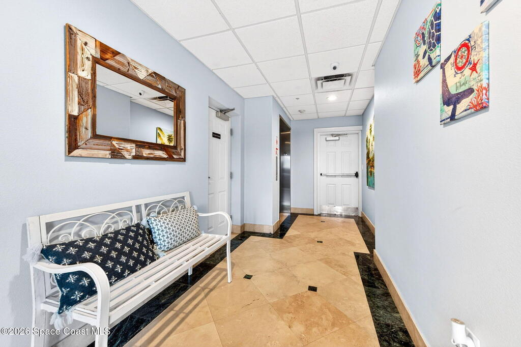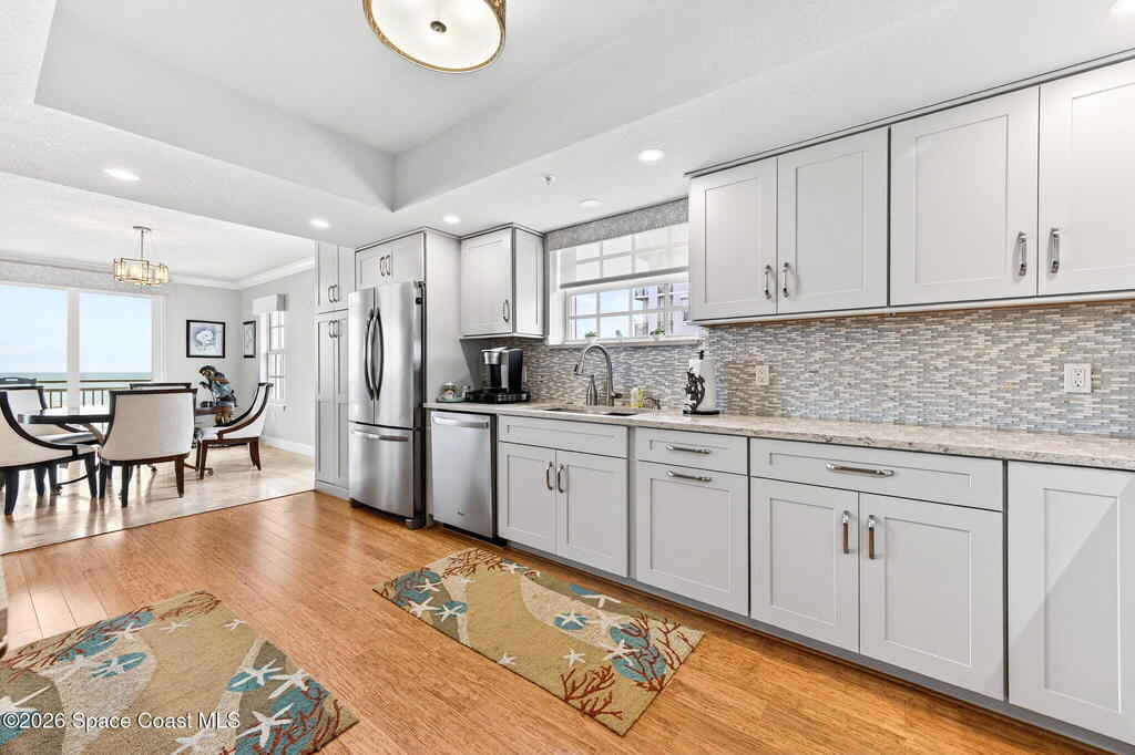 Discover breathtaking ocean and river views from this stunning southeast corner 3-bedroom, 3-bath residence at The Carlyle in South Cocoa Beach. Step directly from the secure elevator into your private vestibule and experience the thoughtful custom details throughout. Flooded with natural light, the spacious open-concept floor plan creates an inviting living environment. The meticulously chef's kitchen features rich wood cabinetry, an oversized island with seating, a gas cooktop with a sleek vent hood, and premium stainless steel appliances. Completely open to the living, dining, and conversation areas, the kitchen offers sweeping views of the ocean and centers around a cozy fireplace.New impact sliding glass doors beautifully frame the picturesque scenery of the ocean and river, while full home shutters provide added peace of mind. Enjoy morning coffee on the east balcony as the sun rises over the Atlantic, and unwind on the west balcony with spectacular sunset views over the river.