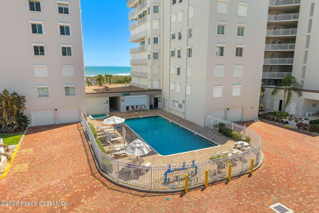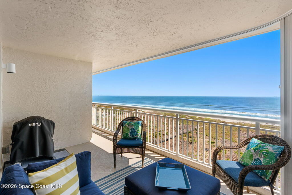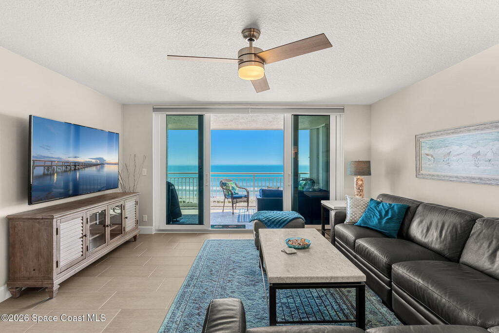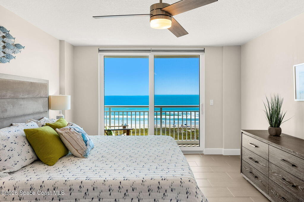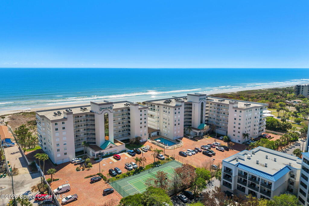 Accepting Backup Offers. This meticulously maintained and fully furnished three-bedroom, two-bath unit at Emerald Seas offers direct ocean views from the living room, primary bedroom, and kitchen. Notable features include recently installed turtle glass sliding doors, storm shutters, and a dedicated laundry room equipped with washer and dryer. The contemporary open kitchen is complemented by custom cabinetry providing enhanced storage. The layout includes a spacious guest bedroom and a third bedroom configured as an office. Community amenities comprise gated oceanfront access, a heated pool and hot tub, fitness center, tennis and pickleball courts, secure underground garage parking, and additional storage. Ideally located in Cocoa Beach, this property is minutes from local attractions such as the Cocoa Beach Pier and Ron Jon Surf Shop, ten minutes from Port Canaveral, and less than one hour from Orlando. This exceptional unit combines comfort with convenient beachside living