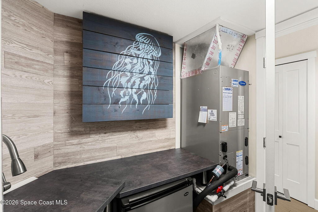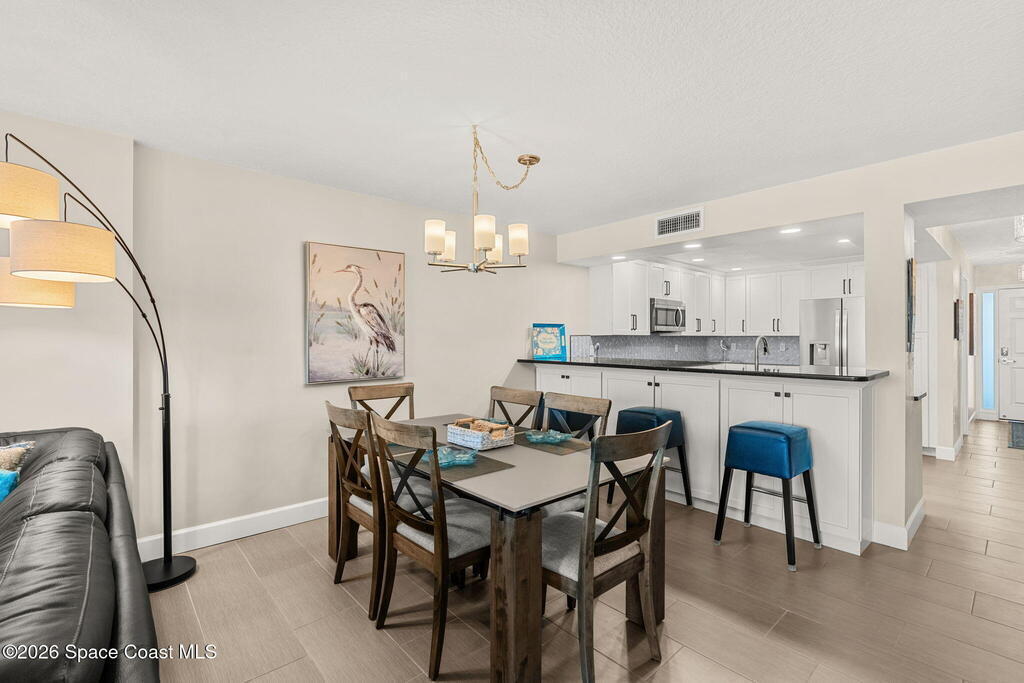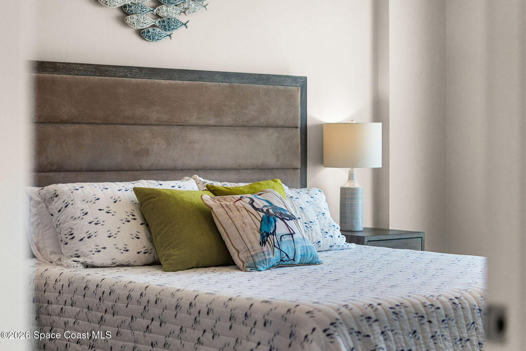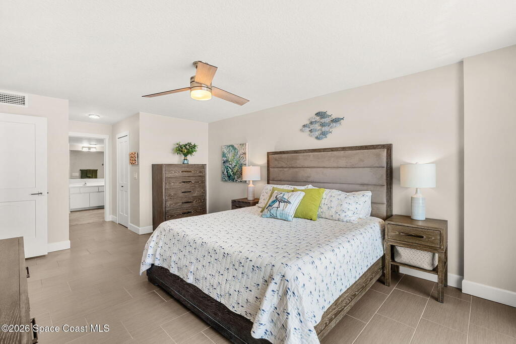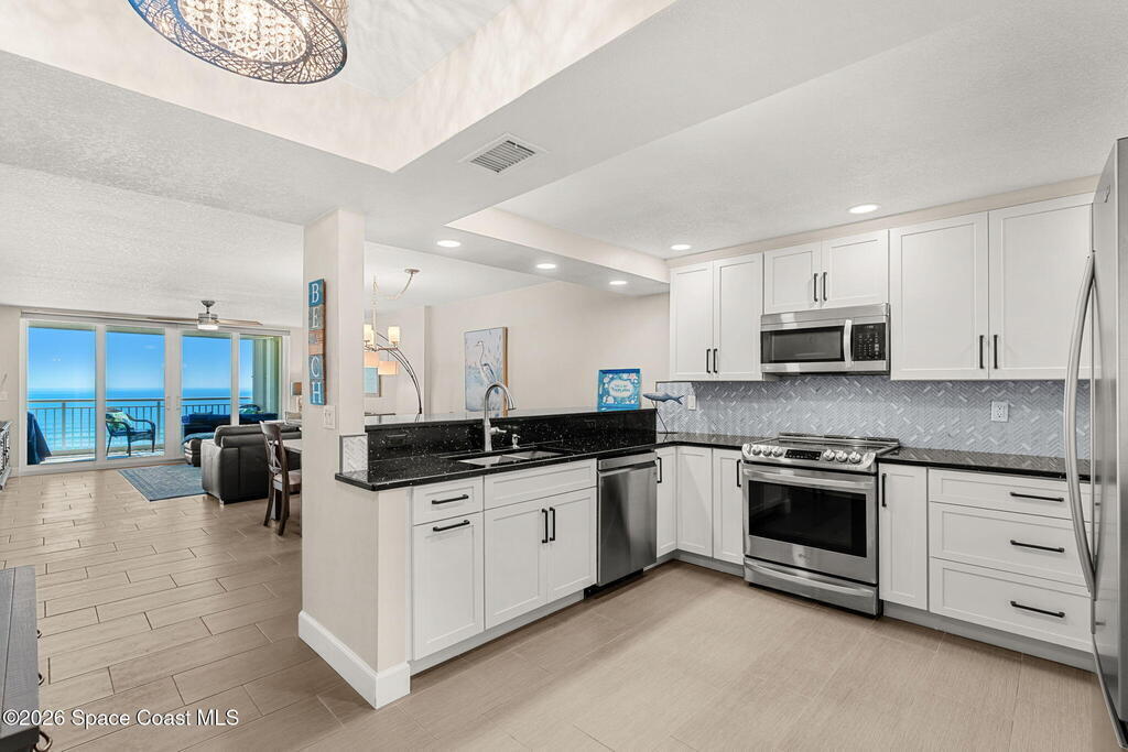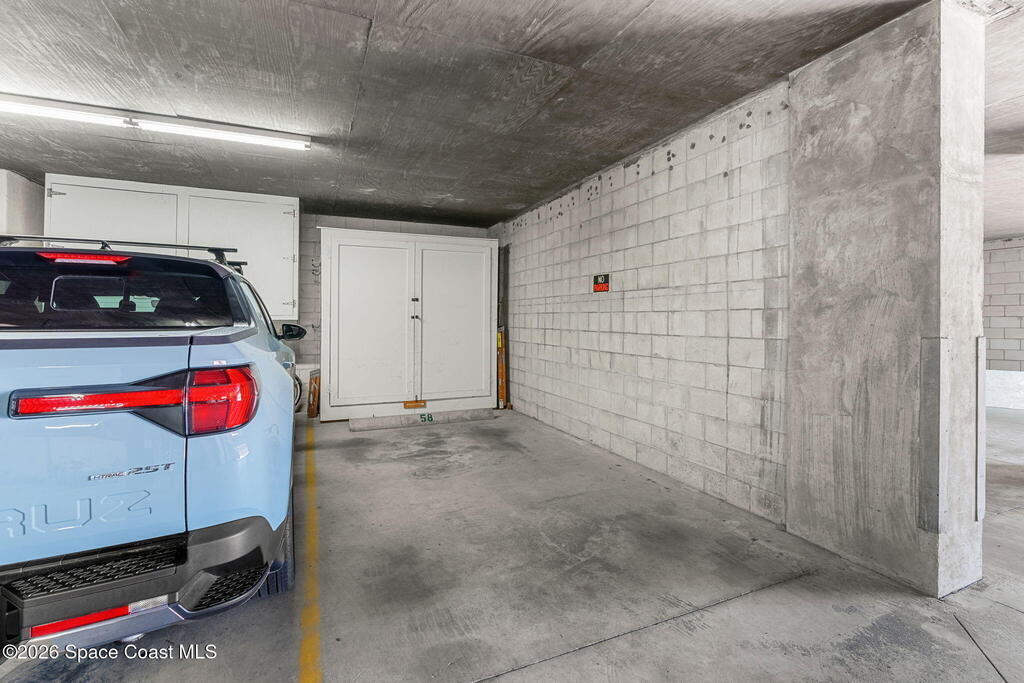 Accepting Backup Offers. This meticulously maintained and fully furnished three-bedroom, two-bath unit at Emerald Seas offers direct ocean views from the living room, primary bedroom, and kitchen. Notable features include recently installed turtle glass sliding doors, storm shutters, and a dedicated laundry room equipped with washer and dryer. The contemporary open kitchen is complemented by custom cabinetry providing enhanced storage. The layout includes a spacious guest bedroom and a third bedroom configured as an office. Community amenities comprise gated oceanfront access, a heated pool and hot tub, fitness center, tennis and pickleball courts, secure underground garage parking, and additional storage. Ideally located in Cocoa Beach, this property is minutes from local attractions such as the Cocoa Beach Pier and Ron Jon Surf Shop, ten minutes from Port Canaveral, and less than one hour from Orlando. This exceptional unit combines comfort with convenient beachside living