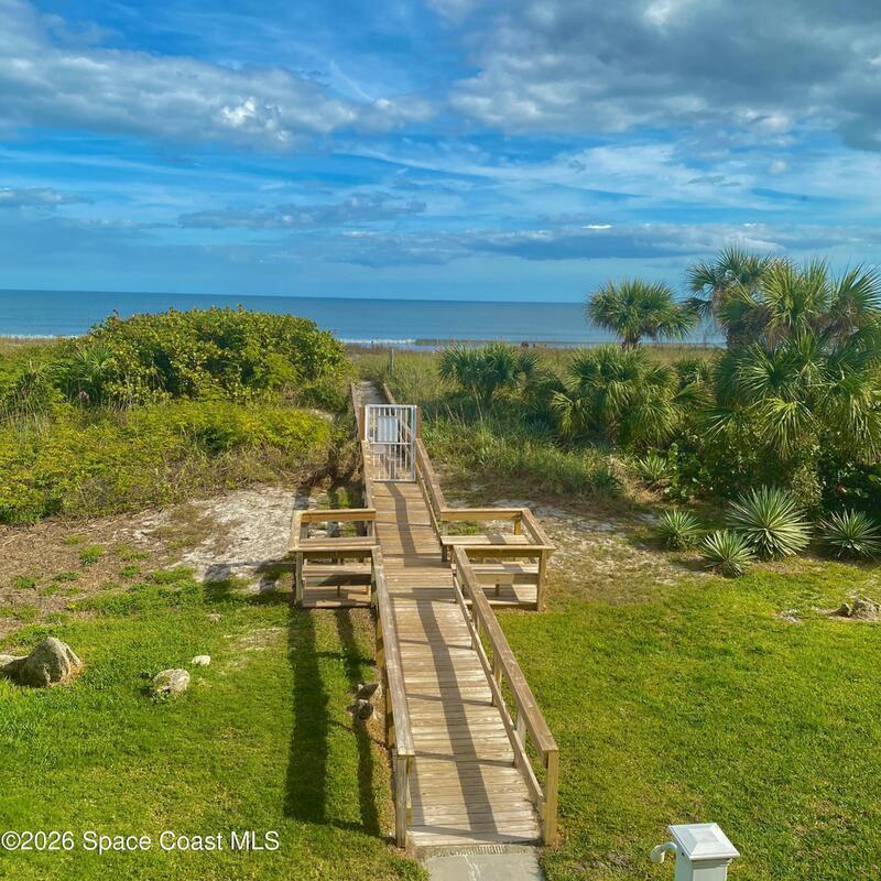 Steps to the Sand - Cocoa Beach Living Made Easy. Live where others vacation in this updated 1-bedroom, 1-bath condo at Dolphin Beach Condos, perfectly located just seconds from the beach in the heart of Cocoa Beach. This mostly furnished unit makes moving in effortless, featuring a full kitchen with stainless steel appliances, essential cookware, a bed, and a pull-out sofa to get you started right away. Enjoy a private balcony with a peek-a-boo view of the Atlantic, along with easy-to-maintain wood-look tile flooring throughout--perfect for sandy beach days. Additional highlights include reserved parking, secured laundry access, and direct beach entry, plus unbeatable rocket launch views right from the property. Conveniently located near Ron Jon Surf Shop, local restaurants, and public transportation, everything you need is within reach.