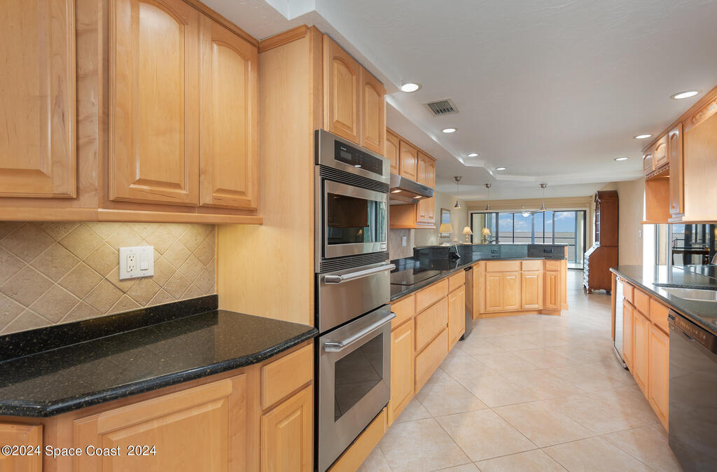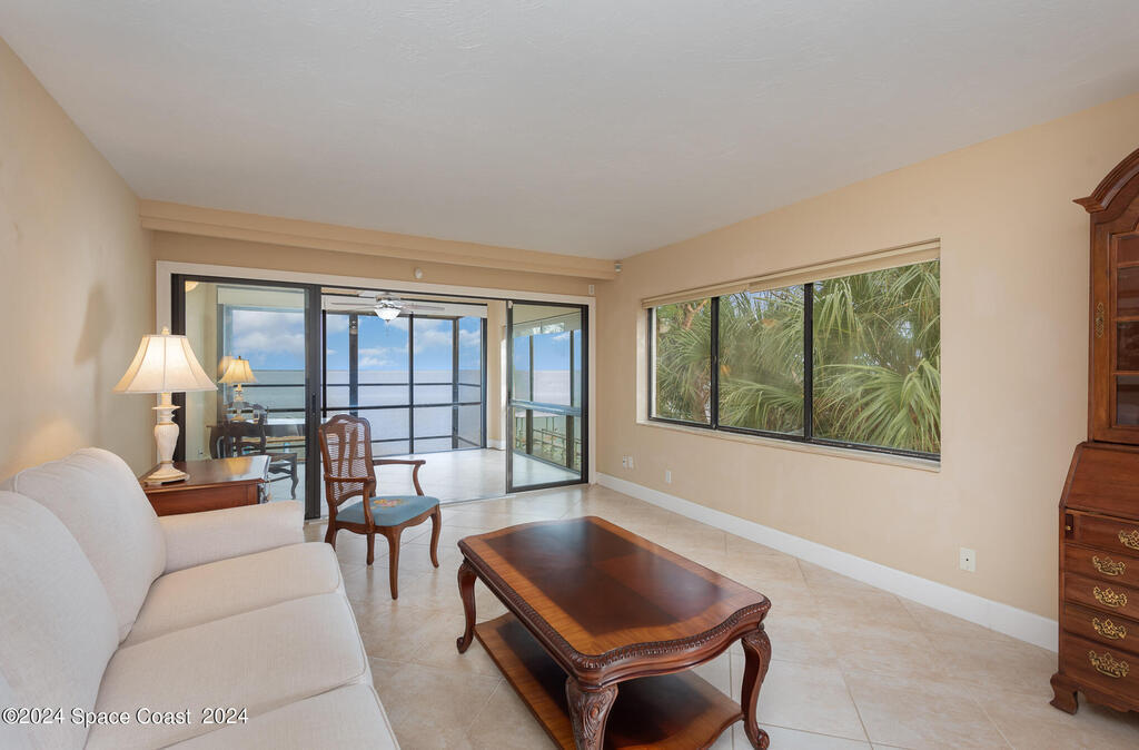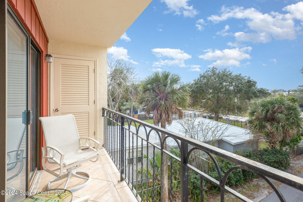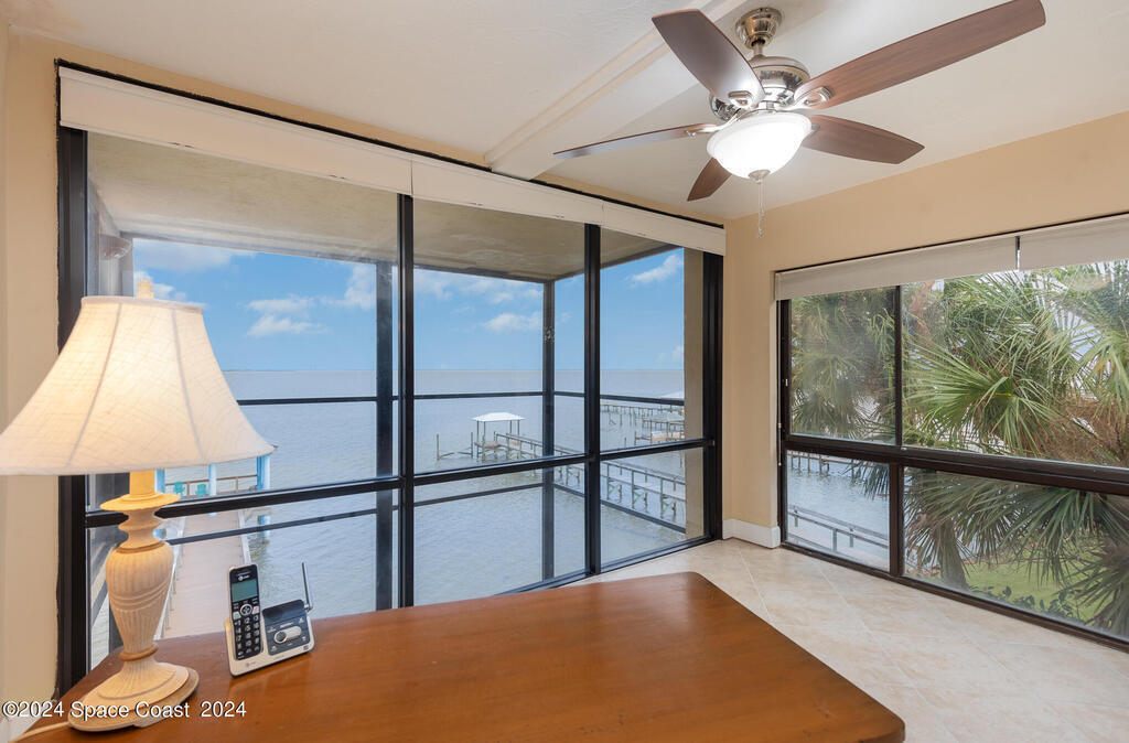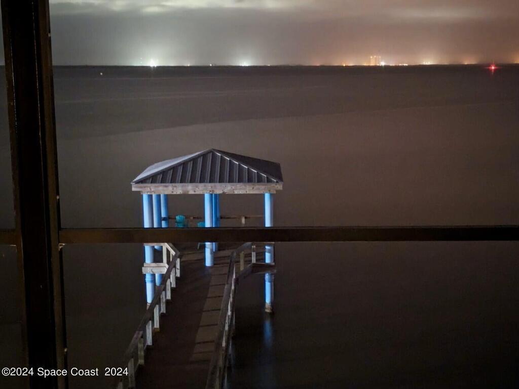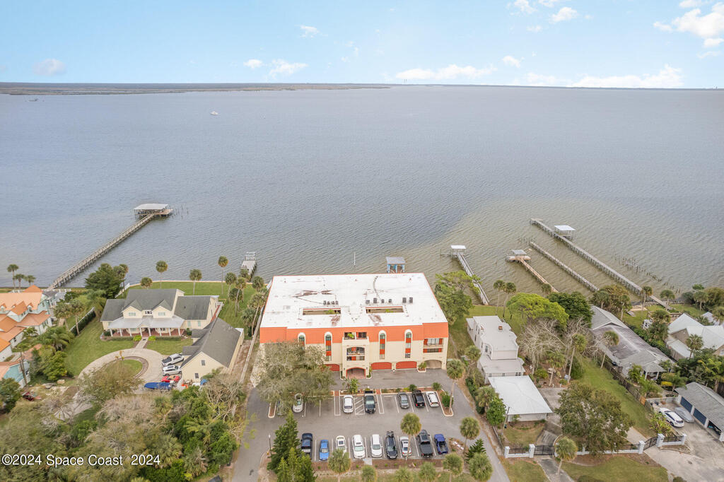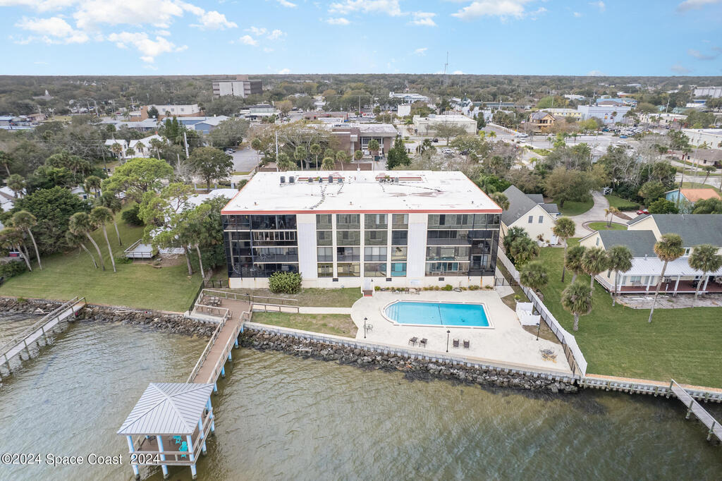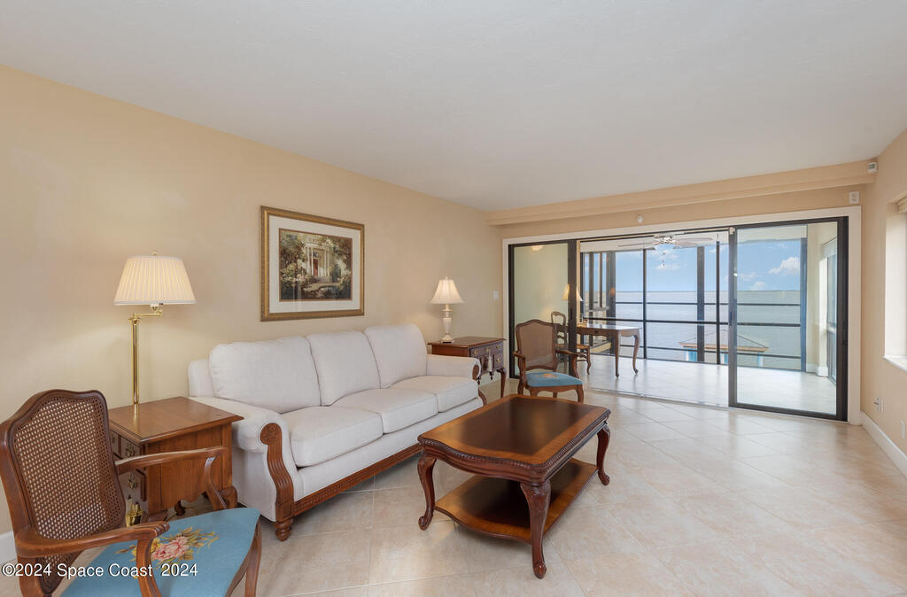 Enjoy breathtaking views of the Intracoastal waterway, rocket launches and gorgeous sunrises from this beautifully updated 2 Bedroom,2 Bath South End Unit. New roof 2024. The spacious living area has been designed with attention to detail. 18-inch tile set on a diagonal throughout. Sound proofing has been achieved with cork board underlayment. The kitchen features Maple cabinetry, pull out drawers & granite counter tops with breakfast bar. Appliances include a 5 burner Thermador cook top and stainless convection oven, microwave, refrigerator, dishwasher, wine cooler and undercounter refrigerator. Primary bedroom includes a cedar lined walk-in closet. Both baths have been updated and feature tiled walk-in showers. Assigned underground parking is included. Enjoy the swimming pool and fishing dock with friends and family while overlooking the Indian River. Walking distance to Historic Downtown Titusville.