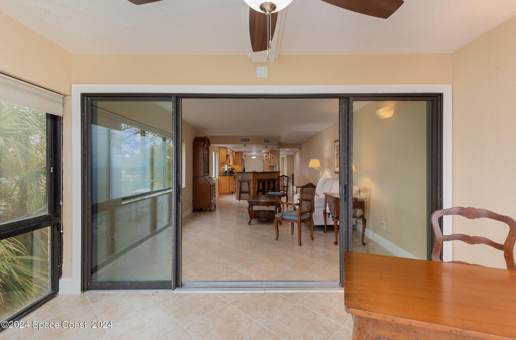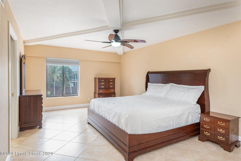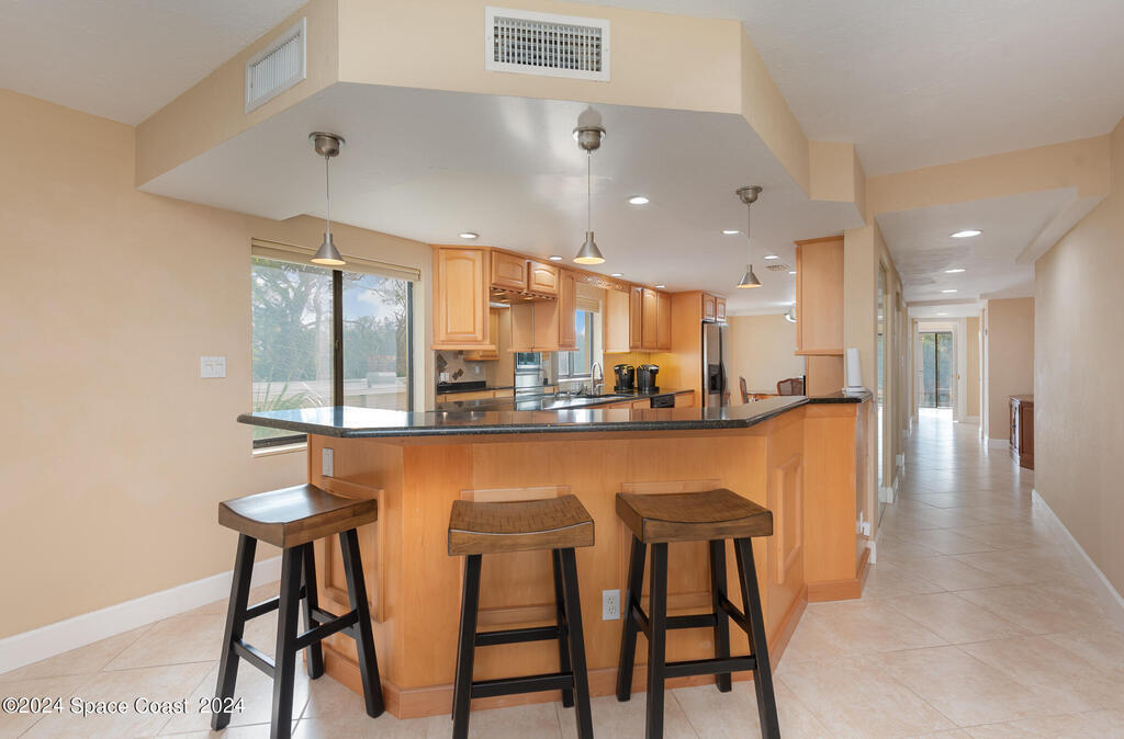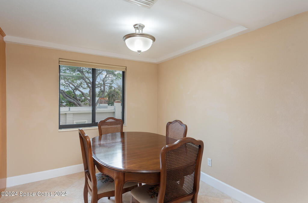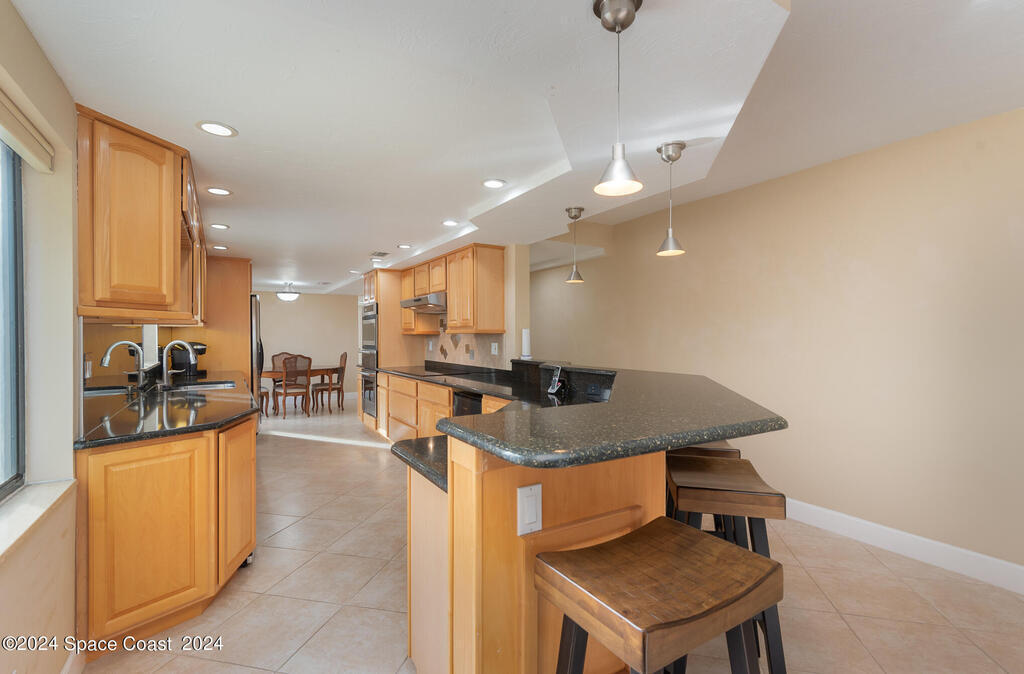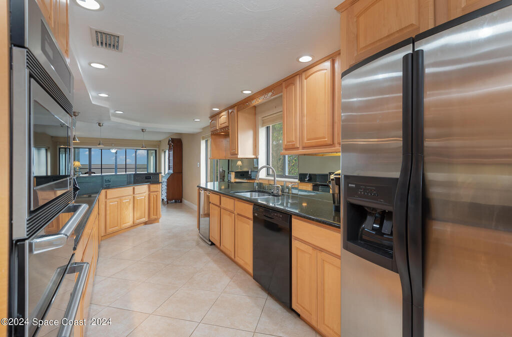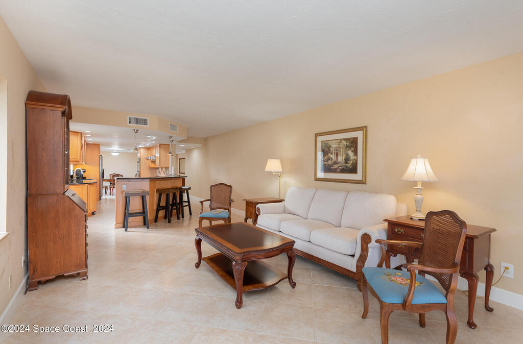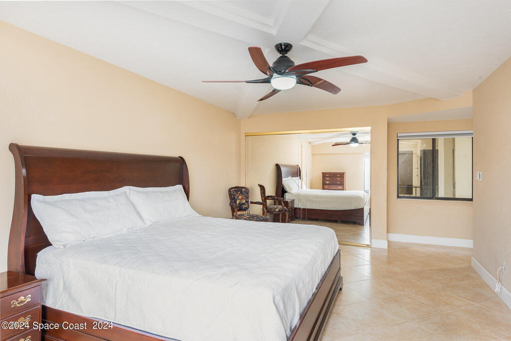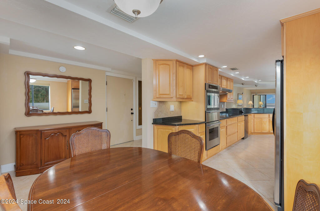 Enjoy breathtaking views of the Intracoastal waterway, rocket launches and gorgeous sunrises from this beautifully updated 2 Bedroom,2 Bath South End Unit. New roof 2024. The spacious living area has been designed with attention to detail. 18-inch tile set on a diagonal throughout. Sound proofing has been achieved with cork board underlayment. The kitchen features Maple cabinetry, pull out drawers & granite counter tops with breakfast bar. Appliances include a 5 burner Thermador cook top and stainless convection oven, microwave, refrigerator, dishwasher, wine cooler and undercounter refrigerator. Primary bedroom includes a cedar lined walk-in closet. Both baths have been updated and feature tiled walk-in showers. Assigned underground parking is included. Enjoy the swimming pool and fishing dock with friends and family while overlooking the Indian River. Walking distance to Historic Downtown Titusville.