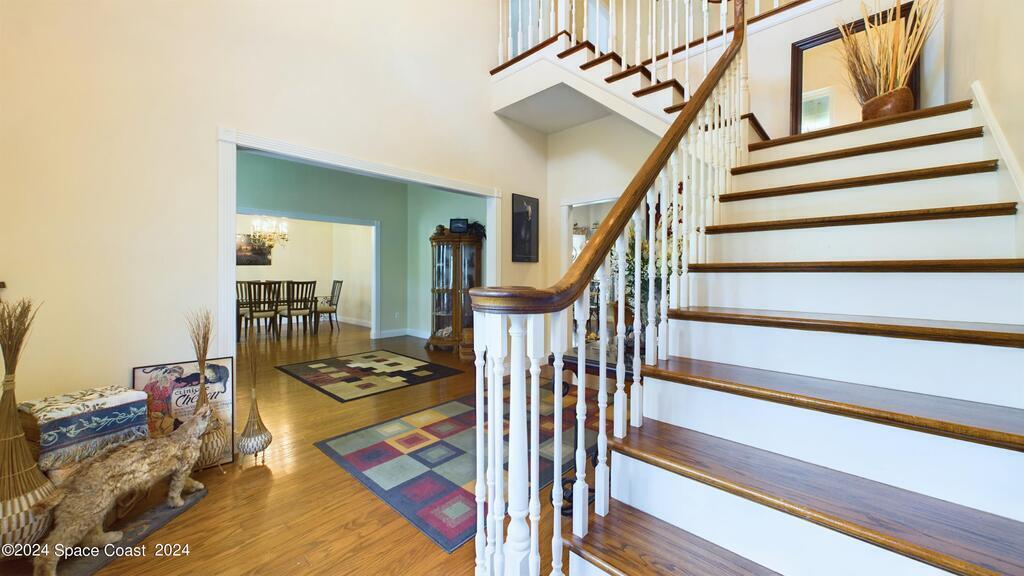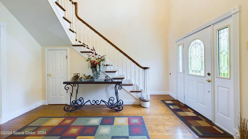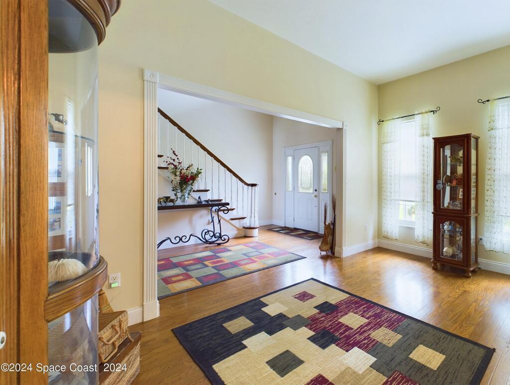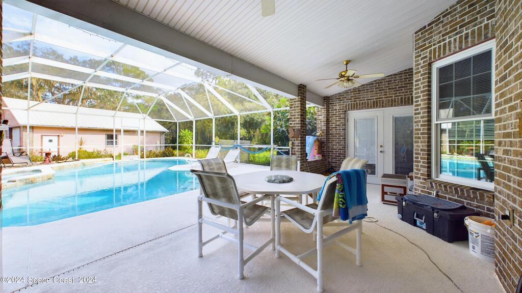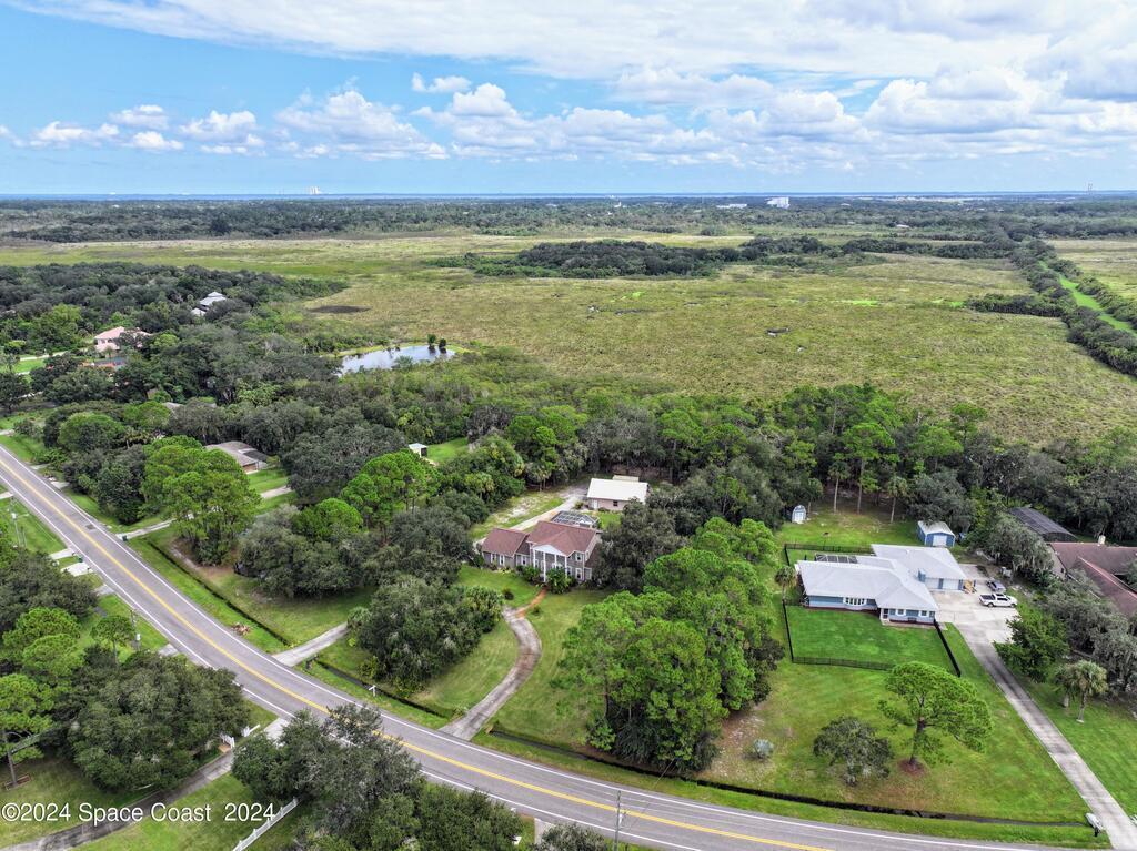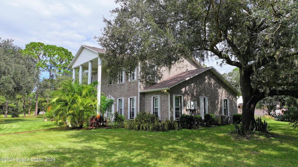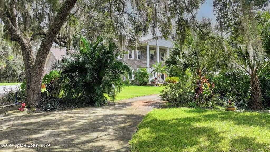 This stunning Brick Colonial-style home sits on 2.15 private wooded acres in the exclusive Windover neighborhood, featuring 4 bedrooms, 2.5 baths, and real wood floors throughout. Enjoy the sunken family room with a cozy fireplace, and a luxurious master suite with an adjacent study/den, and a master bath offering his and hers closets. The remodeled eat-in kitchen boasts a large island, pantry, and all appliances included. Additional highlights include a formal dining room, formal living room, and a dedicated laundry room, & central vacuum.Outside, relax by the screened-in pool or take advantage of the expansive 1200 sq. ft. detached garage/workshop, complete with 220 electric, a loft, and a half bath, ideal for boats, RVs, or a 5th wheel. The circular and concrete driveways offer ample parking. Enjoy Windover Park, and proximity to the Kennedy Space Center, Canaveral National Seashore, and Cocoa Beach. No flood zone, city water, sprinkler system, and a new roof (2023). Easy to show