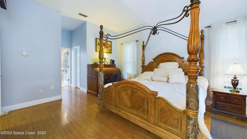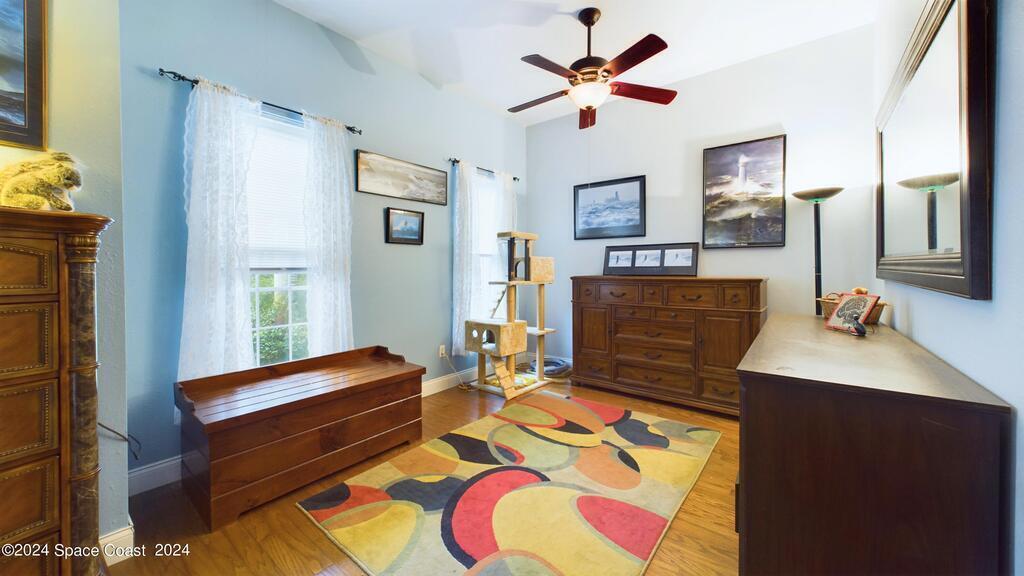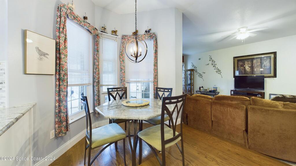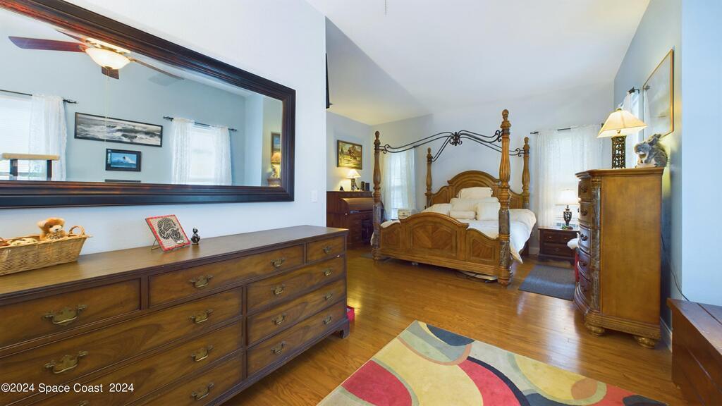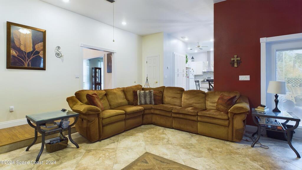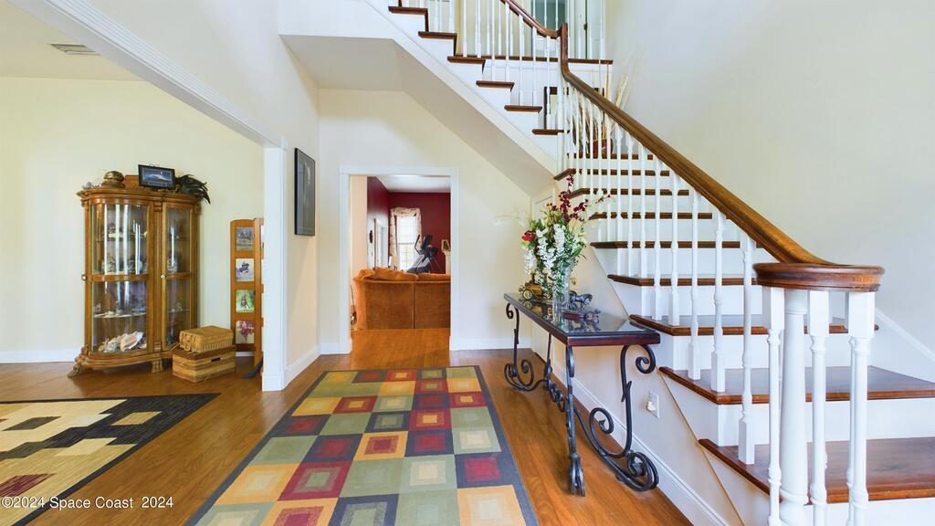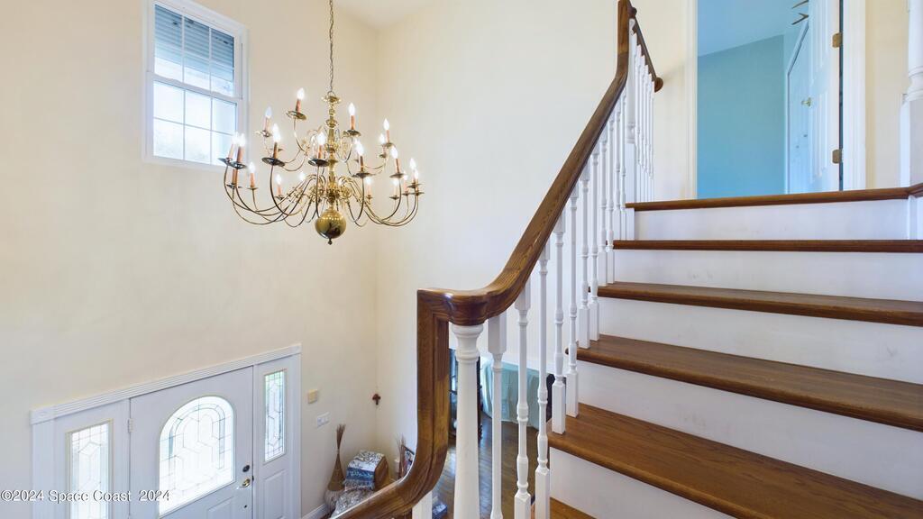 This stunning Brick Colonial-style home sits on 2.15 private wooded acres in the exclusive Windover neighborhood, featuring 4 bedrooms, 2.5 baths, and real wood floors throughout. Enjoy the sunken family room with a cozy fireplace, and a luxurious master suite with an adjacent study/den, and a master bath offering his and hers closets. The remodeled eat-in kitchen boasts a large island, pantry, and all appliances included. Additional highlights include a formal dining room, formal living room, and a dedicated laundry room, & central vacuum.Outside, relax by the screened-in pool or take advantage of the expansive 1200 sq. ft. detached garage/workshop, complete with 220 electric, a loft, and a half bath, ideal for boats, RVs, or a 5th wheel. The circular and concrete driveways offer ample parking. Enjoy Windover Park, and proximity to the Kennedy Space Center, Canaveral National Seashore, and Cocoa Beach. No flood zone, city water, sprinkler system, and a new roof (2023). Easy to show