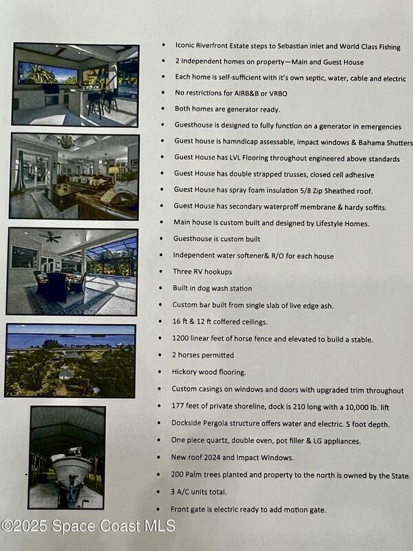 Two fully self functioning Riverfront homes situated on a stunning resort style 2.17 acres. 177 feet of waterfront on the Indian River and minutes to Sebastian Inlet and world class fishing. Main home features 2807 LSF, 4 bedrooms 3 1/2 baths, 3 car garage and an upstairs bonus room with a balcony. The second home has 1035 LSF, one bedroom, 1 bath, den, and a great room concept. This is perfect for multi generational or even an AIRB&B with no restrictions. Huge Panoramic screened porch offers a separate trussed gazebo, outdoor kitchen, fireplace, and a pool with fountains. The property is fenced and offers 3 RV hookups, boat or RV Storage, outdoor firepit, chicken coops, and a HUGE circular driveway. Extra fill brought in to add stables and bring your 2 horses! ROOF IS NEW and has impact windows throughout.