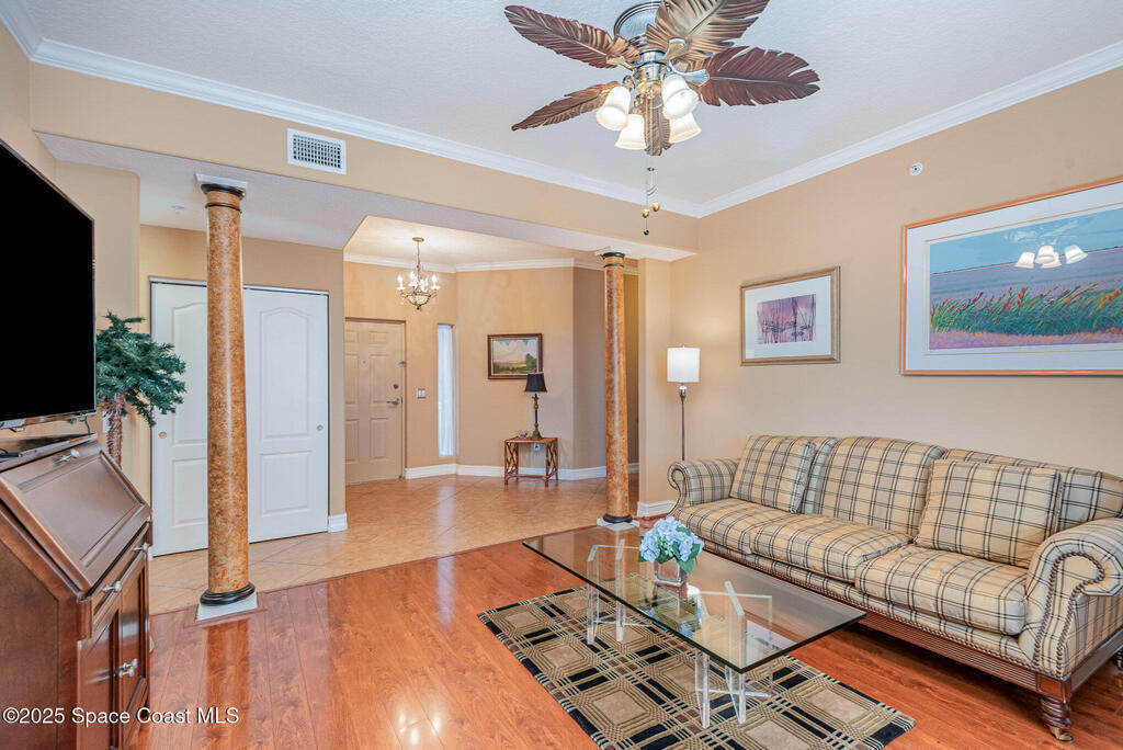 This exceptional unit boasts a spacious wrap-around balcony, perfect for enjoying the gentle breeze and panoramic vistas of the river, wildlife, and lush surroundings. Not to mention the VAB and all of the rocket launches on the beautiful space coast. The oversized primary suite opens directly onto the balcony, allowing for tranquil mornings and peaceful evenings while soaking in the view. A second front bedroom features its own private balcony facing west, ideal for witnessing unforgettable sunsets over the horizon.The community amenities include a riverfront pool, dock, fitness center and recreation room. Whether you're watching rocket launches, observing native wildlife, or simply savoring the quiet beauty of the Indian River, this condo provides a unique opportunity for relaxed, scenic living. Enjoy both comfort and tranquility in this prime location.
