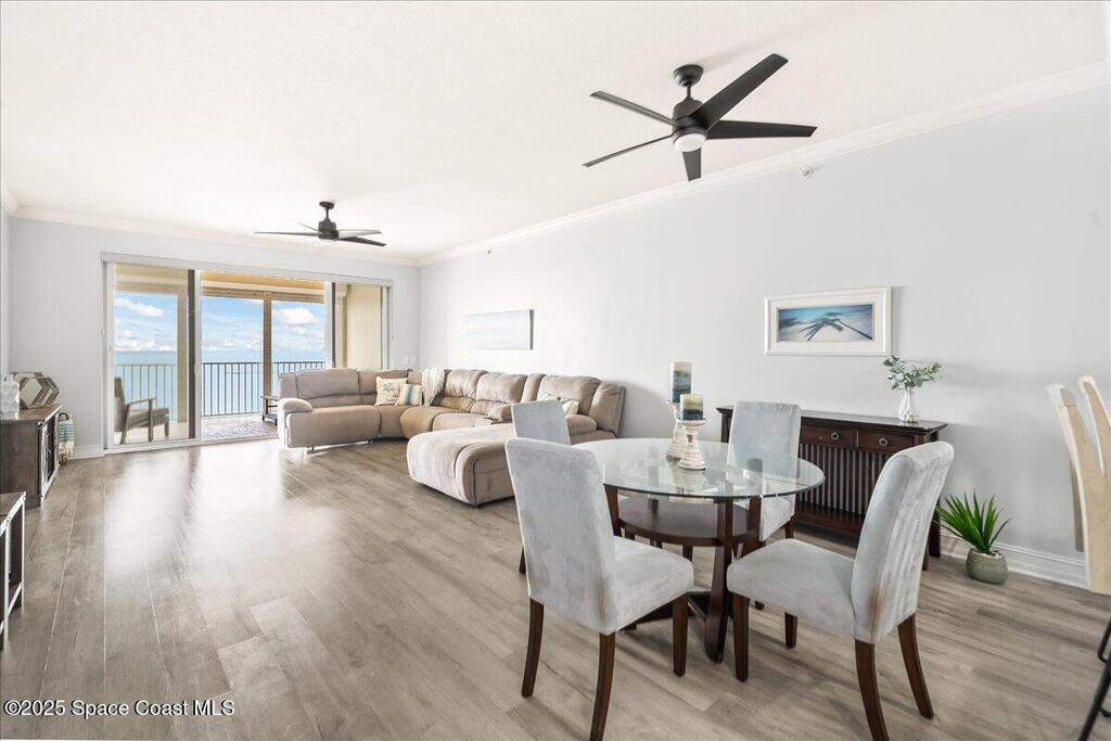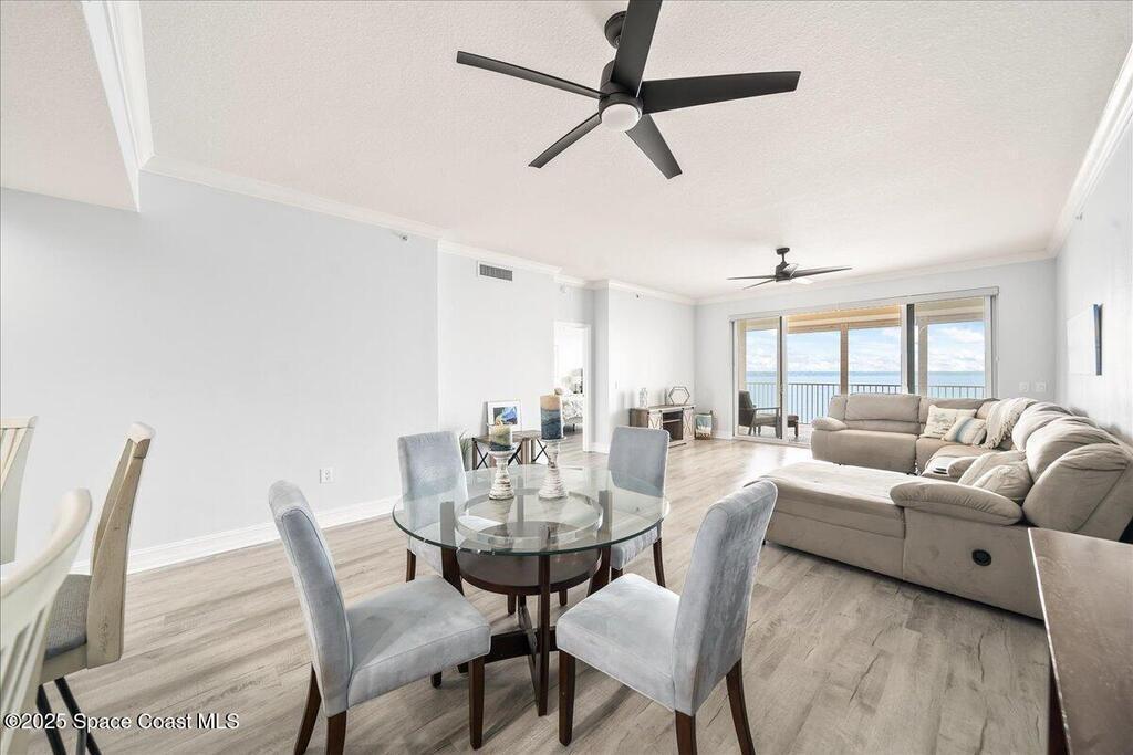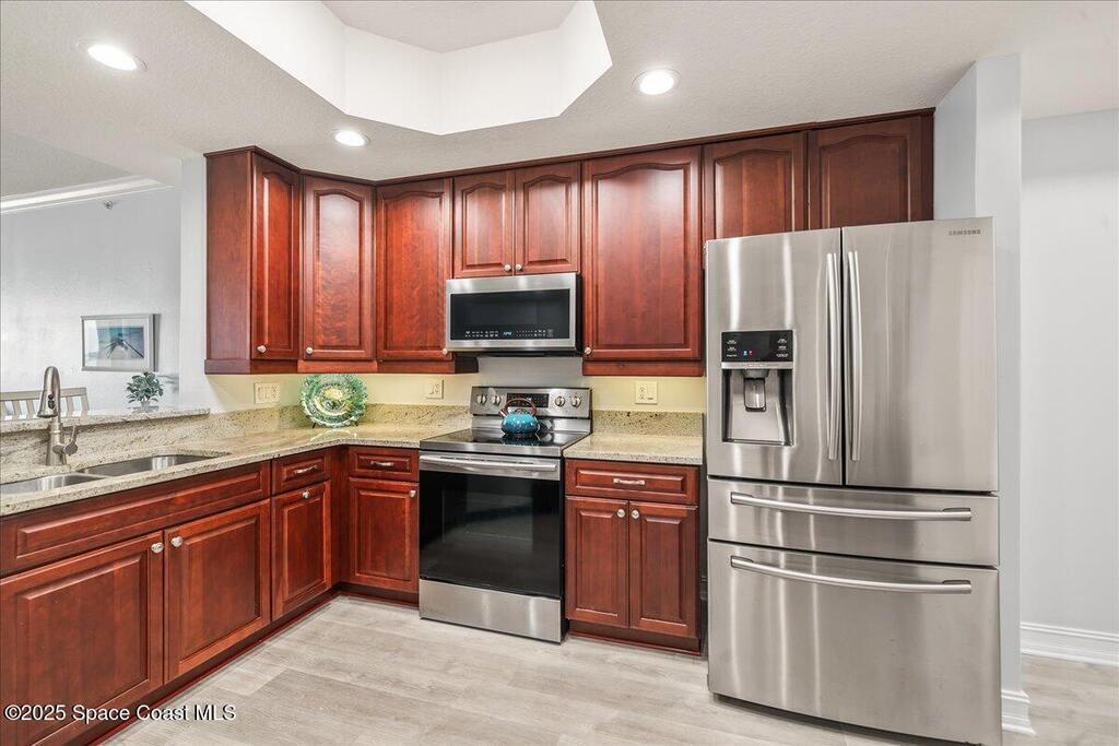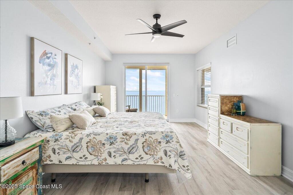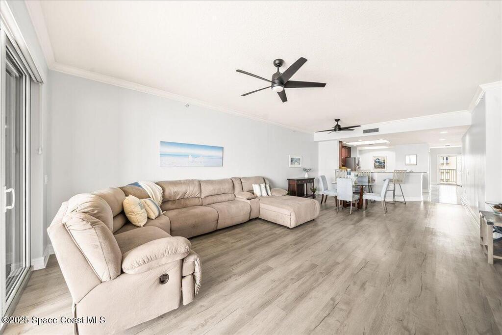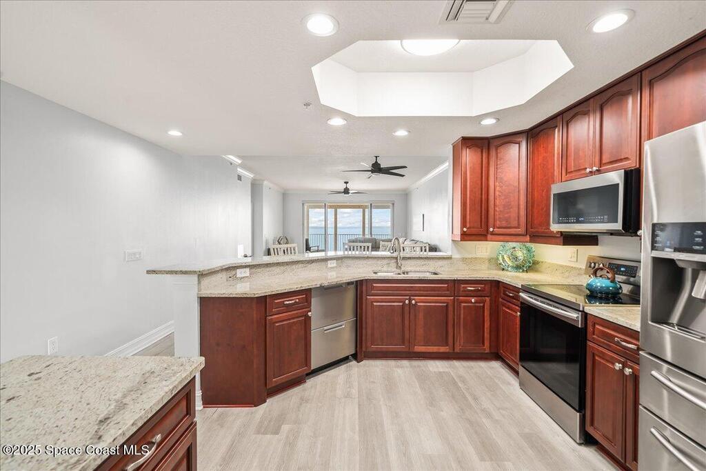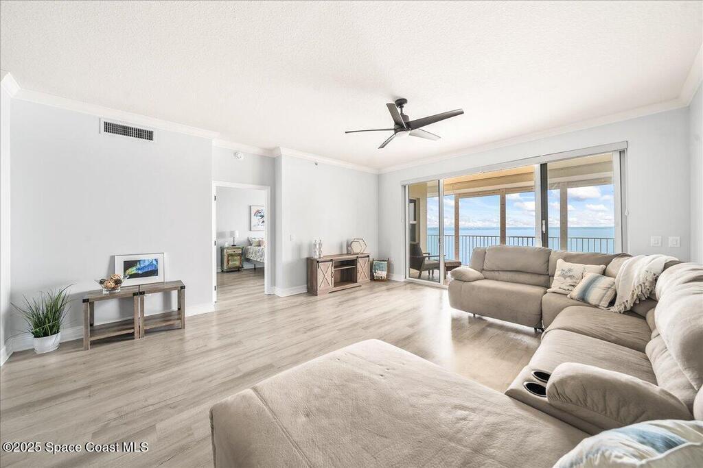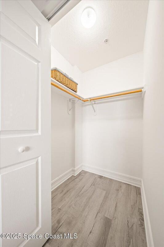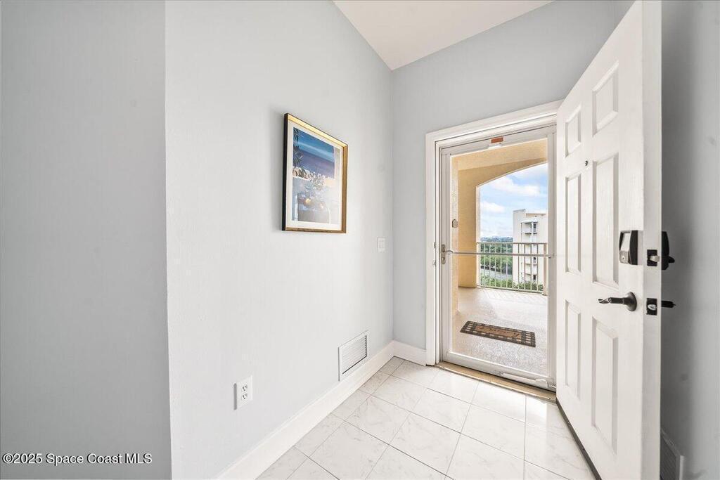 Spectacular penthouse views across the Intracoastal span from sunrise to sunset. Beautifully appointed home incorporates over 2,000 s/f of luxe finishes including neutral LVP flooring throughout, marble-look entry tile, and fresh interior paint. Spacious kitchen features high-end cherry cabinetry with granite counters, task lighting, stainless steel appliance suite and Fisher-Paykel dishwasher drawers. Airy owner's suite opens to covered porch where you can watch dolphin below and space launches above. This is truly paradise! Rich resort-style amenities to pamper yourself including swimming, fitness, sauna, tennis, and more. Stroll the riverfront boardwalk, indulge yourself with the Island Pointe lifestyle. Minutes to shopping, dining and beaches.