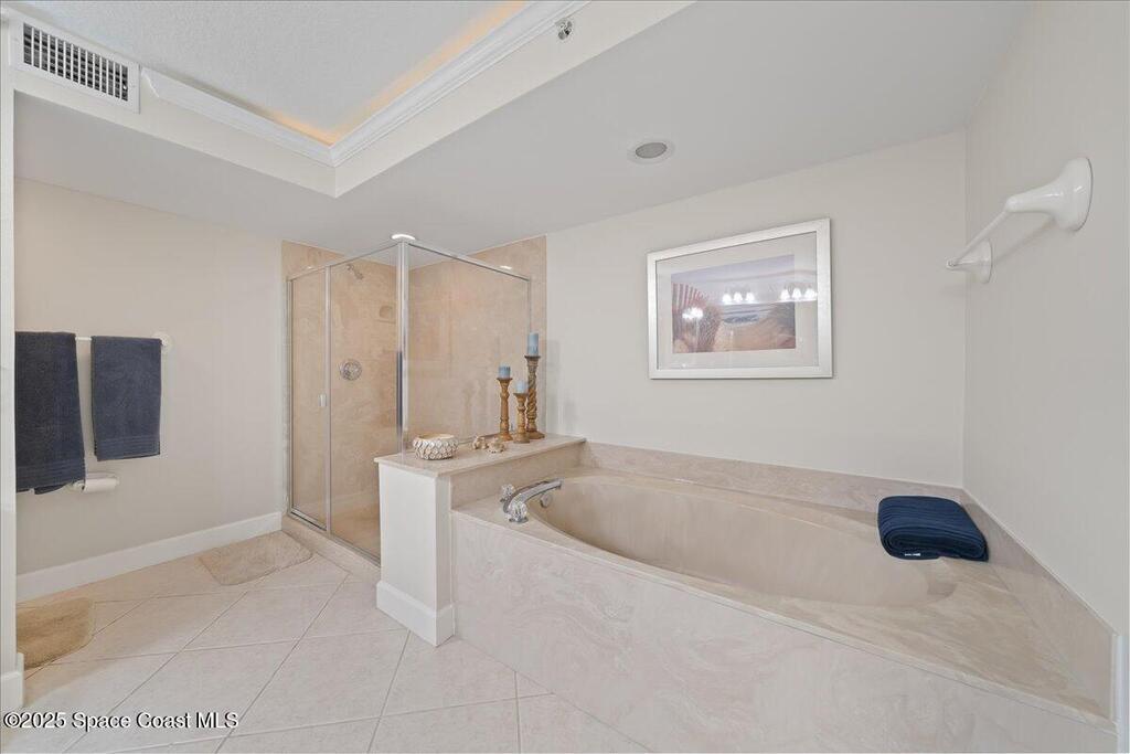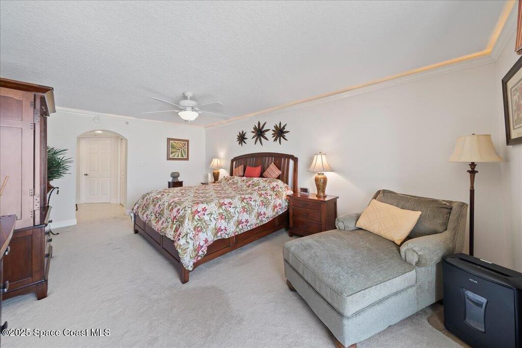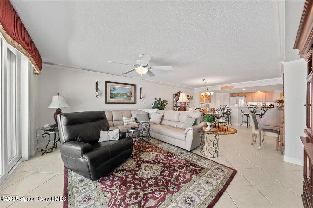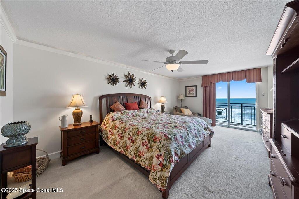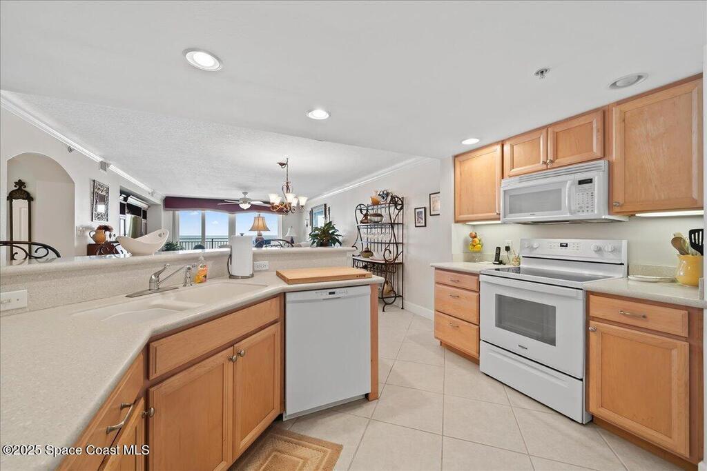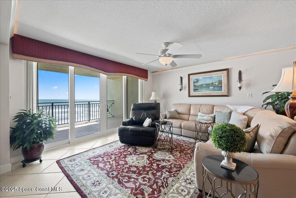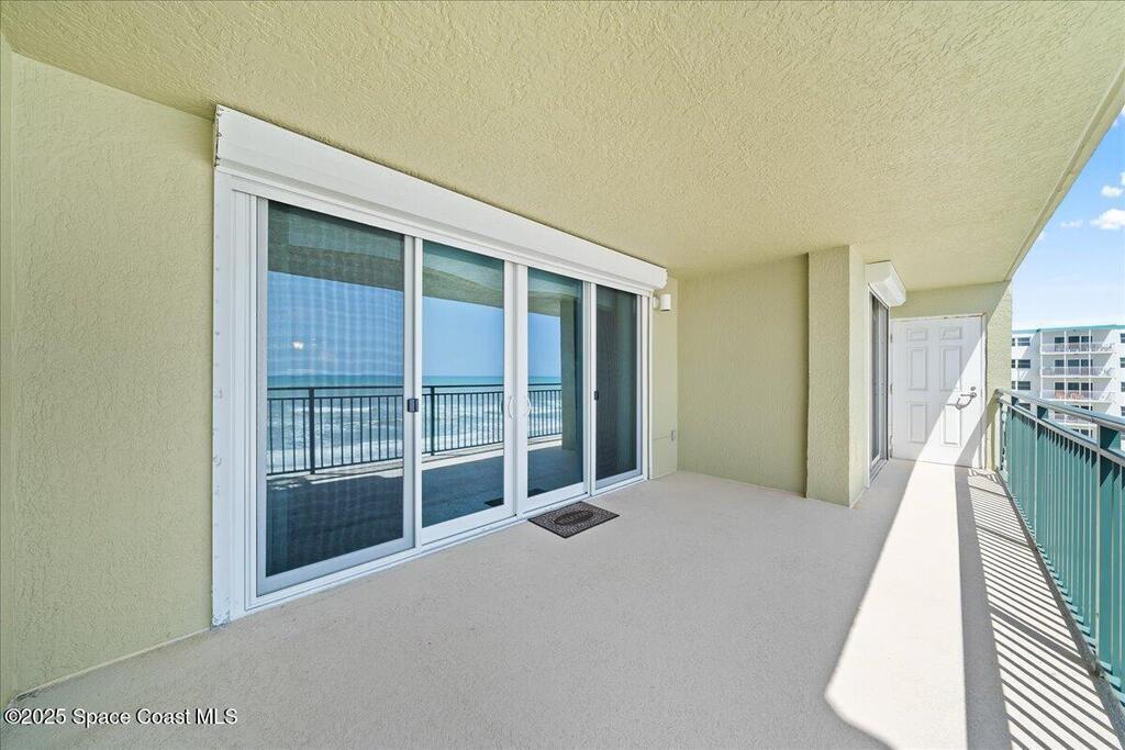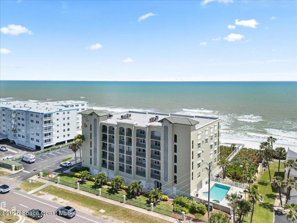 Imagine waking up to the sound of waves crashing and sipping your morning coffee on your private balcony as you watch the sunrise. Nestled along Florida's Space Coast, this coastal retreat offers not only serene beachfront living but also front-row seats to rocket launches from nearby Kennedy Space Center. This meticulously maintained condo features tile flooring throughout (carpet in bedrooms). The open-concept living space is adorned with tasteful coastal decor, creating an inviting atmosphere for relaxation and entertainment. The fully equipped kitchen features new appliances, walk-in pantry, ample counter tops and cabinetry - perfect for preparing meals to enjoy in the dining area or on the balcony as you watch the waves roll in. Master suite offers a walk-in closet, and an en-suite bathroom with a walk-in shower and separate tub providing a private sanctuary. Community amenities include clubhouse, heated pool/spa and private beach access.
