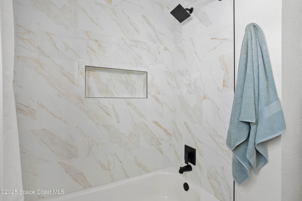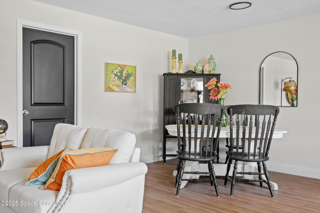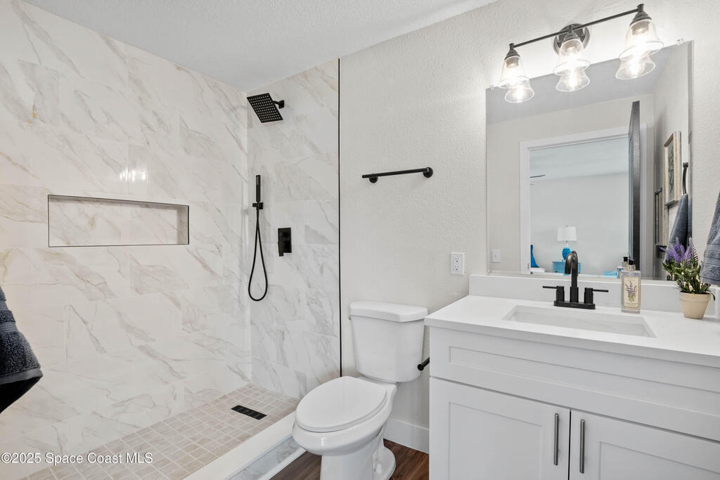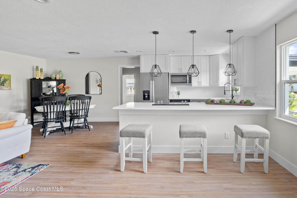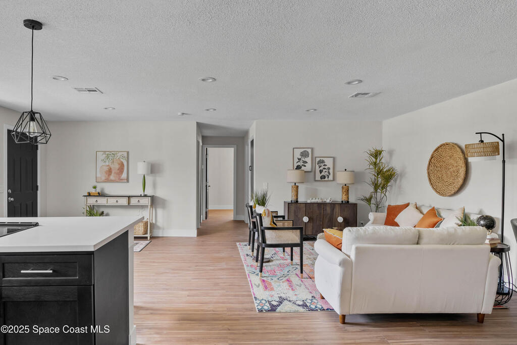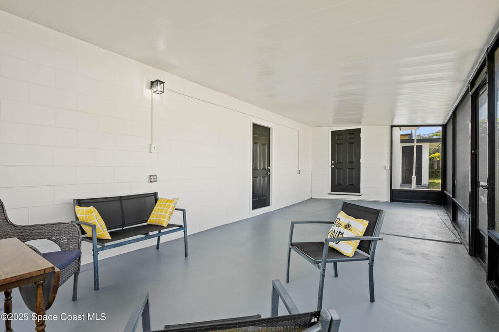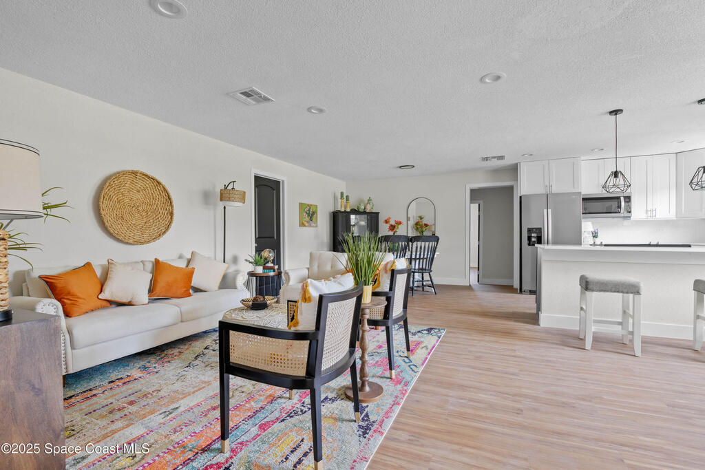 Meticulously Renovated 4 bed 2.5 bath home located just off of US1 across from the Indian River. Spacious open floor plan with luxury vinyl plank flooring throughout. Stunning kitchen with quartz counters, SS appliances and an island range with bar top making it perfect for entertaining. Views from the kitchen expand over the entryway, living and dining areas. Large master suite with walk-in closet. Master ensuite offers a fully tiled shower and quartz counters to compliment the kitchen. Updated guest full guest bath with tile walls, new tub and quartz counters as well. indoor laundry with cabinets and a half bath. All new windows, roof and doors interior/exterior. Recessed lighting and and pendant lighting make this open plan light and bright. Large screened in back completely rescreened to include new screen door and a fenced in yard, built on storage shed with electric and open patio space. 2 car covered carport which owner would convert to a 2 car garage for additional fee.