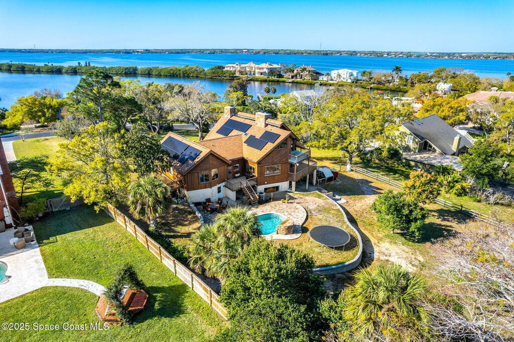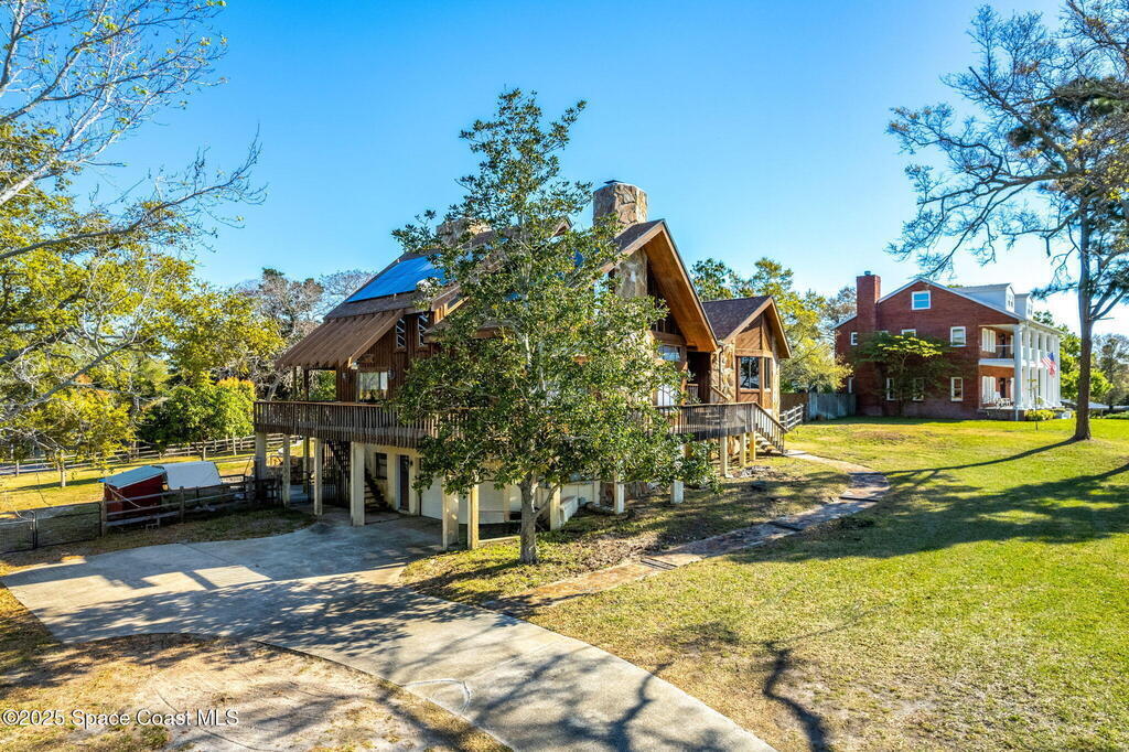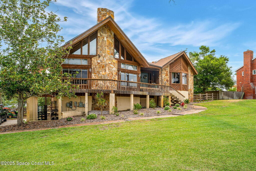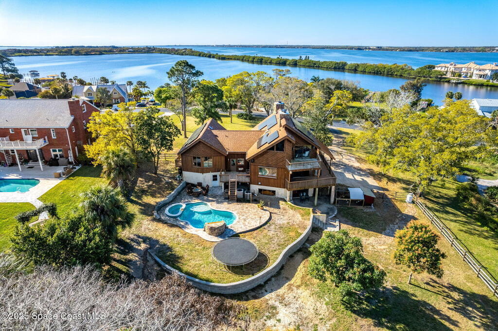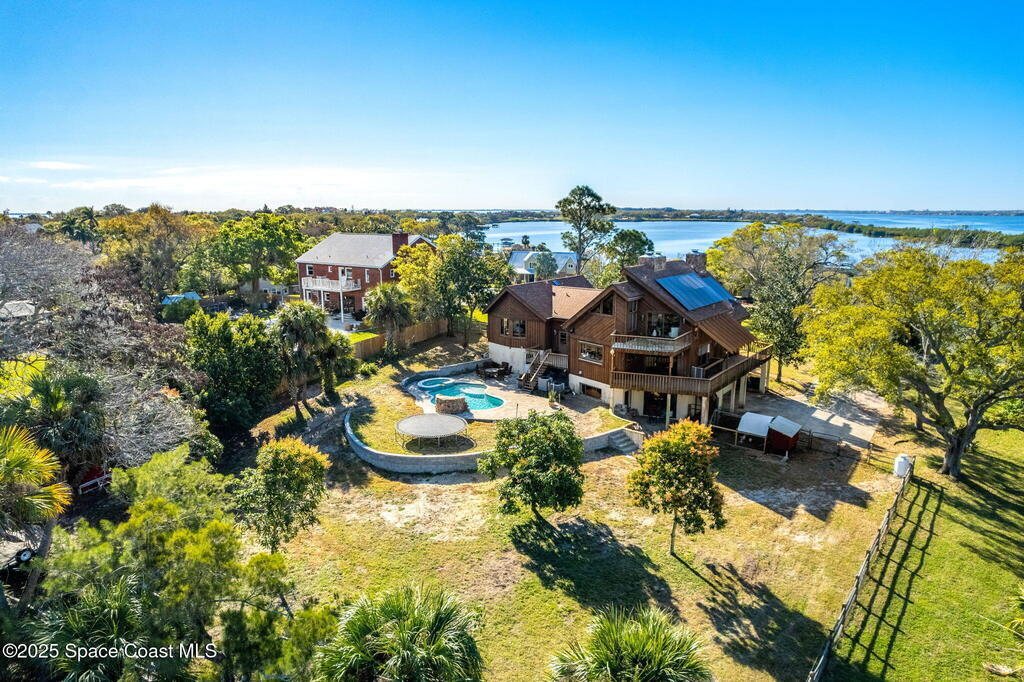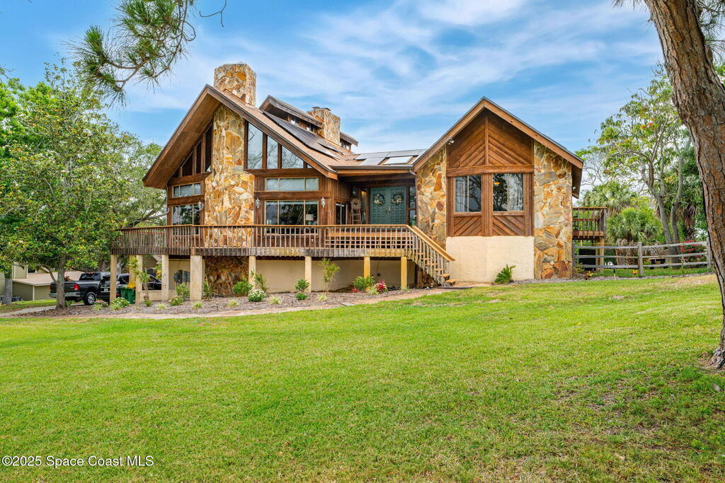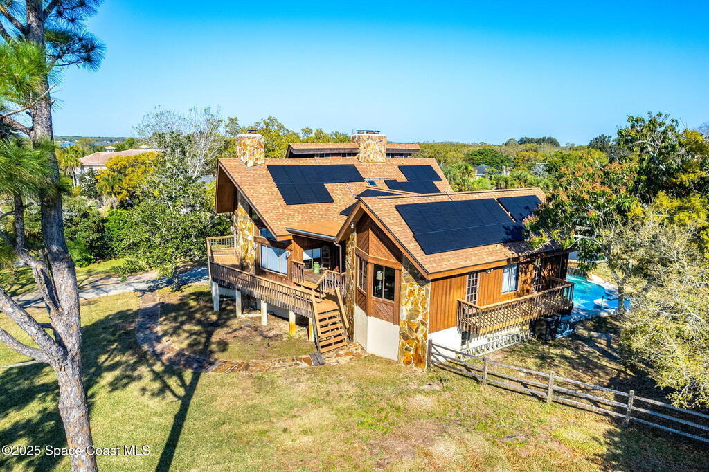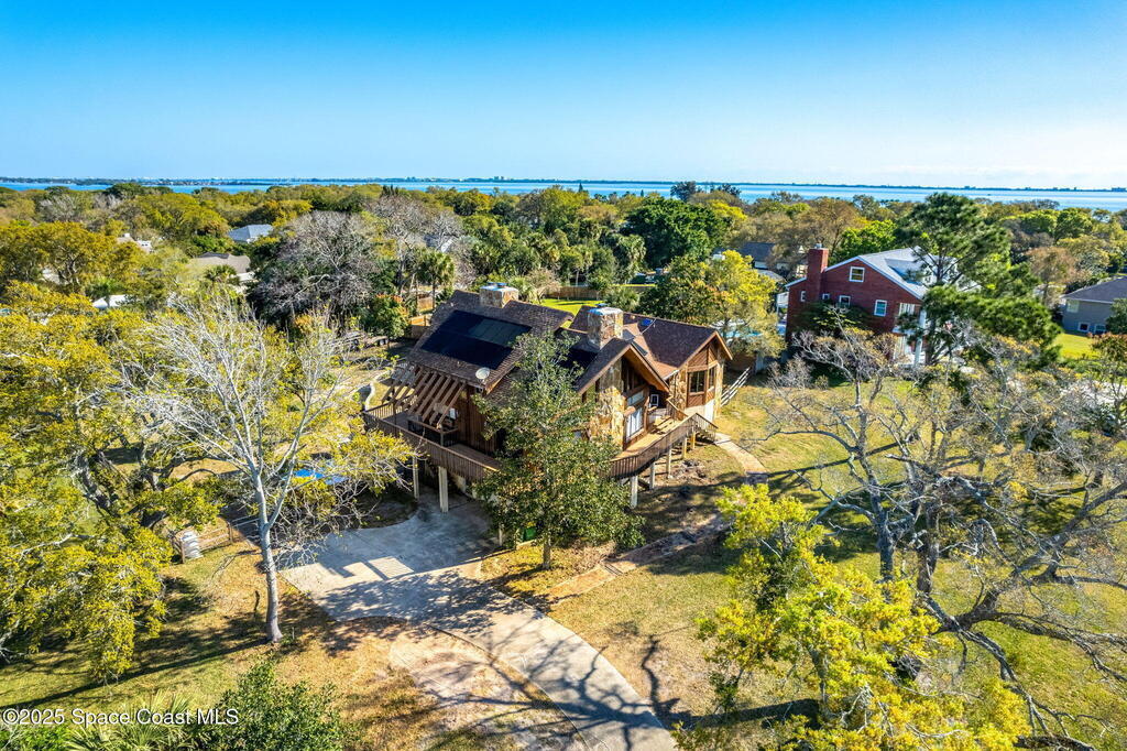 Assumable 2.375% VA $750,000 Mortgage . Tucked away on a full acre in the exclusive Still Water Subdivision of South Merritt Island, this custom cedar home offers rare privacy and natural beauty. Surrounded by towering oaks and set atop one of the island's highest elevations in the historic Georgianna area, the 3-level beautiful estate A fully remodeled kitchen adds modern style, while three wood-burning fireplaces bring warmth and charm. The layout includes a third-floor master retreat, two bedrooms and main living on the second level, and a private guest/in-law suite on the ground floor--ideal for multigenerational living. Soaring ceilings and rich wood details create a comfortable, inviting feel. Step outside to your private pool or enjoy Honeymoon Lake's community dock across the street with direct access to the Indian River. Just 15 minutes from the beach and close to the Cape, PAFB, and Melbourne--this one-of-a-kind estate blends space, seclusion, and timeless character