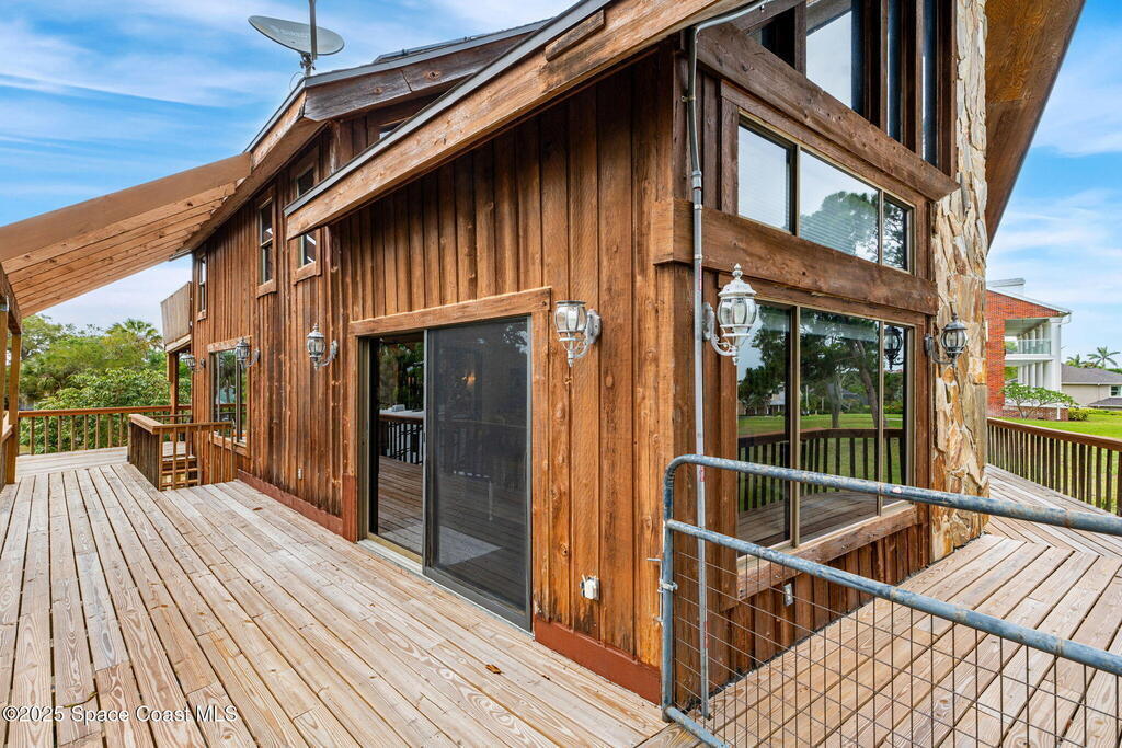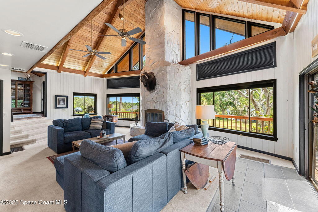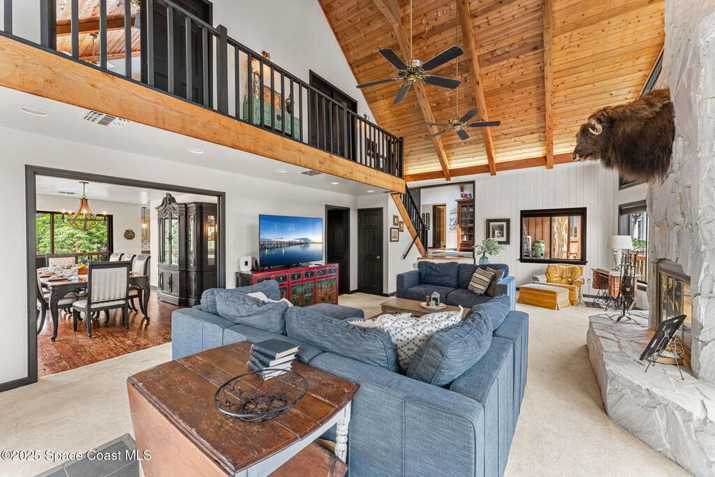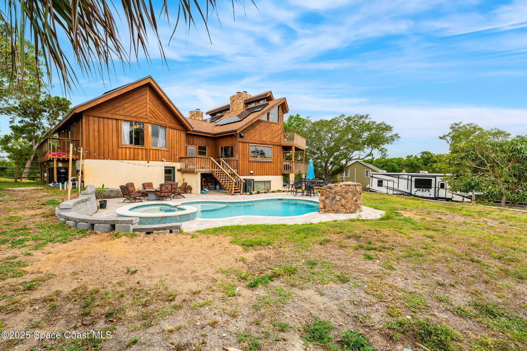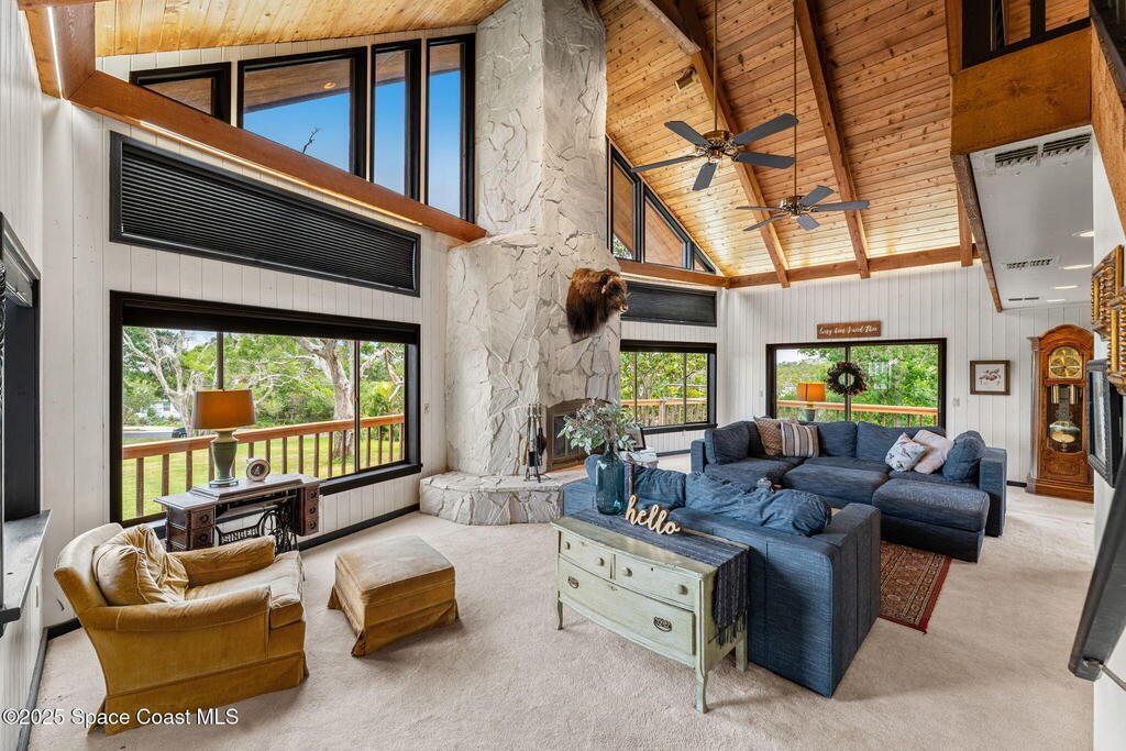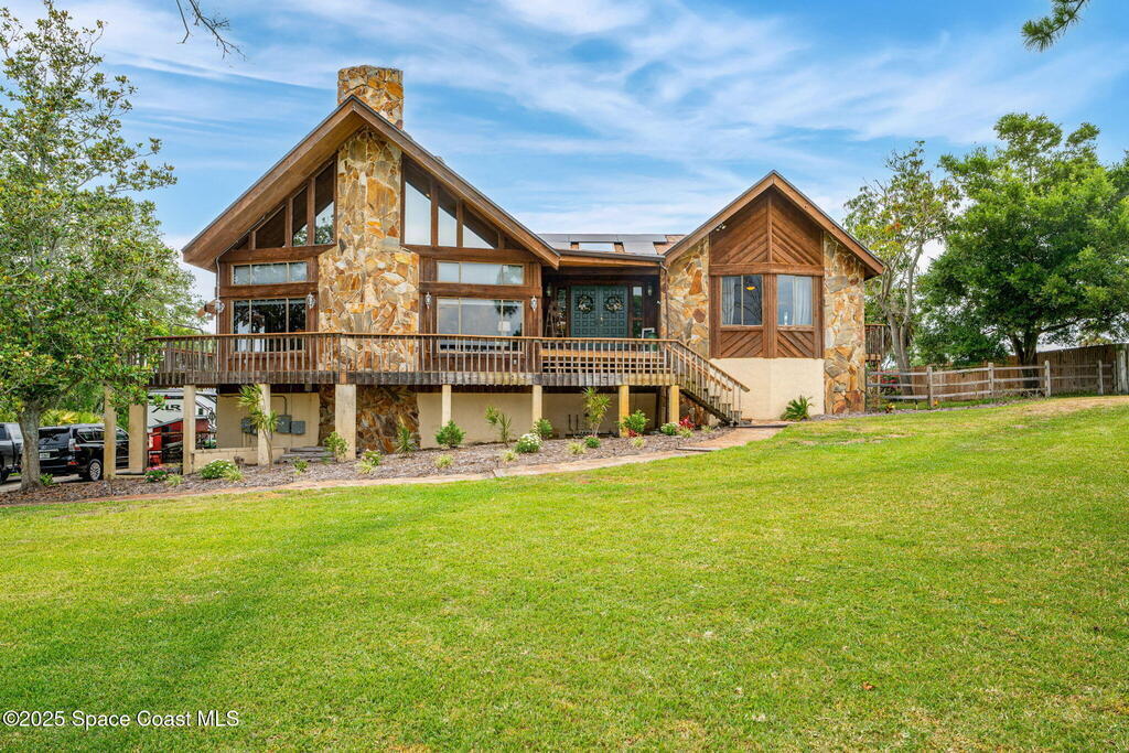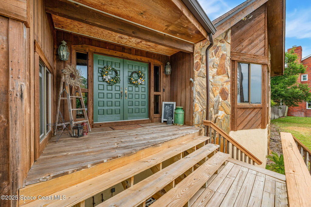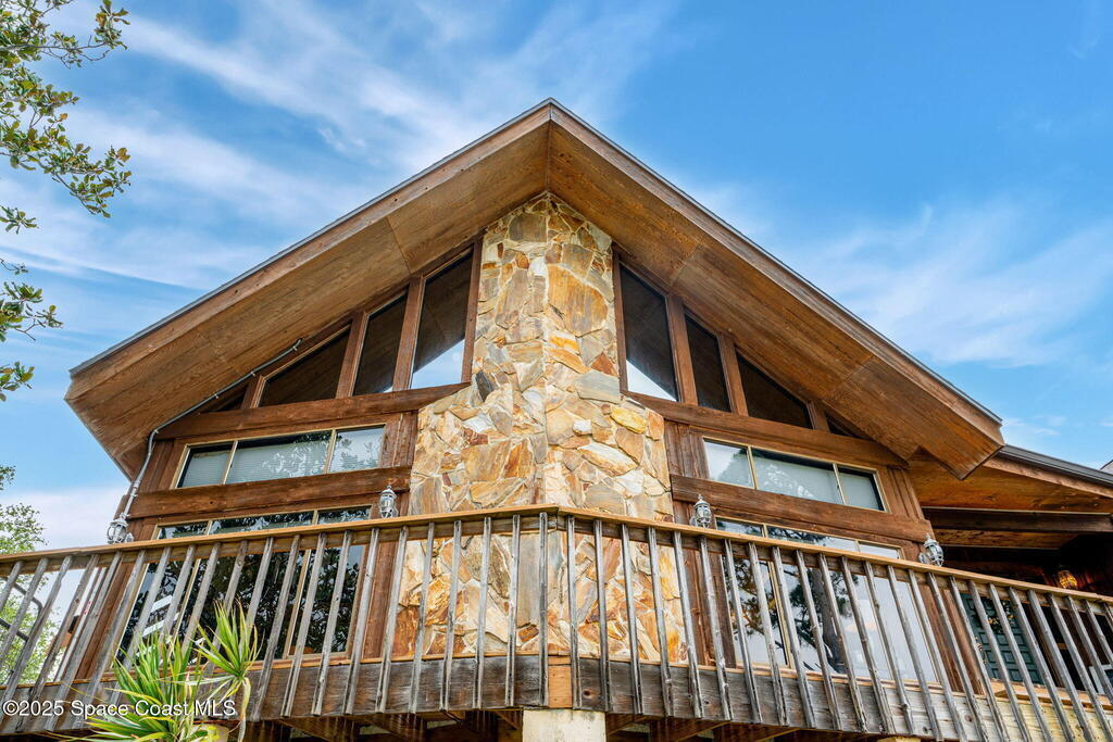 Assumable 2.375% VA $750,000 Mortgage . Tucked away on a full acre in the exclusive Still Water Subdivision of South Merritt Island, this custom cedar home offers rare privacy and natural beauty. Surrounded by towering oaks and set atop one of the island's highest elevations in the historic Georgianna area, the 3-level beautiful estate A fully remodeled kitchen adds modern style, while three wood-burning fireplaces bring warmth and charm. The layout includes a third-floor master retreat, two bedrooms and main living on the second level, and a private guest/in-law suite on the ground floor--ideal for multigenerational living. Soaring ceilings and rich wood details create a comfortable, inviting feel. Step outside to your private pool or enjoy Honeymoon Lake's community dock across the street with direct access to the Indian River. Just 15 minutes from the beach and close to the Cape, PAFB, and Melbourne--this one-of-a-kind estate blends space, seclusion, and timeless character