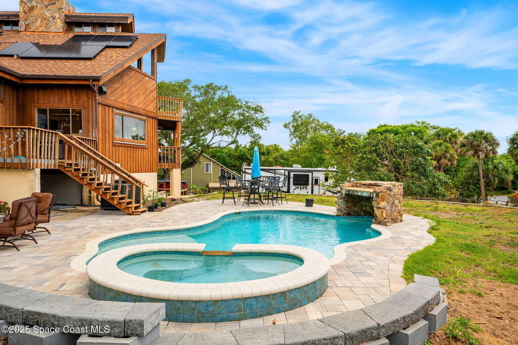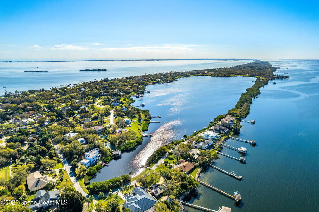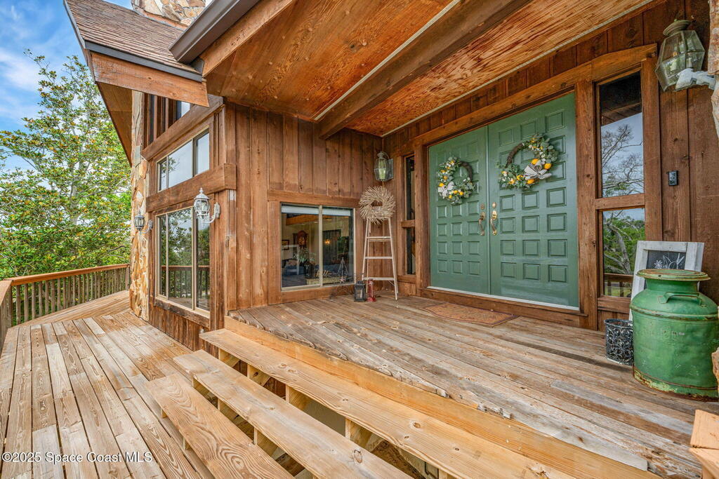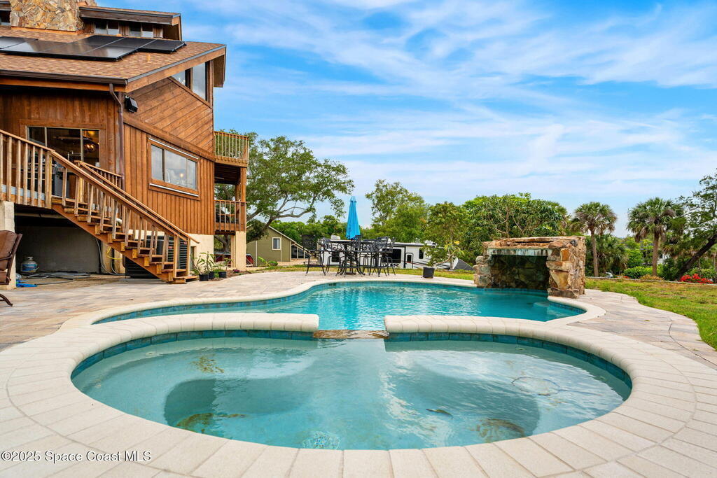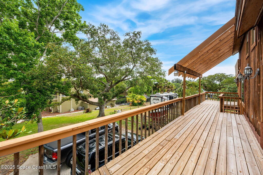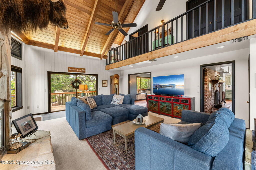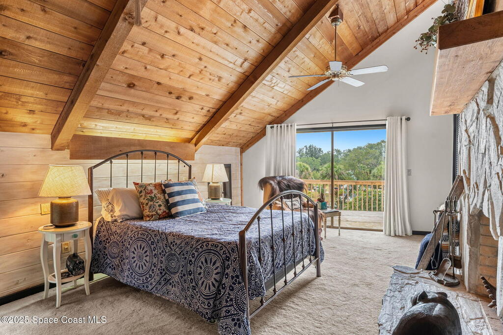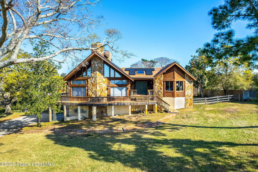 Assumable 2.375% VA $750,000 Mortgage . Tucked away on a full acre in the exclusive Still Water Subdivision of South Merritt Island, this custom cedar home offers rare privacy and natural beauty. Surrounded by towering oaks and set atop one of the island's highest elevations in the historic Georgianna area, the 3-level beautiful estate A fully remodeled kitchen adds modern style, while three wood-burning fireplaces bring warmth and charm. The layout includes a third-floor master retreat, two bedrooms and main living on the second level, and a private guest/in-law suite on the ground floor--ideal for multigenerational living. Soaring ceilings and rich wood details create a comfortable, inviting feel. Step outside to your private pool or enjoy Honeymoon Lake's community dock across the street with direct access to the Indian River. Just 15 minutes from the beach and close to the Cape, PAFB, and Melbourne--this one-of-a-kind estate blends space, seclusion, and timeless character