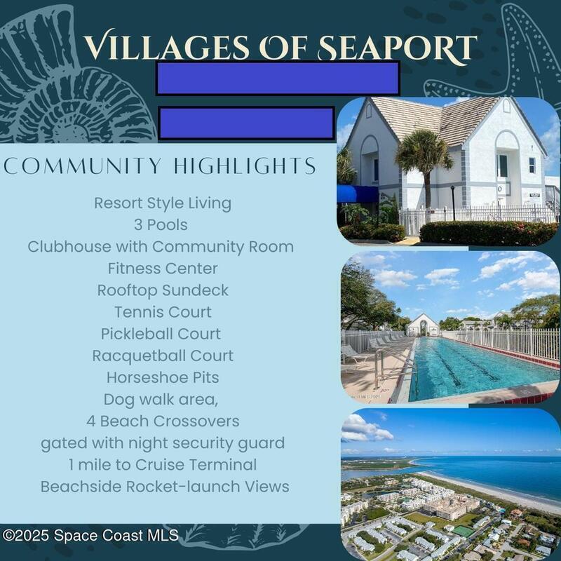 Your Beachside Escape Awaits!Welcome to one of the Space Coast's best-kept secrets--Villages of Seaport, an oceanfront, gated community in beautiful Cape Canaveral. This charming 2-bedroom, 1.5-bath townhome offers 1,120 square feet of coastal living just steps from the beach and minutes from top attractions: 1 mile to Port Canaveral cruise terminals, 2 miles to the Cocoa Beach Pier, and an easy drive to the Kennedy Space Center, Orlando International Airport, and Disney.Enjoy front-row views of rocket launches, or unwind with a walk on the sand. The community features three pools (including a lap pool), rooftop sundeck, private beach access, clubhouse with kitchen and fitness center, plus tennis, pickleball, racquetball, horseshoes, a dog walk area, and more. This townhome includes a screened-in sunroom, two dedicated parking spaces, and night security for added peace of mind. Live the Florida lifestyle you've been dreaming of, schedule your tour today! Come Home to a Lifestyle!