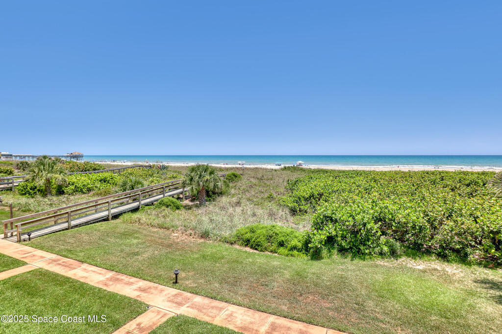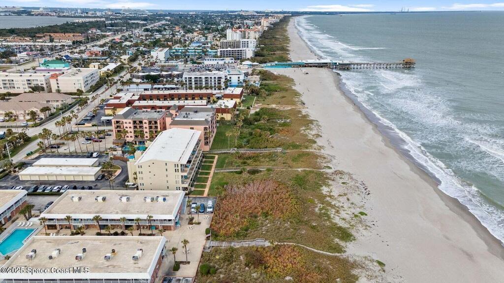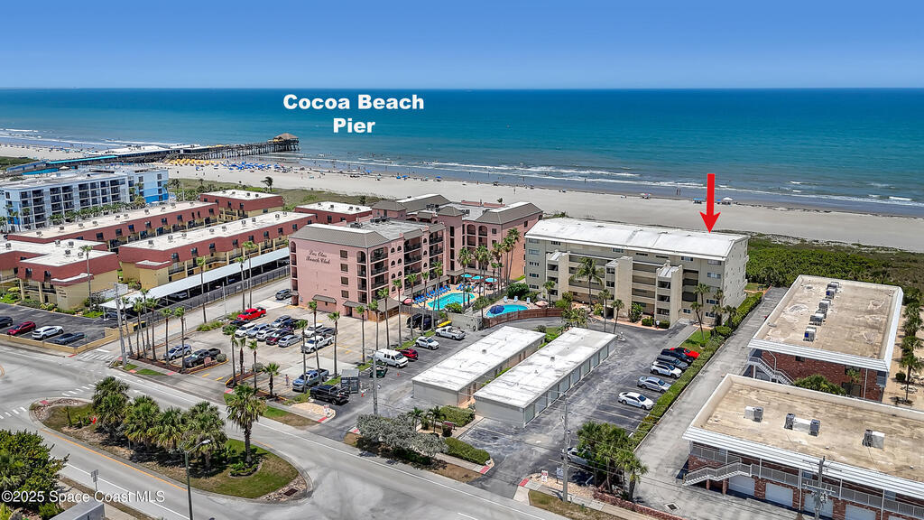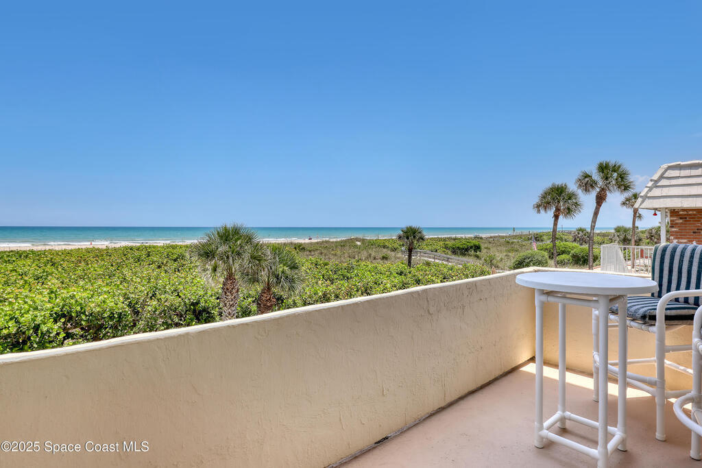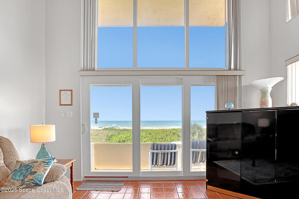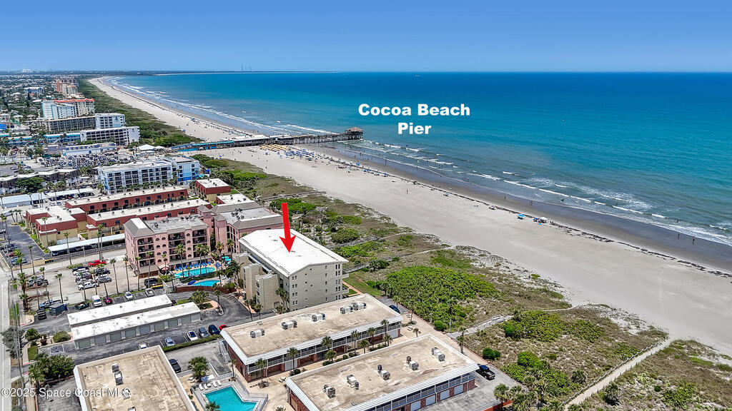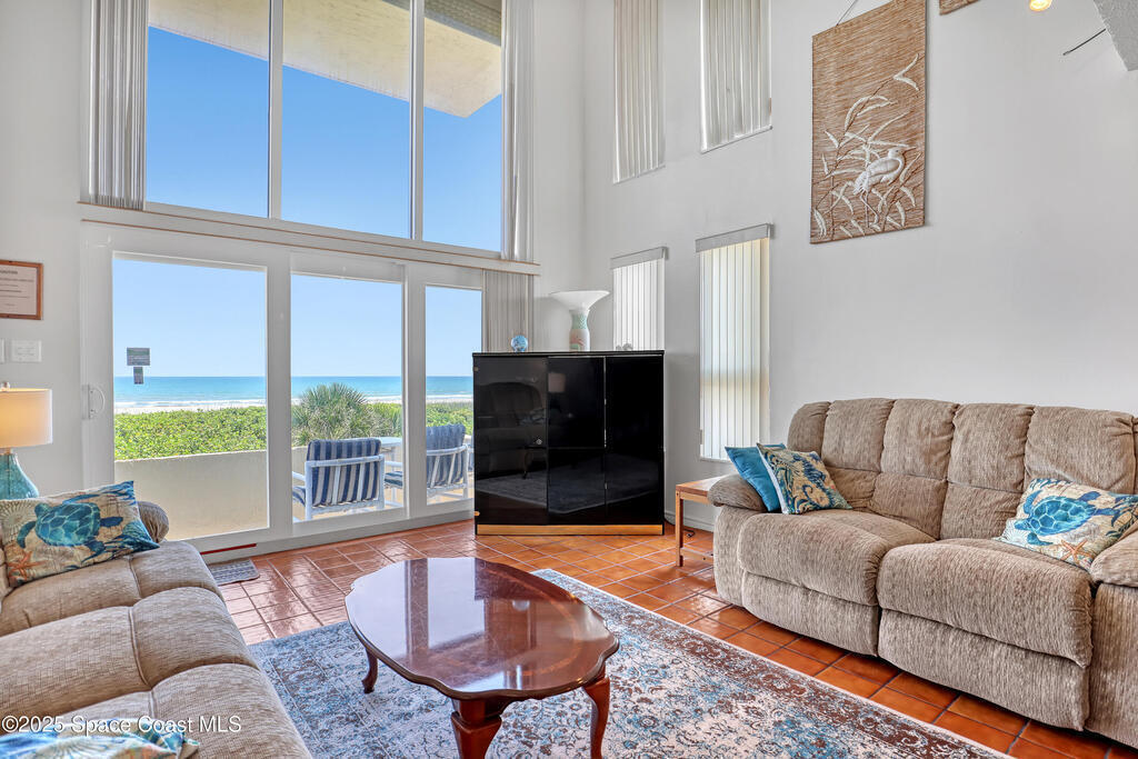 THIS COCOA BEACH DIRECT OCEAN FURNISHED CONDO boasts incredible floor-to-ceiling views of the Atlantic Ocean from main level and primary bedroom! This tri-level southeast facing corner unit has 2 large bedrooms, 2 full bathrooms, with 1 bedroom/bath on the main level, a private 1 car garage, in unit laundry room, and is vacation or rental ready as it's furnished! The open & bright condo has 3 spacious living levels, the main floor kitchen, dining and living areas have AMAZING VIEWS and a balcony to enjoy gorgeous sunrises, an evening cocktail while watching rocket launches, cruise ships and the famous Cocoa Beach Pier! You'll be front and center for the annual boat races, surfing Santas and other events hosted in the area! A great investment property, permanent residence or vacation home in a well-kept community with a sparkling clean pool & private beach access! Convenient walk to dining, shopping, bike to Port Canaveral in 10 min, MCO & theme parks 40 min!