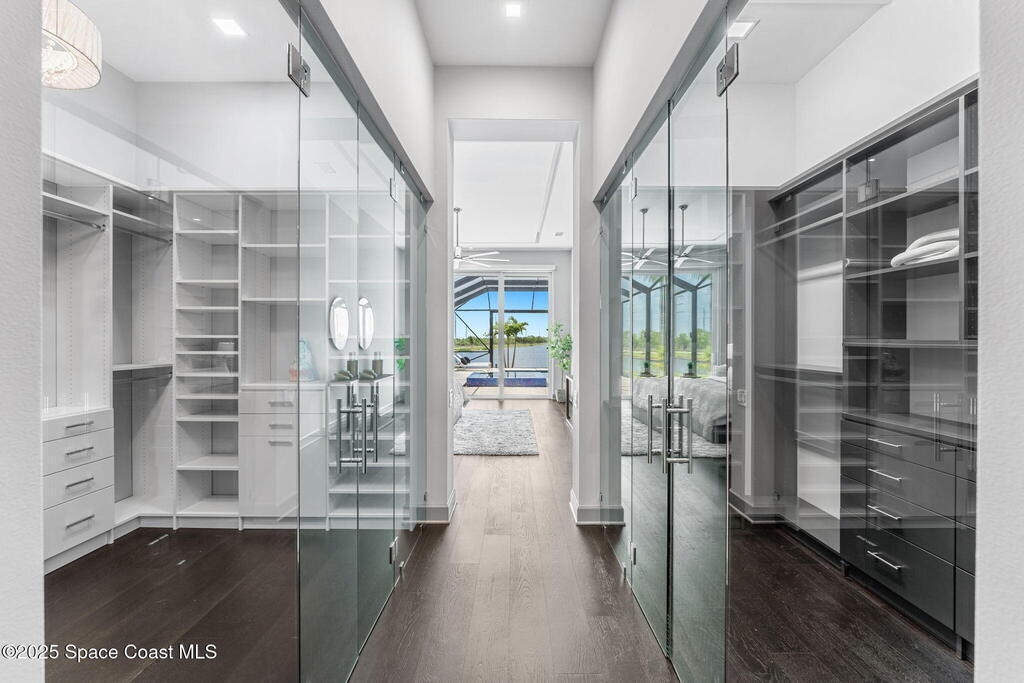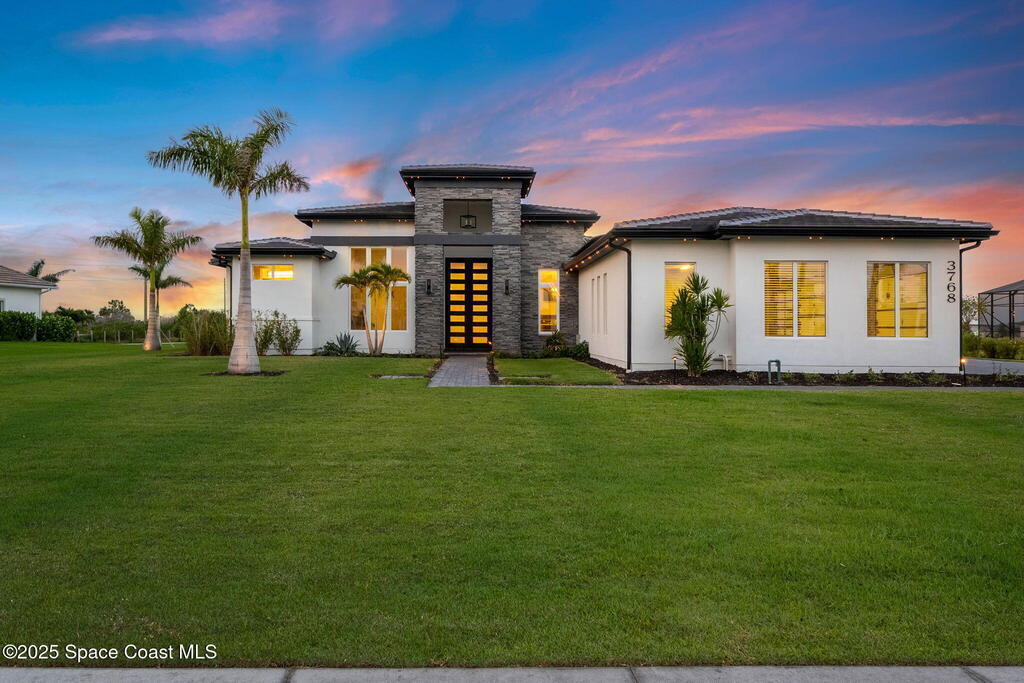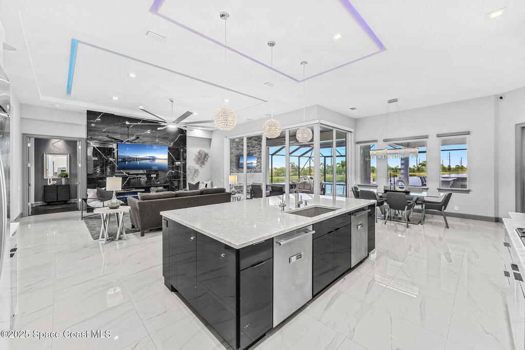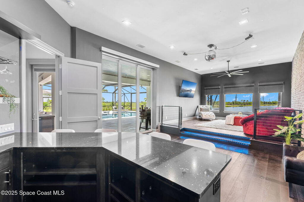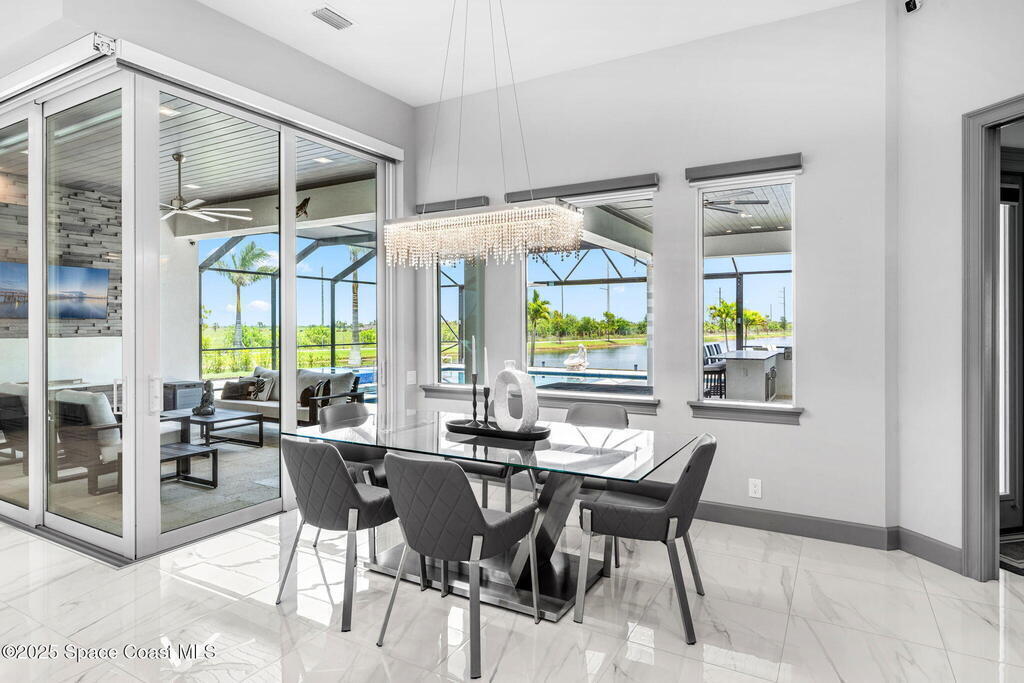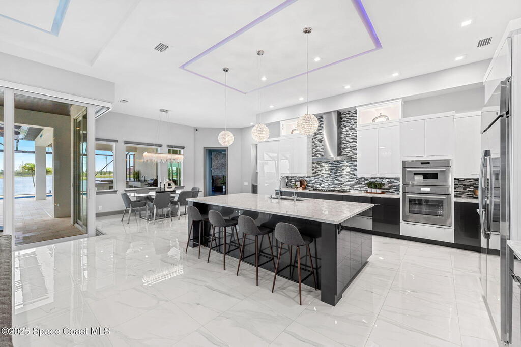 At the highest tier of Viera's luxury landscape, this lakefront showpiece in Adelaide redefines residential modernism through precision, restraint, and natural immersion. Beyond its bold facade, the 3-bedroom floorplan unfolds around sculptural sightlines, disappearing glass walls, and interiors that breathe with light. Enter through 12' doors into a volume-rich space framed by a signature wine wall and panoramic water views. A private office wrapped in glass overlooks the pool, while the main living zone stretches toward the horizon with 10' corner sliders that erase the divide between architecture and environment. The kitchen reads like a design installation--dual dishwashers, wine fridge, hidden pantry, instant hot water dispenser, and an expansive island seamlessly integrated for performance.