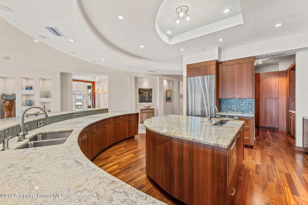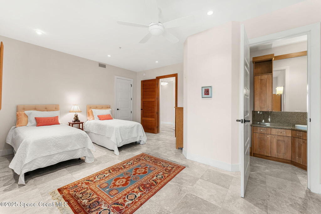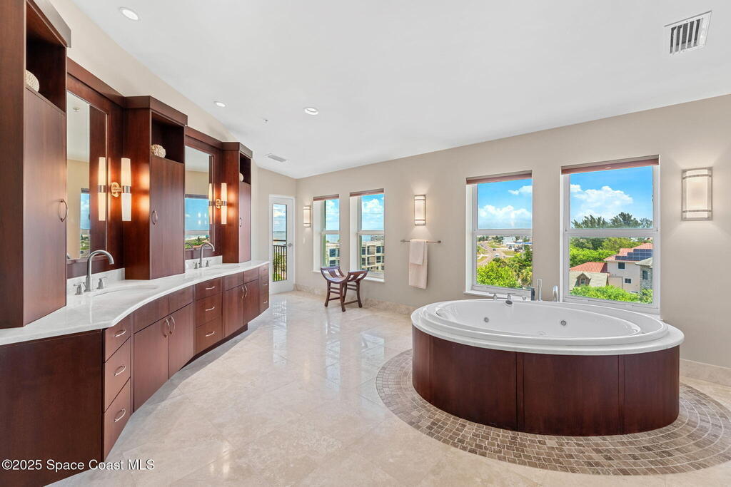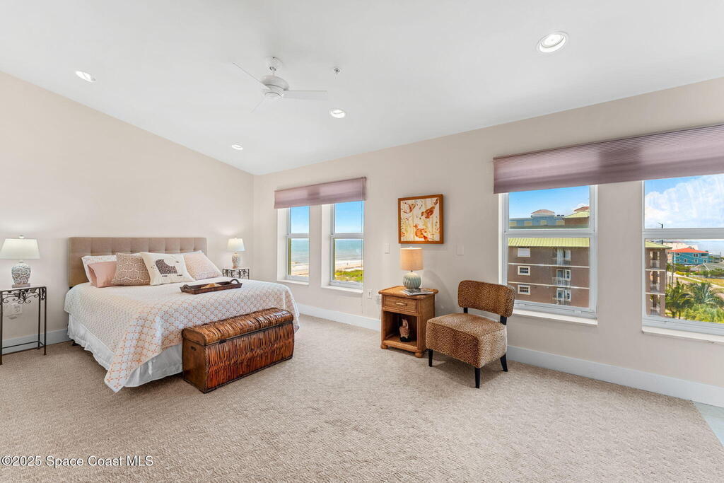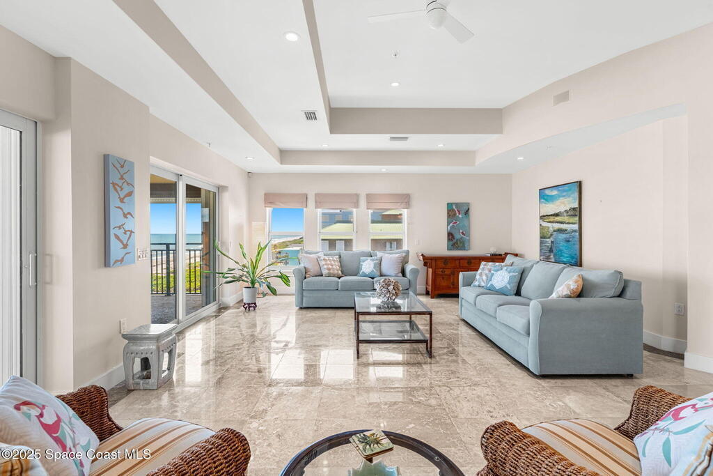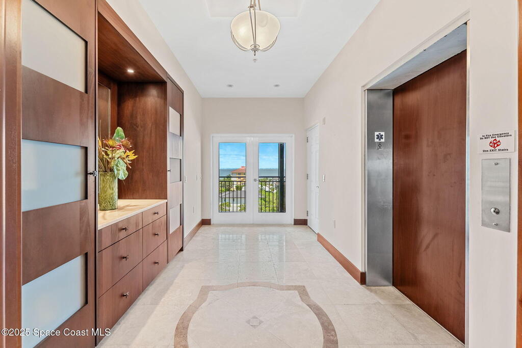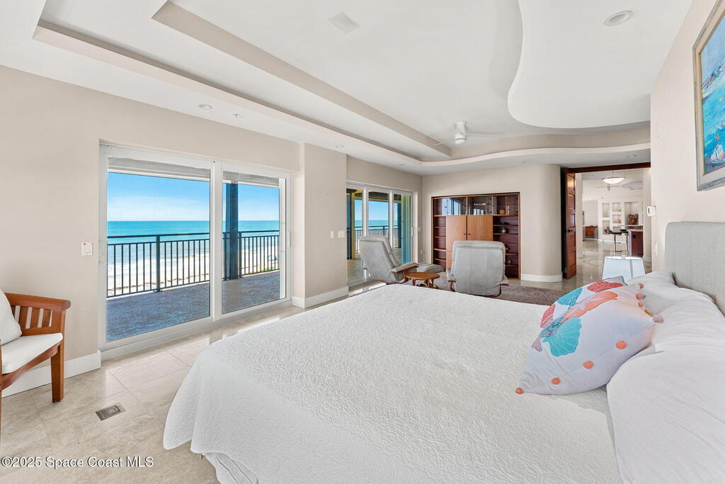 Ninety feet of ocean. An entire private floor. The pinnacle of penthouse living. Occupying the full sixth story of an exclusive oceanfront residence, this 6,005 sq. ft. home in the sky delivers panoramic views that stretch from launch trails at the Cape to golden river sunsets. Accessed by a secure elevator opens directly into your personal foyer, this singular residence offers five en suite bedrooms, six luxurious baths, a richly paneled office with 44 custom bookshelves, a soundproof media lounge, a full gym with dedicated HVAC & bath, and a climate-controlled wine room designed for 560 bottles. The chef's kitchen blends function & artistry with a Thermador gas range, Electrolux double ovens, two dishwashers, custom mahogany cabinetry, granite countertops, a walk-in pantry with upright freezer, and dual sinks.