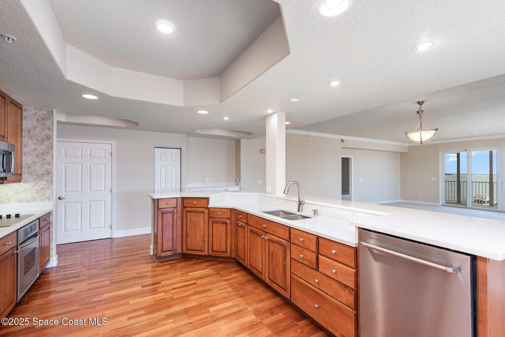 Most desirable floor plan in Whitley Bay, this corner unit embodies both elegance & modern comfort. Open-concept floor plan maximizes space & light. Freshly painted throughout High-end finishes & attention to detail are evident. Gourmet kitchen is a chef's dream, equipped with stainless steel appliances, ample cabinetry & brand new countertops for all your culinary needs. The primary suite is a tranquil retreat, offering a luxurious en-suite bathroom. Complete with a jetted tub, separate shower, & dual vanities, this space is designed for relaxation & comfort. 2 additional bedroom suites are well-appointed with private baths & custom closets, providing plenty of room for guests. The private wrap-around balcony offers breathtaking views of the Indian River. Convenient in-unit laundry facilities & dedicated parking. Located in a vibrant community with top-notch amenities & steps from Cocoa Village offering shopping, dining, & recreational opportunities; not just a home, but a lifestyle.