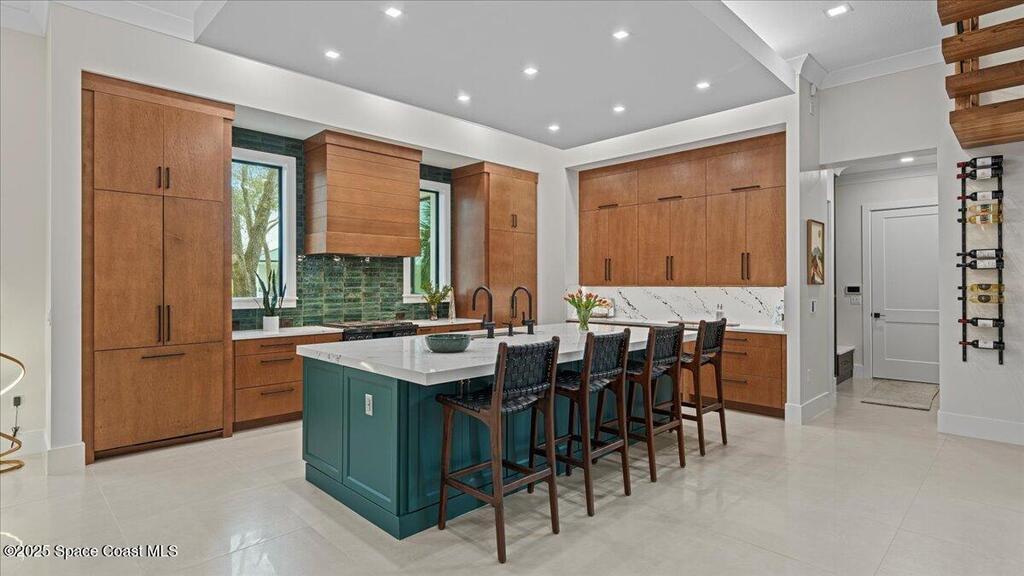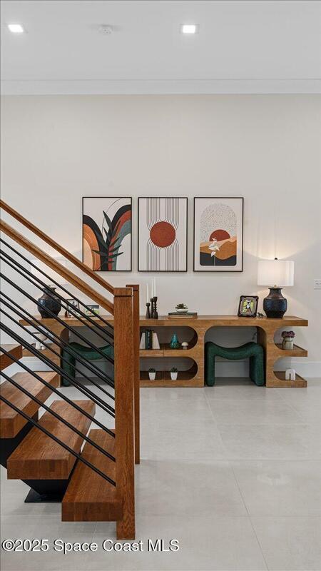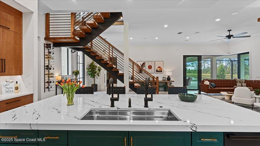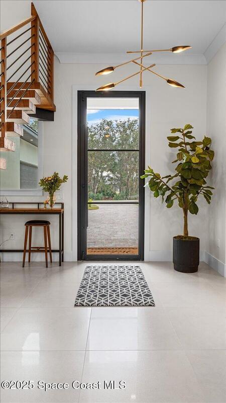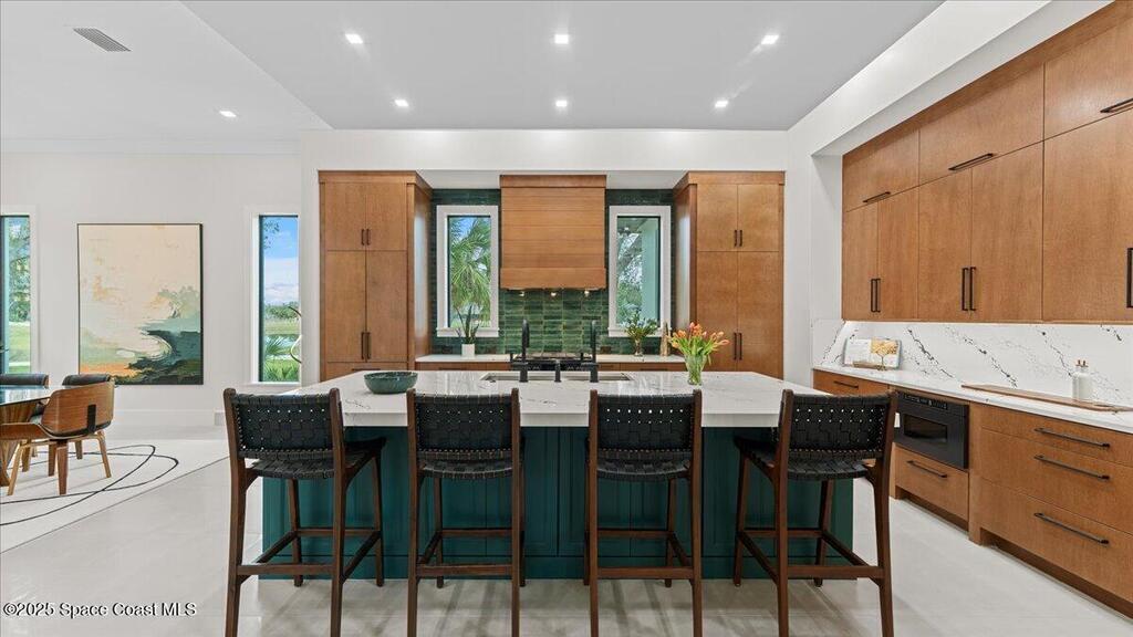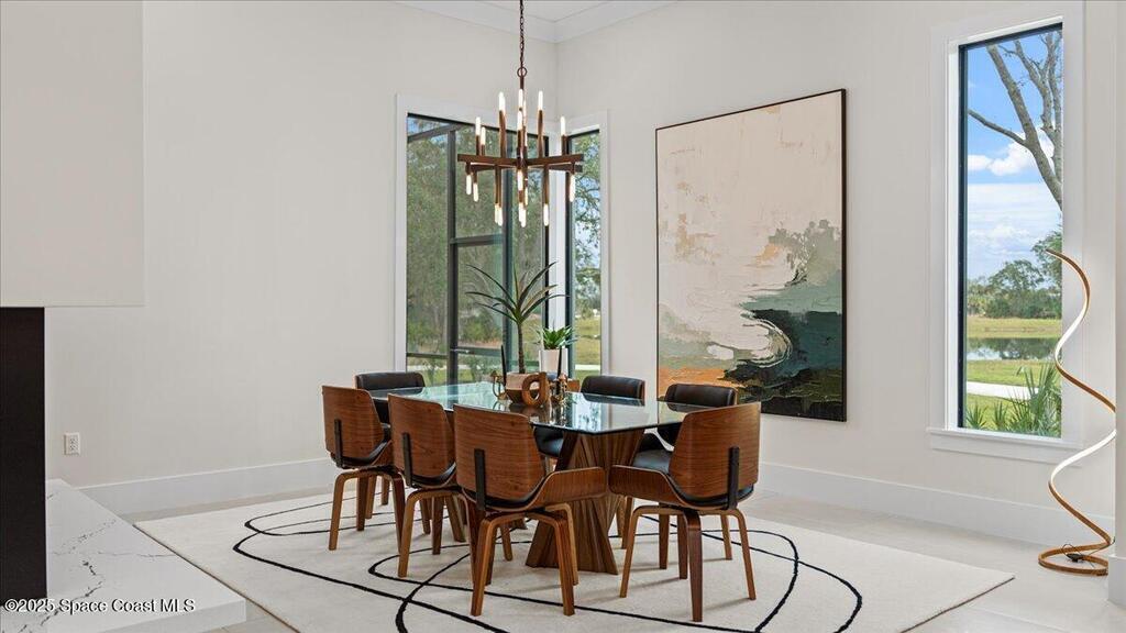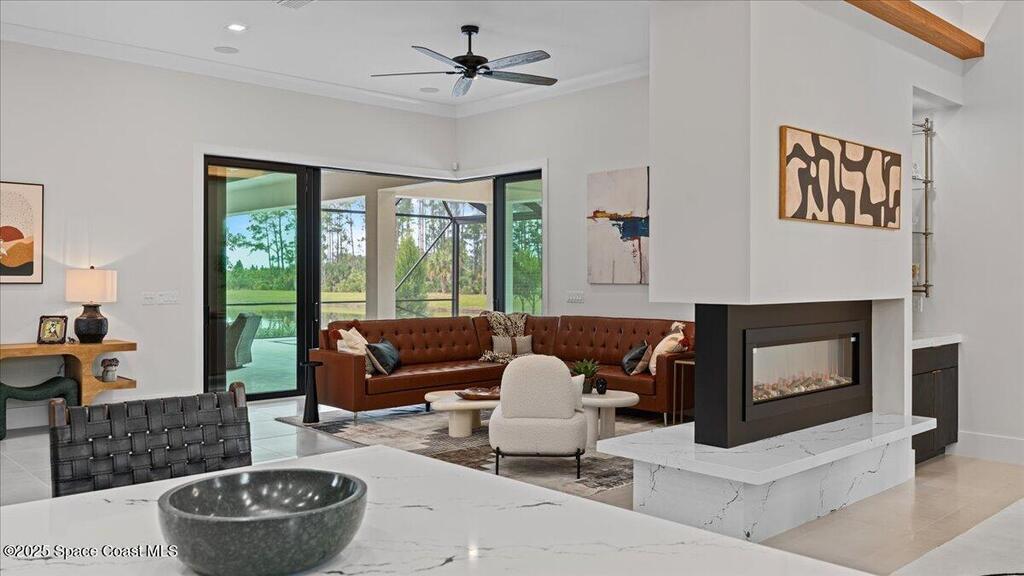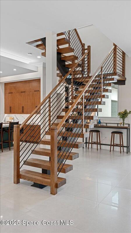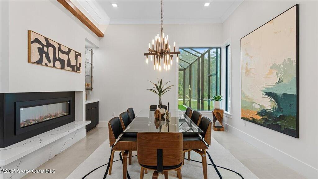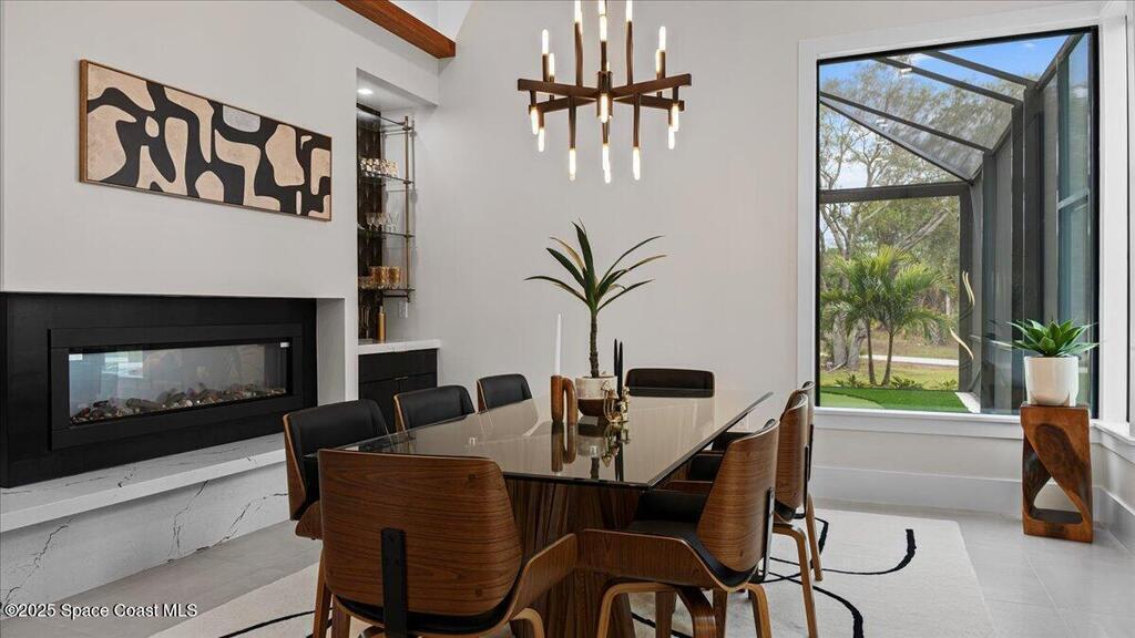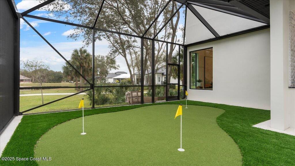 Welcome to this stunning Award Winning Model Home in the highly sought-after Aripeka at Viera, where luxury, comfort, and beautiful views come together effortlessly. This home is designed to impress with it's first floor primary retreat and study, plus 3 generously sized bedrooms and a loft upstairs, 3.5 bathrooms, and a spacious 3 car garage. Every inch of this home showcases exceptional craftmanship and high-end finishes - from the metal roof and handcrafted iron pivot door to the floating staircase and expansive 32''x32'' tile and hardwood flooring and the modern style two-sided fireplace. The chef's kitchen is a true masterpiece, boasting sleek Dacor appliances, a built-in refrigerator and freezer, Cambria quartz countertops, beautiful backsplash, expansive center island, and a large hidden walk-in pantry.The outdoor space is just as impressive, complete with a summer kitchen, private golf putting green, and a resort style pool, perfect for entertaining or unwinding in style