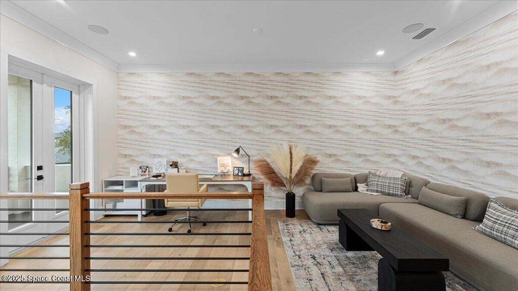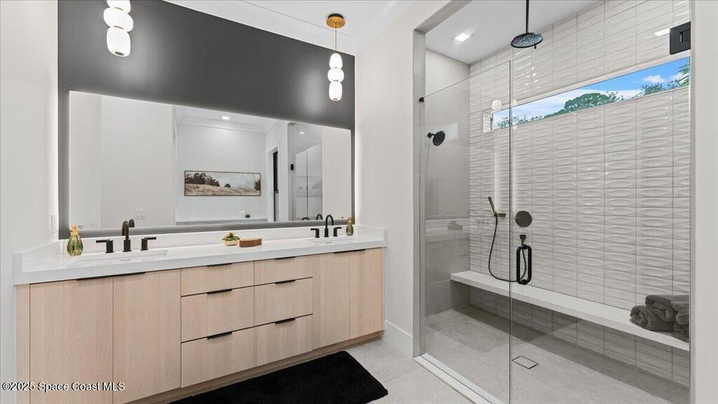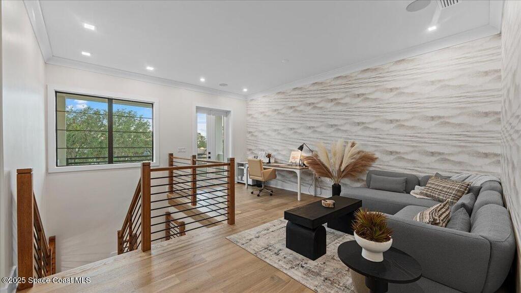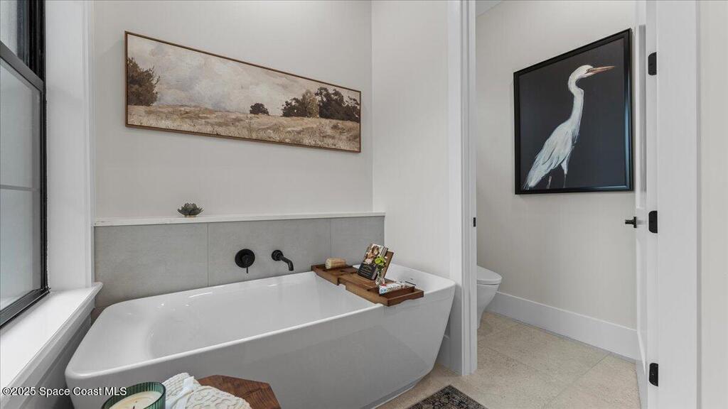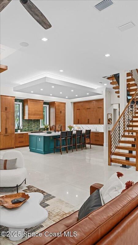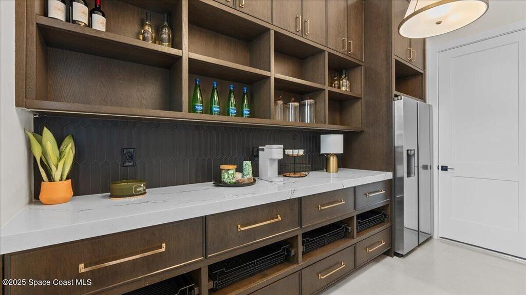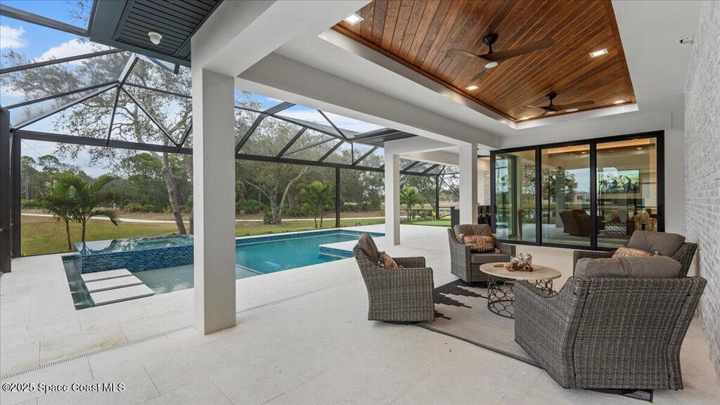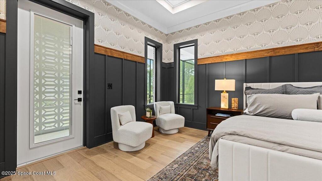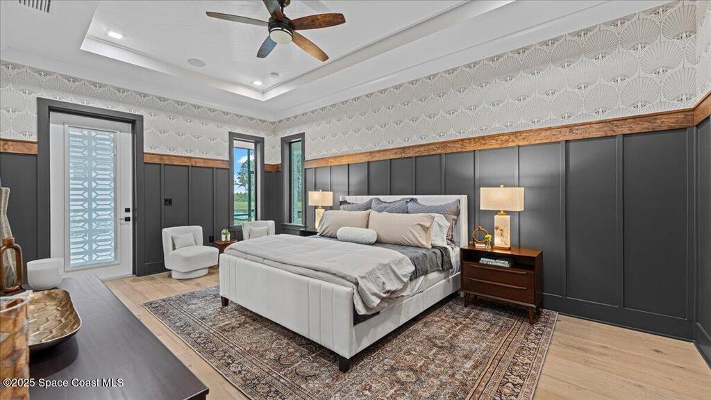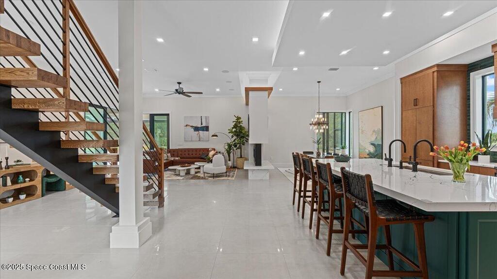 Welcome to this stunning Award Winning Model Home in the highly sought-after Aripeka at Viera, where luxury, comfort, and beautiful views come together effortlessly. This home is designed to impress with it's first floor primary retreat and study, plus 3 generously sized bedrooms and a loft upstairs, 3.5 bathrooms, and a spacious 3 car garage. Every inch of this home showcases exceptional craftmanship and high-end finishes - from the metal roof and handcrafted iron pivot door to the floating staircase and expansive 32''x32'' tile and hardwood flooring and the modern style two-sided fireplace. The chef's kitchen is a true masterpiece, boasting sleek Dacor appliances, a built-in refrigerator and freezer, Cambria quartz countertops, beautiful backsplash, expansive center island, and a large hidden walk-in pantry.The outdoor space is just as impressive, complete with a summer kitchen, private golf putting green, and a resort style pool, perfect for entertaining or unwinding in style