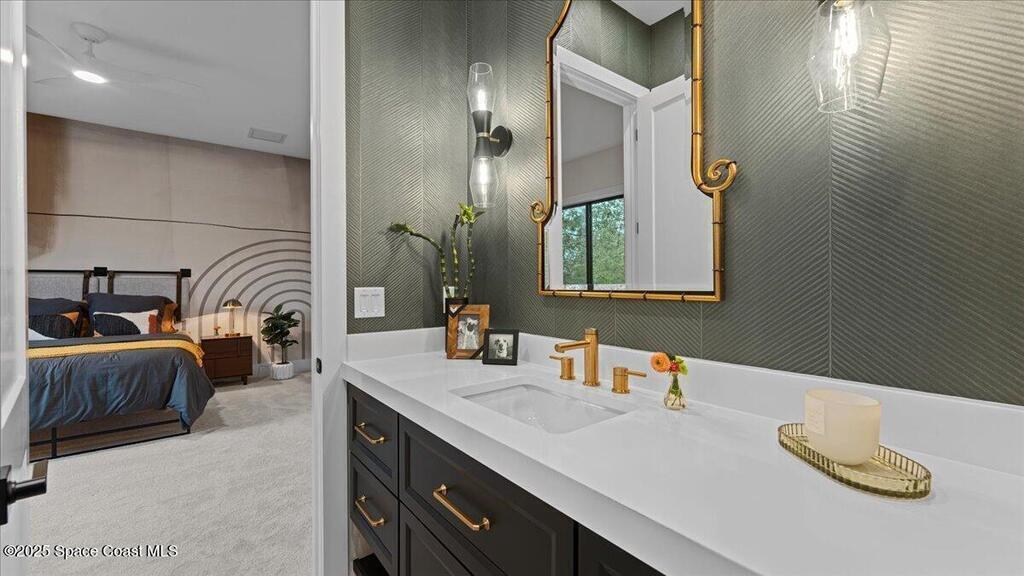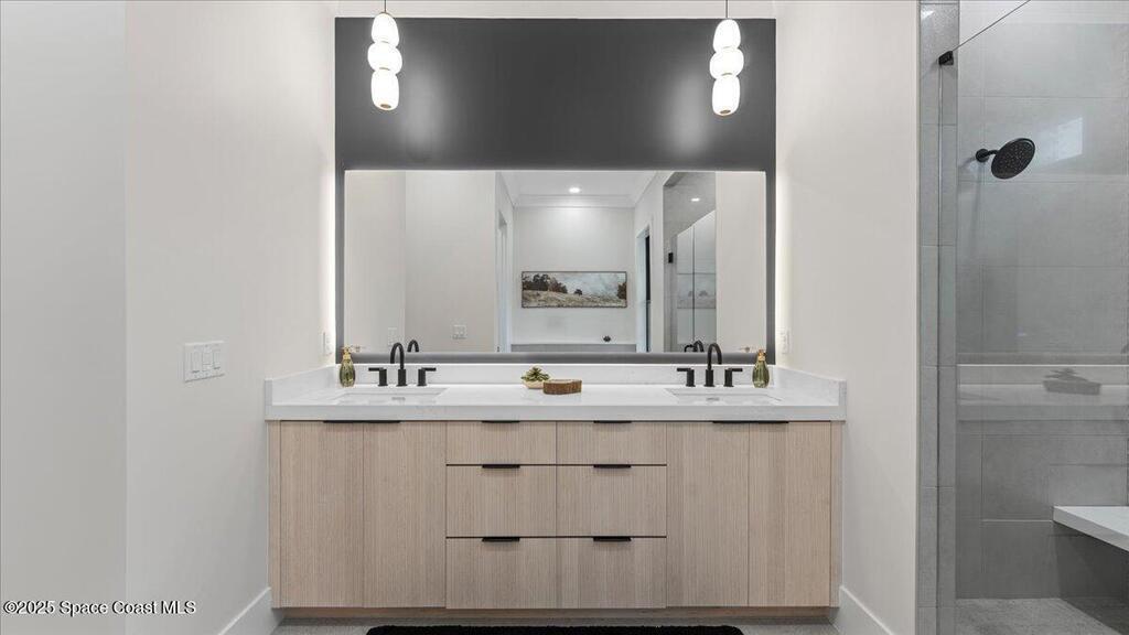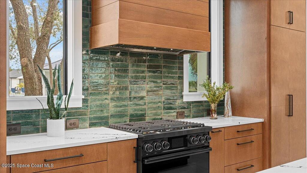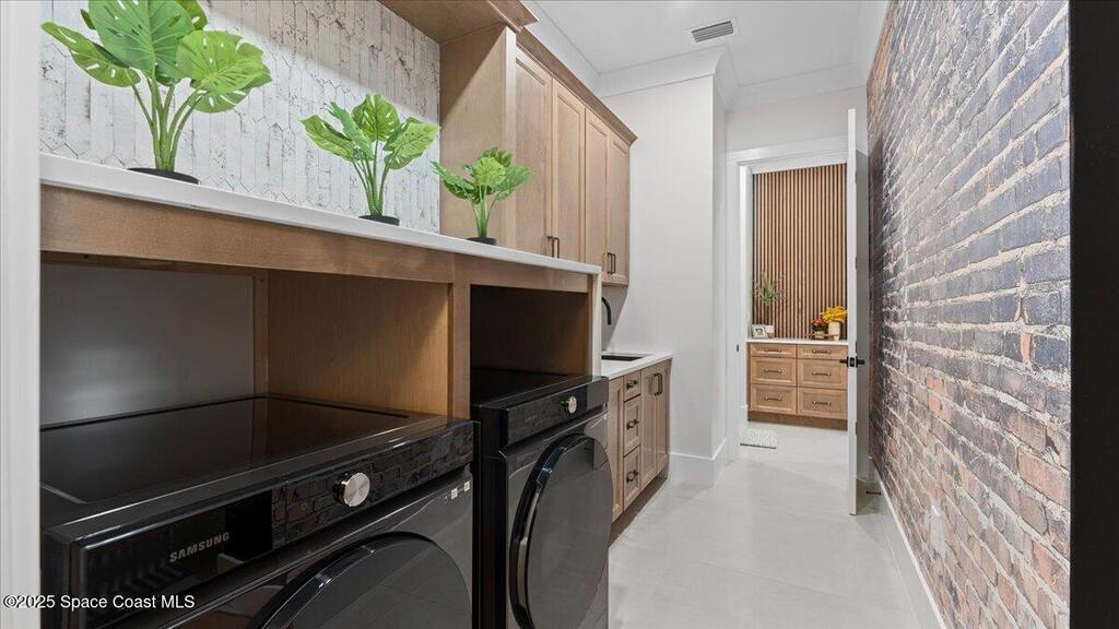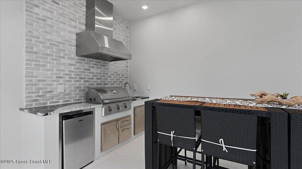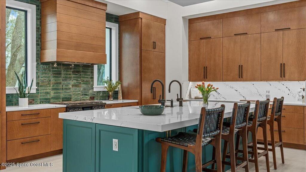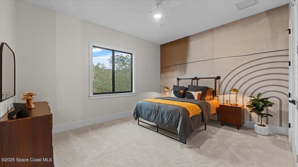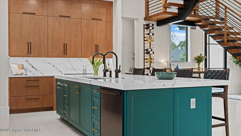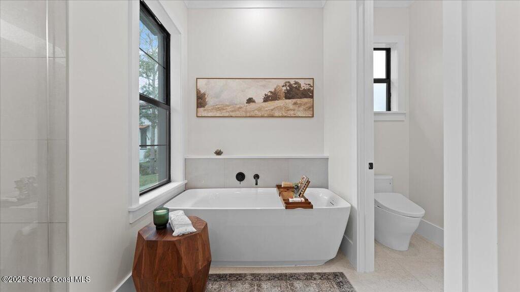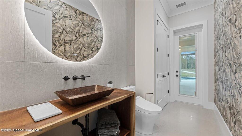 Welcome to this stunning Award Winning Model Home in the highly sought-after Aripeka at Viera, where luxury, comfort, and beautiful views come together effortlessly. This home is designed to impress with it's first floor primary retreat and study, plus 3 generously sized bedrooms and a loft upstairs, 3.5 bathrooms, and a spacious 3 car garage. Every inch of this home showcases exceptional craftmanship and high-end finishes - from the metal roof and handcrafted iron pivot door to the floating staircase and expansive 32''x32'' tile and hardwood flooring and the modern style two-sided fireplace. The chef's kitchen is a true masterpiece, boasting sleek Dacor appliances, a built-in refrigerator and freezer, Cambria quartz countertops, beautiful backsplash, expansive center island, and a large hidden walk-in pantry.The outdoor space is just as impressive, complete with a summer kitchen, private golf putting green, and a resort style pool, perfect for entertaining or unwinding in style