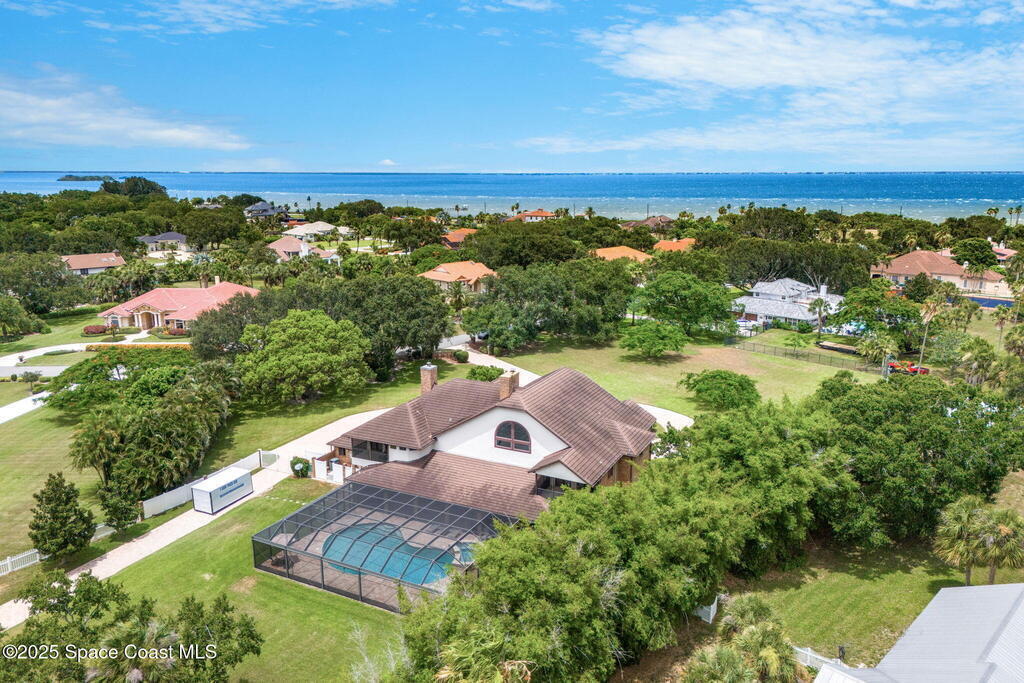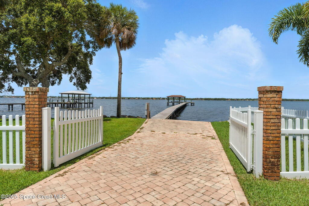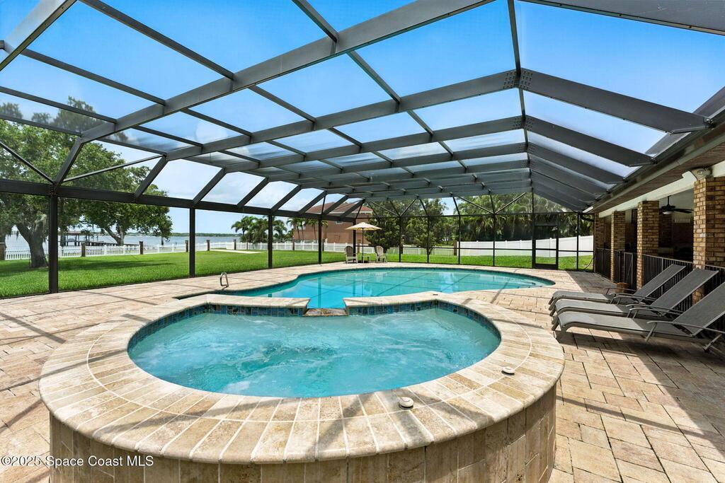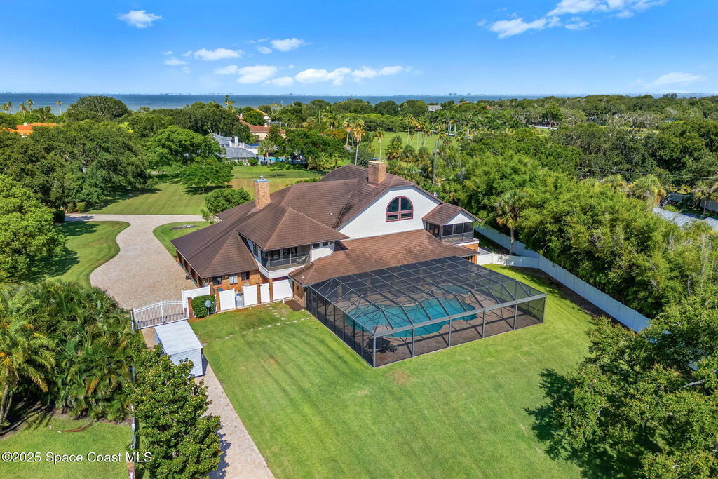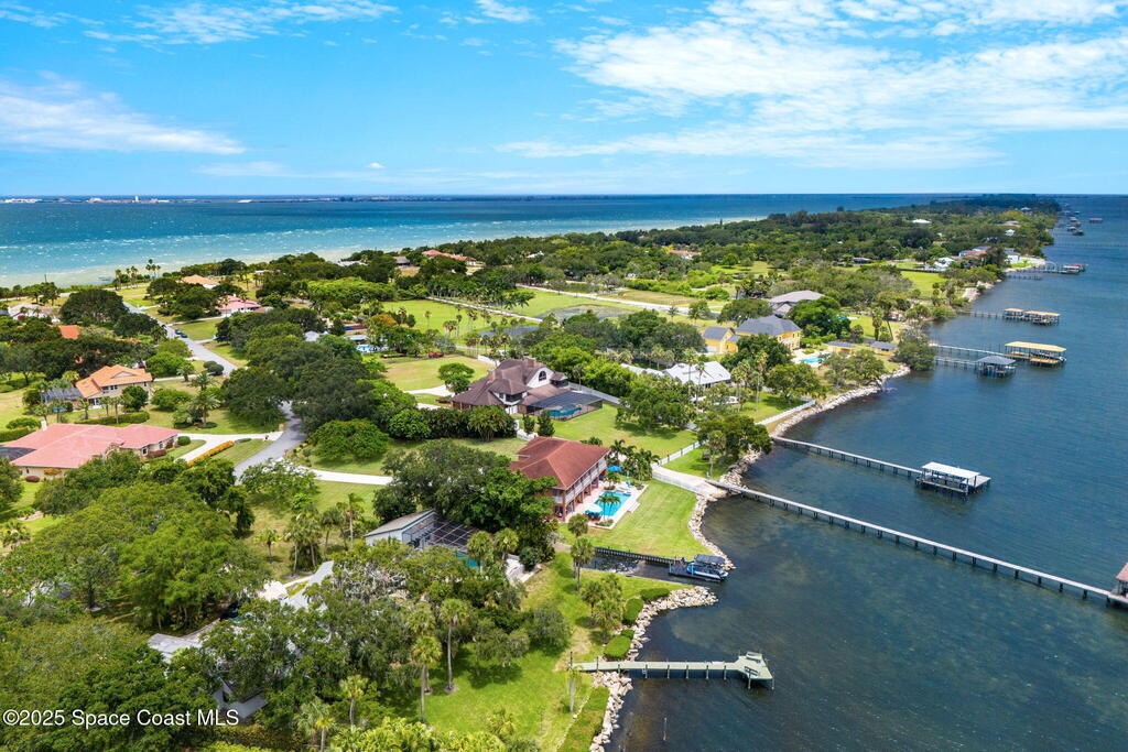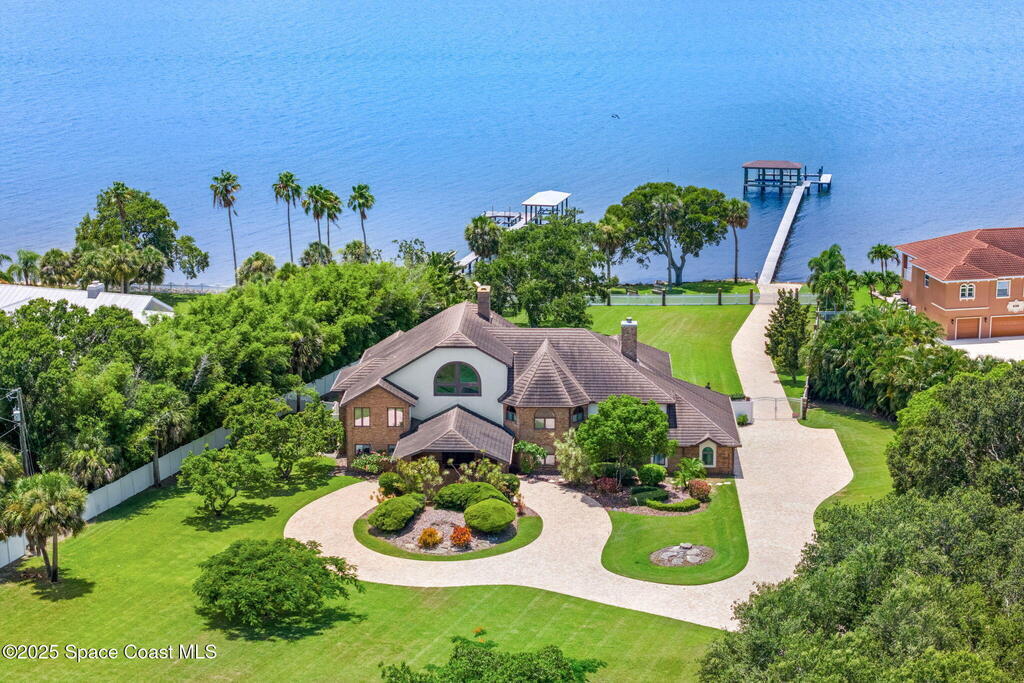 This extraordinary 6-bedroom, 5.5-bath riverfront estate is a private retreat on over 2 lush acres in the heart of Merritt Island. With 105 feet of shoreline and more than 6,600 sq. ft. of interior space, this property was designed for entertaining, multigenerational living, and serene waterfront enjoyment.A rare private boat ramp, 300-foot dock with double slips, 10,000-lb lift, and direct access to the Indian River make this a true boater's dream. Watch rocket launches from your own backyard or unwind beside the deep, heated pool and spa. The outdoor kitchen includes a grill, smoker, fridge, and covered lounge space ideal for entertaining. The backyard feels incredibly private, framed by mature landscaping that creates a peaceful sanctuary.Inside, a dramatic two-story foyer opens to refined living areas with wood and tile floors, two fireplaces, and a wet bar.