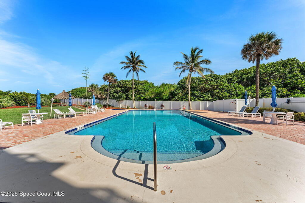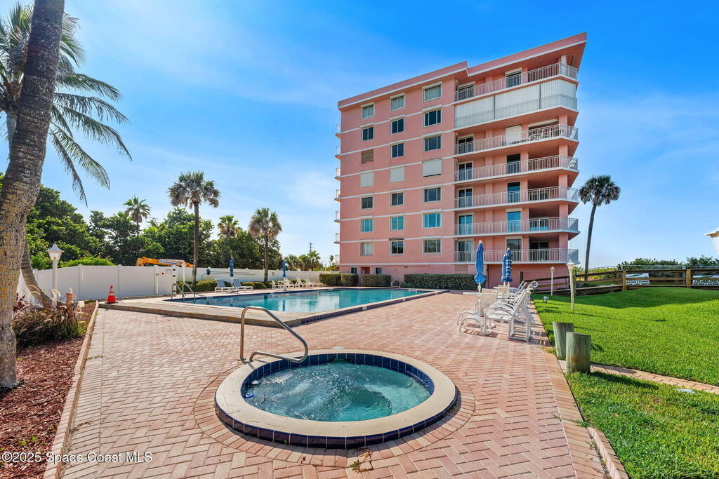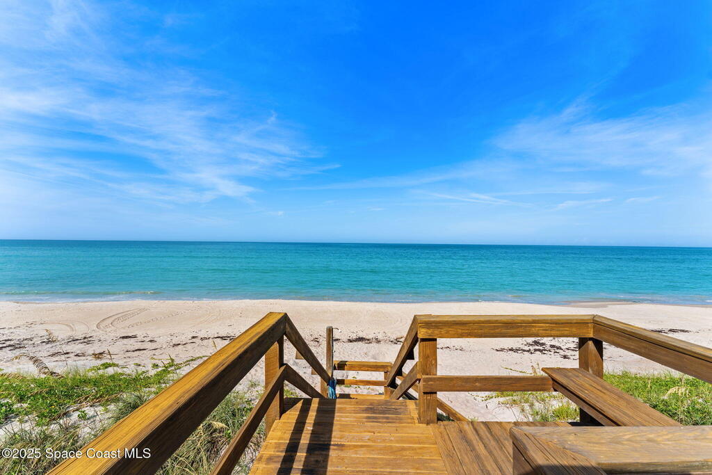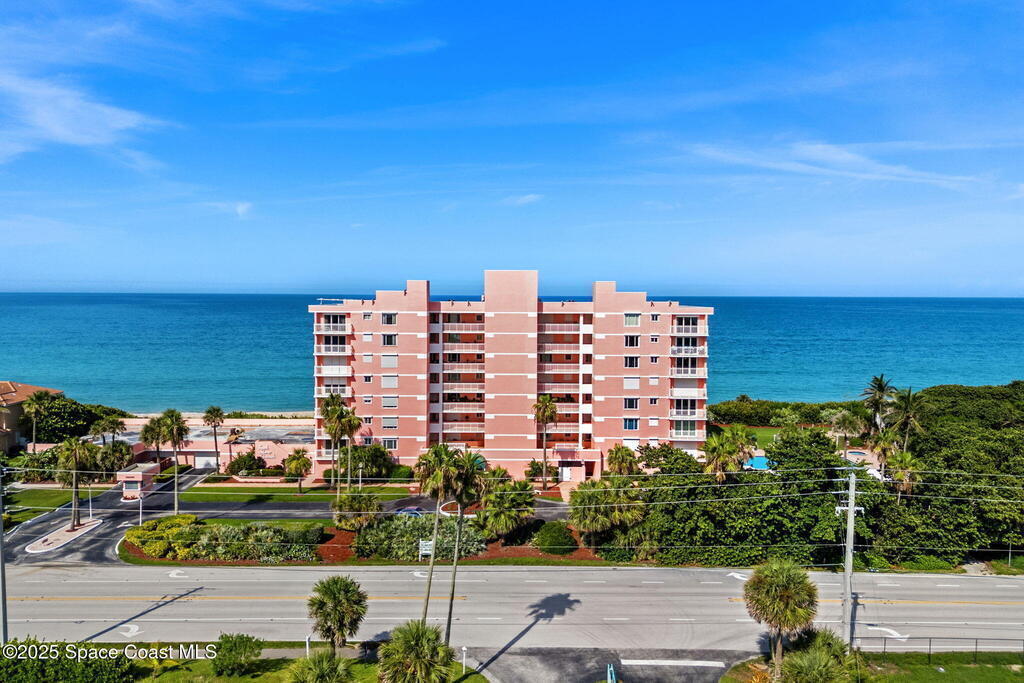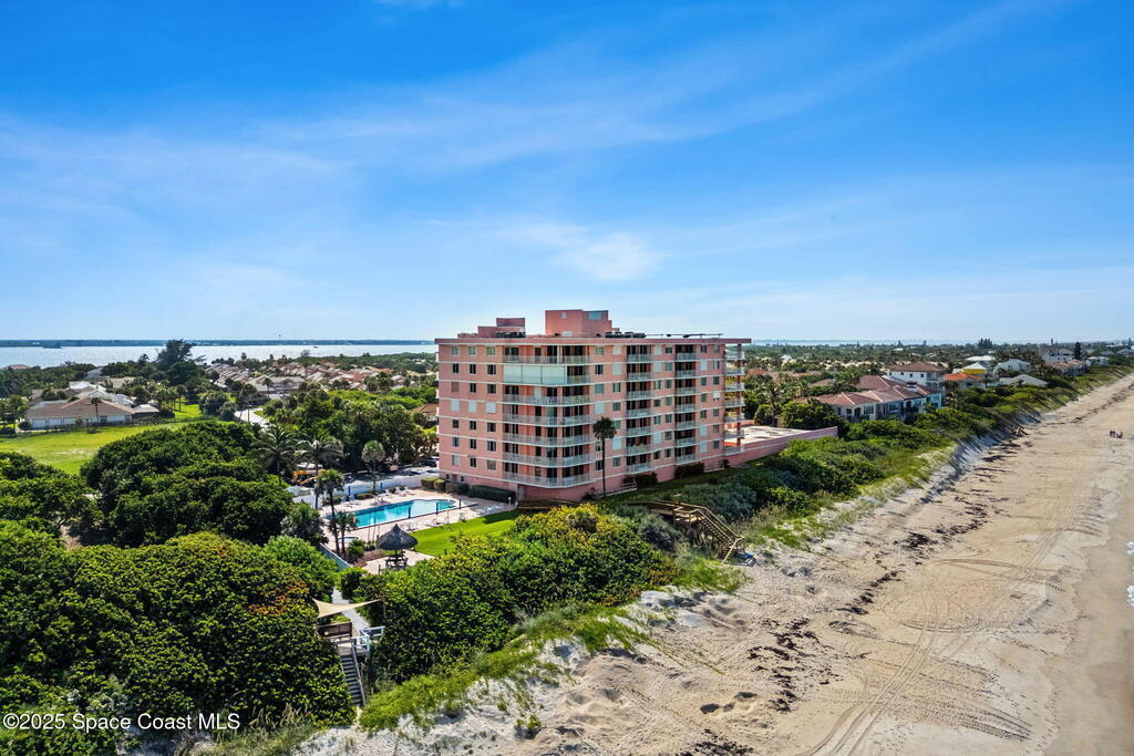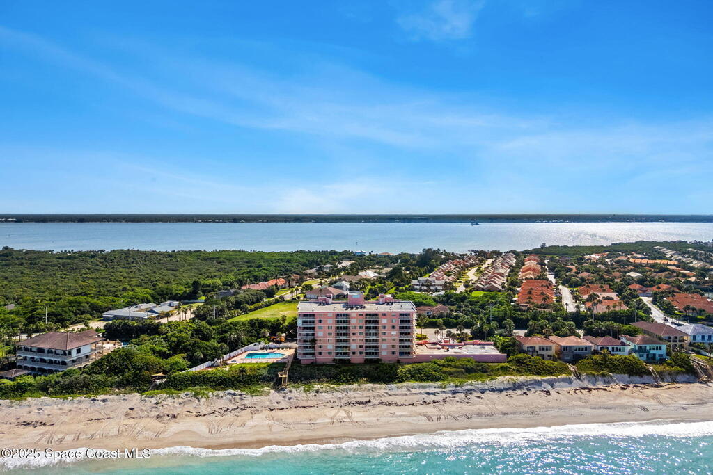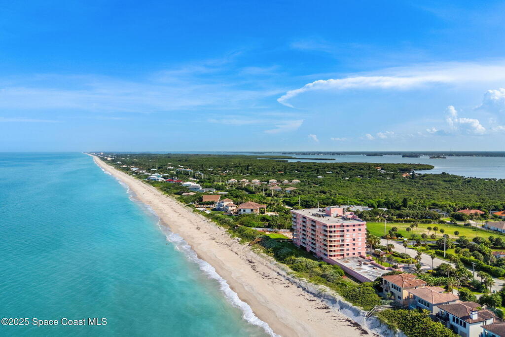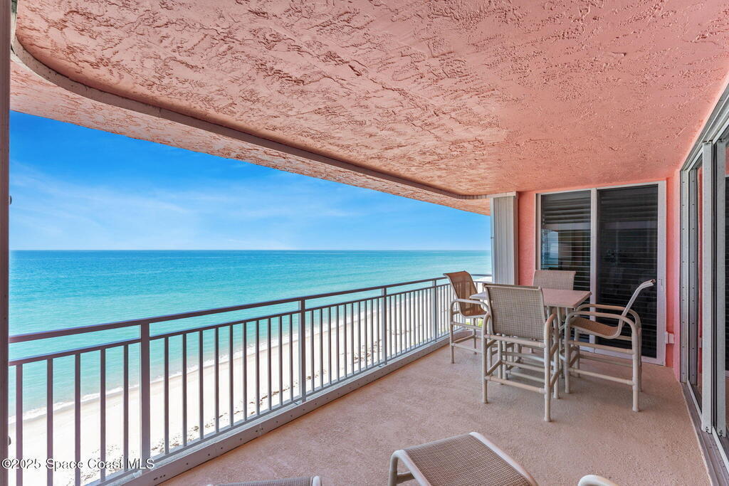 8th floor elevation, boutique privacy, endless blue. Perched high above the shoreline, a dramatically reimagined oceanfront condo stuns with porcelain tile underfoot, sleek granite & glass countertops, & a wall of glass that spills out to a showstopping balcony accessible from 3 rooms. The kitchen is a statement in function & style, complete with wine fridge, wet bar, & full height cabinetry. A versatile flex space w/closet & ocean views offers the perfect 3rd bedroom setup. The primary suite is pure indulgence, featuring dual closets, jetted tub, frameless glass shower, & private balcony access. Guests are equally pampered in a spacious en suite w/striking tilework & updated finishes. From the wood clad ceiling to the horizon beyond the sliders, every inch is polished, purposeful & positioned for the ultimate coastal experience. Residents enjoy ocean access, a sparkling pool, spa, gym, car wash station, cable, elevators & the quiet charm of Melbourne Beach.