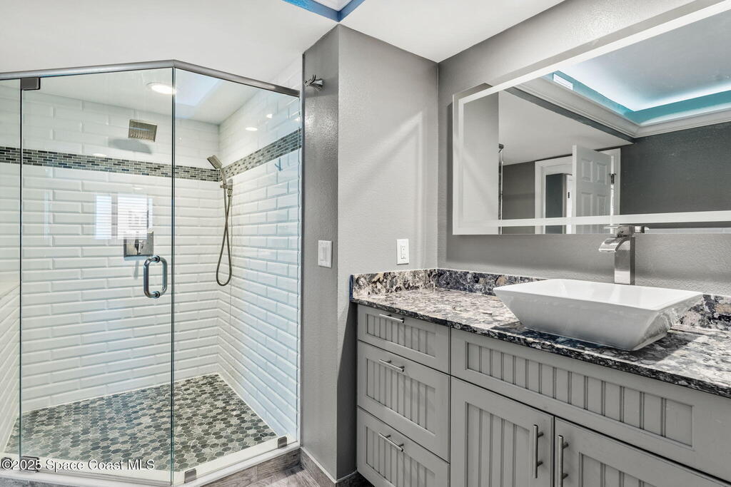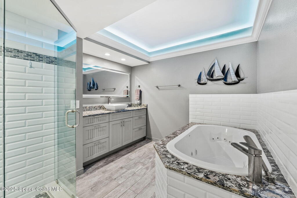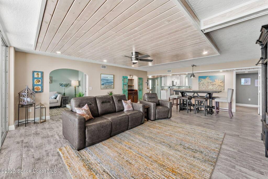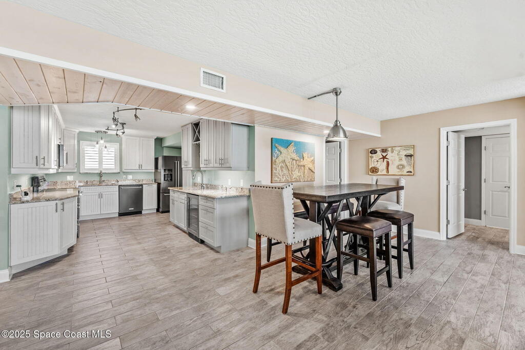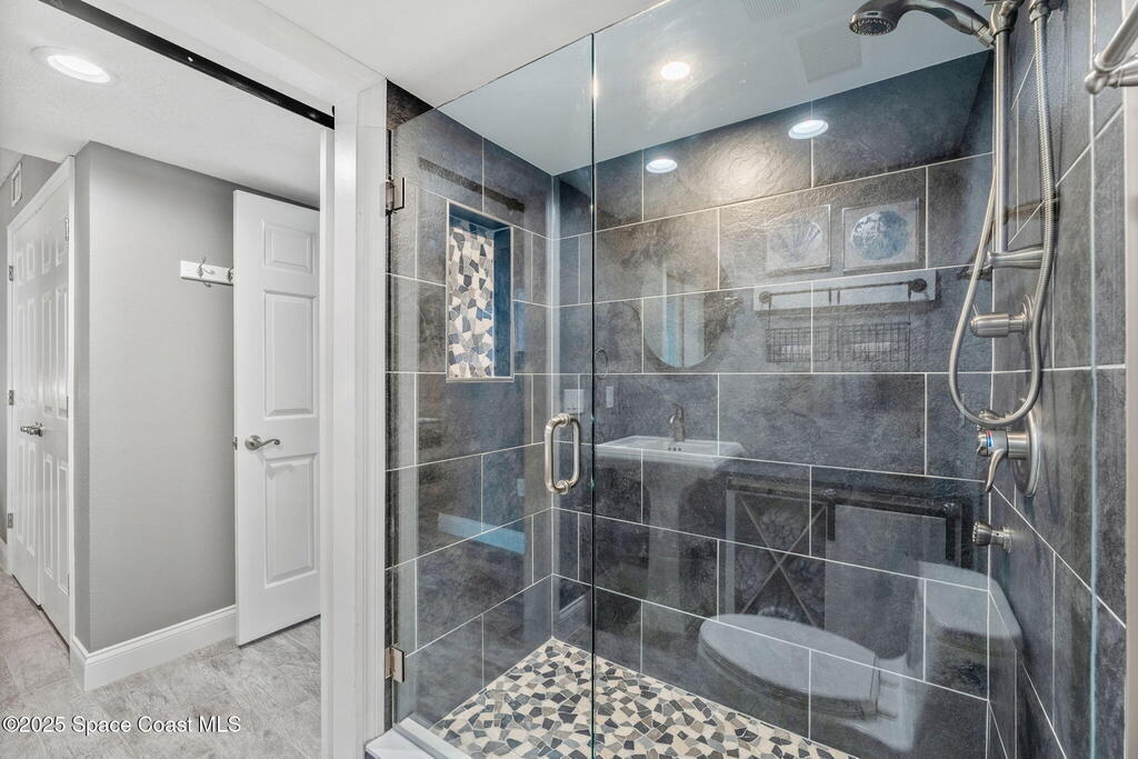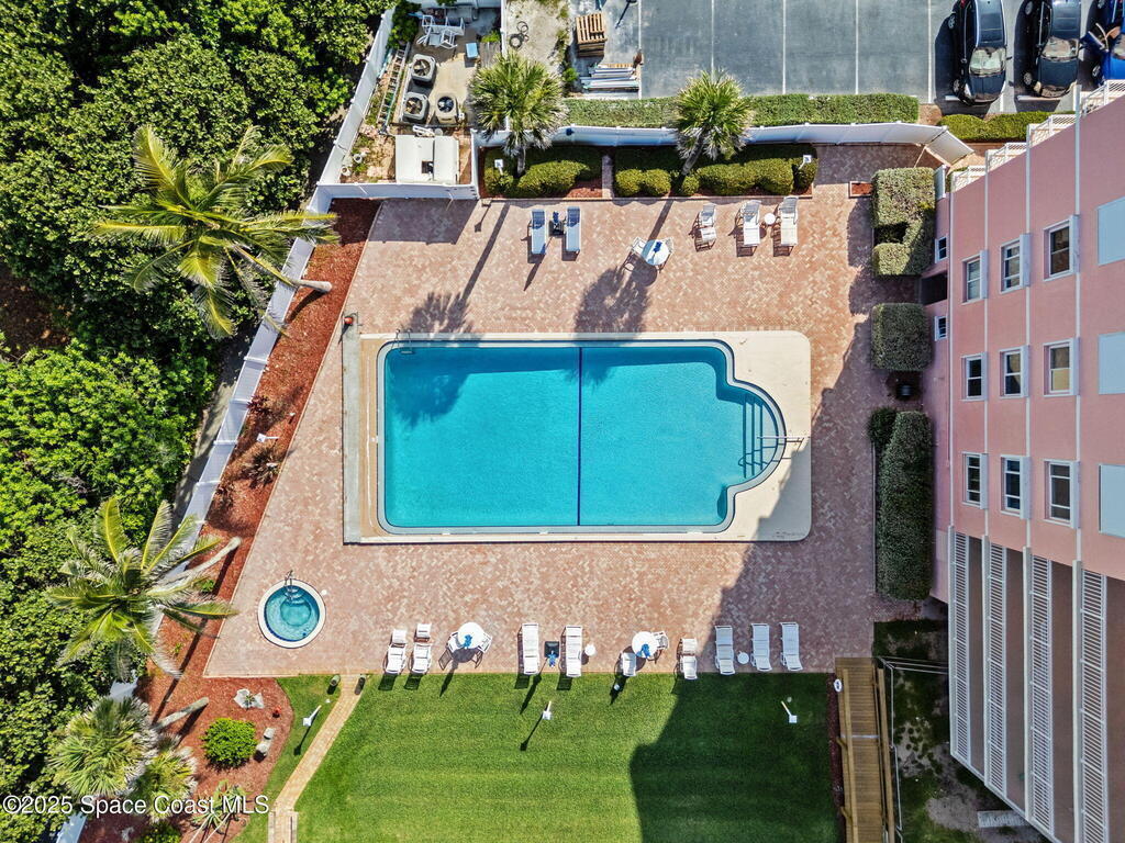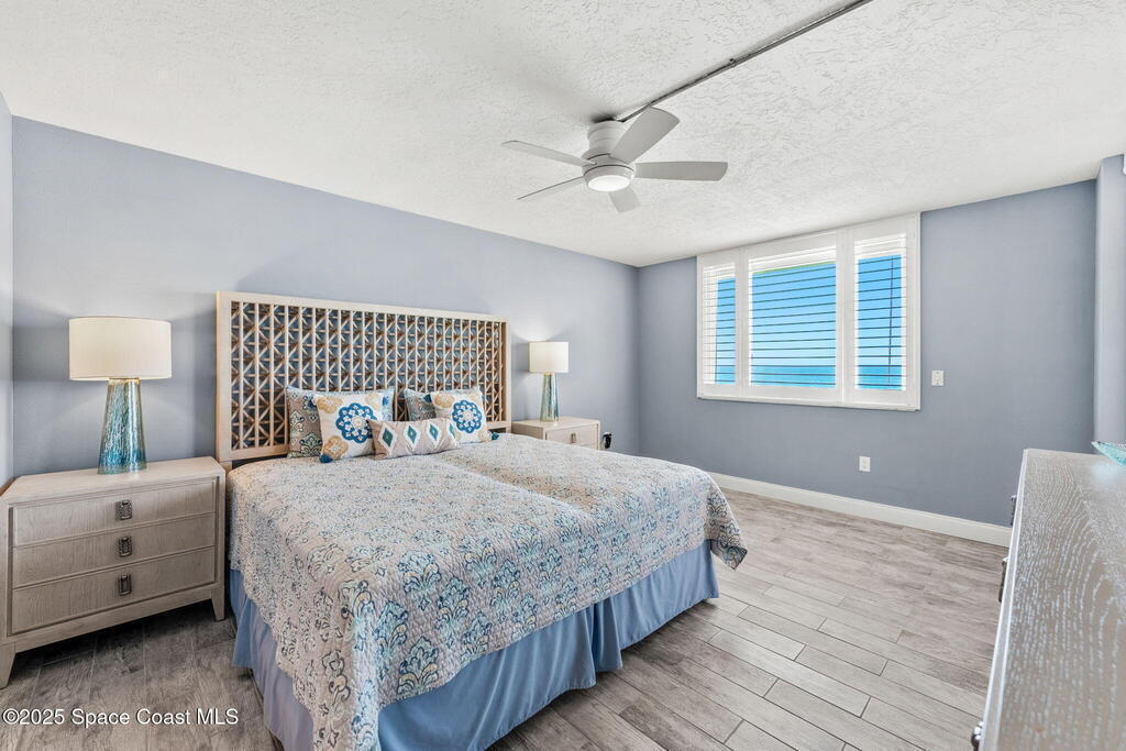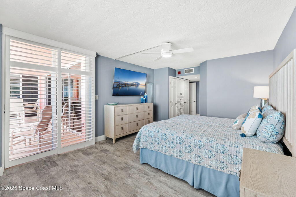 8th floor elevation, boutique privacy, endless blue. Perched high above the shoreline, a dramatically reimagined oceanfront condo stuns with porcelain tile underfoot, sleek granite & glass countertops, & a wall of glass that spills out to a showstopping balcony accessible from 3 rooms. The kitchen is a statement in function & style, complete with wine fridge, wet bar, & full height cabinetry. A versatile flex space w/closet & ocean views offers the perfect 3rd bedroom setup. The primary suite is pure indulgence, featuring dual closets, jetted tub, frameless glass shower, & private balcony access. Guests are equally pampered in a spacious en suite w/striking tilework & updated finishes. From the wood clad ceiling to the horizon beyond the sliders, every inch is polished, purposeful & positioned for the ultimate coastal experience. Residents enjoy ocean access, a sparkling pool, spa, gym, car wash station, cable, elevators & the quiet charm of Melbourne Beach.