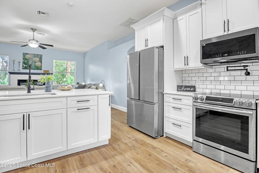 SELLER MOTIVATED 15k price reduction! Welcome to an exceptional opportunity in the gated enclave of Sanctuary II Meticulously updated single-family home that blends comfort, style and peace of mind. 2025 roof: brand new, bringing long-term peace of mind. New A/C system: installed recently, ensuring comfortable climate control. Kitchen = show-stopper: all plywood cabinets, quartz countertops, breakfast bar with bay window. Dual living spaces: includes a formal dining area plus a second living/family room off the kitchen with a charming gas fireplace. Great flexibility for office/play/entertaining. Reclaimed water system: supports landscaping, helping maintain a green yard year-round. The generous master suite provides a retreat: porch access, deep soaking tub, and premium closet space. Positioned within a quiet, gated community offering privacy and low traffic--great for families or professionals seeking retreat-style living.
