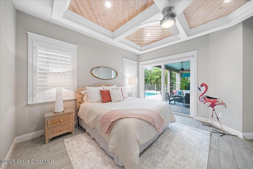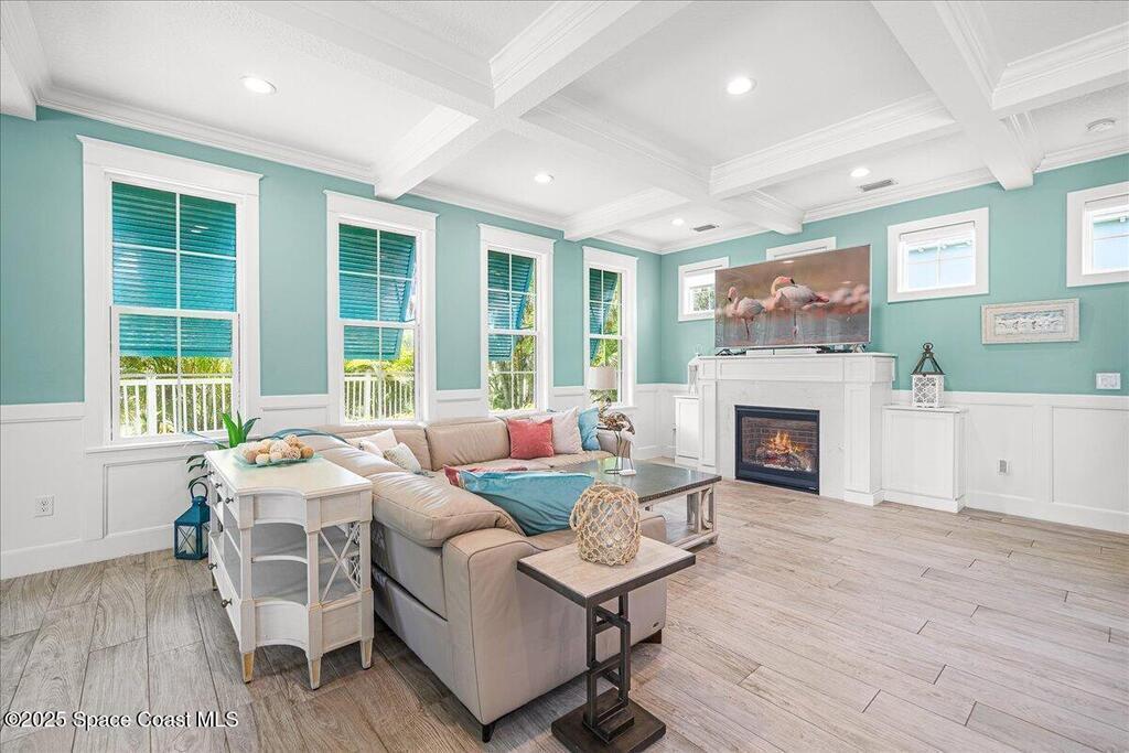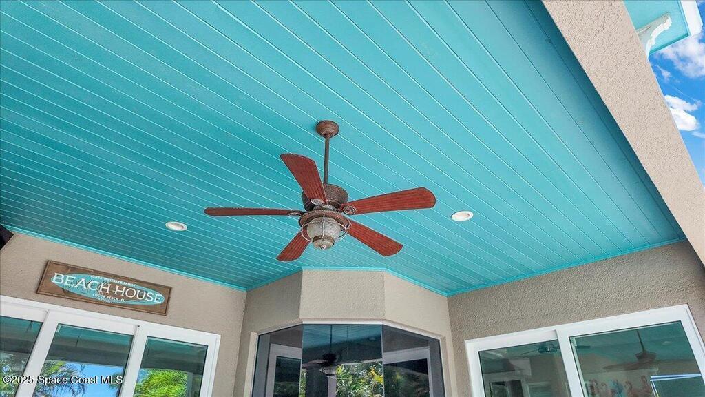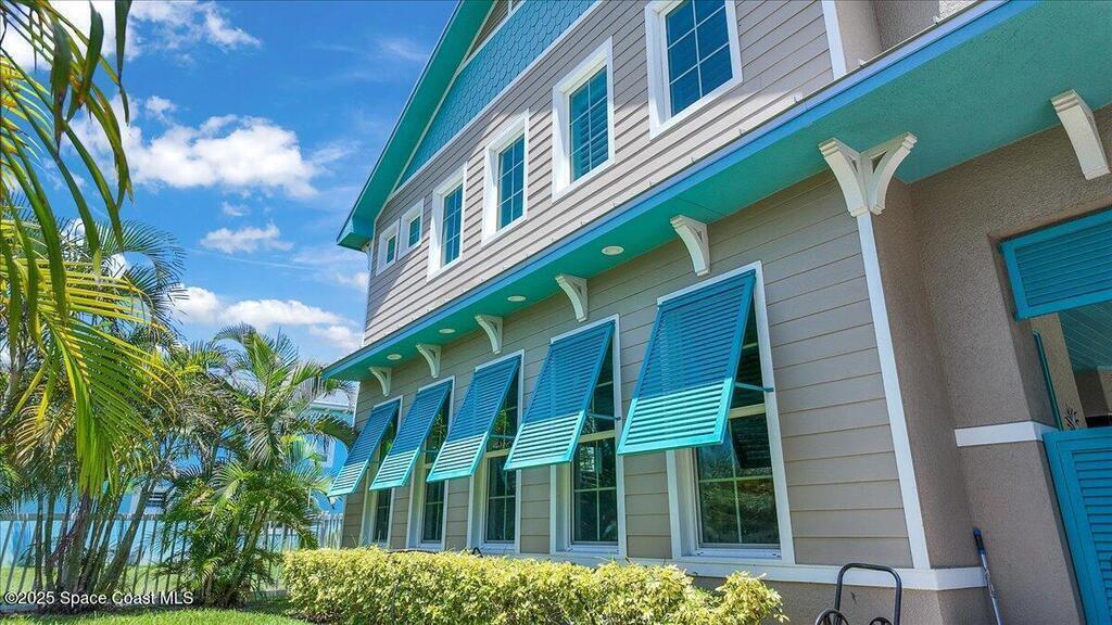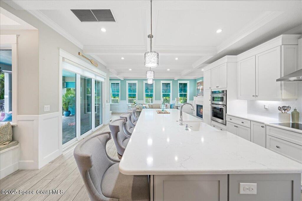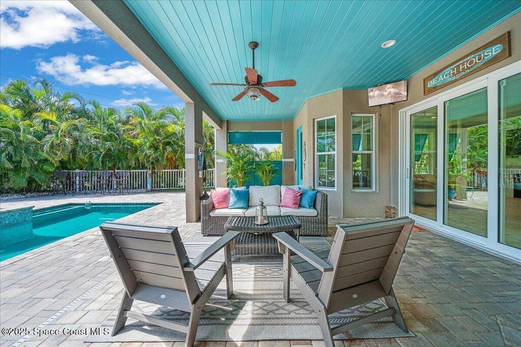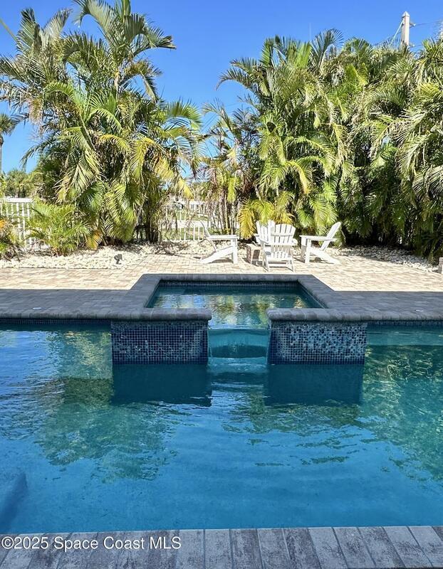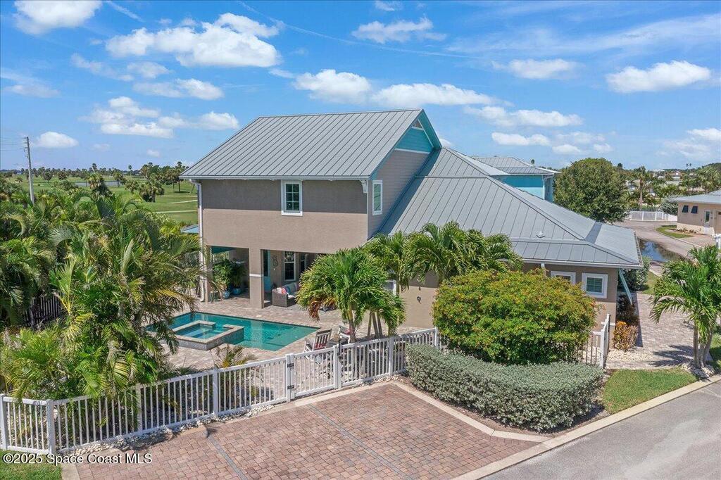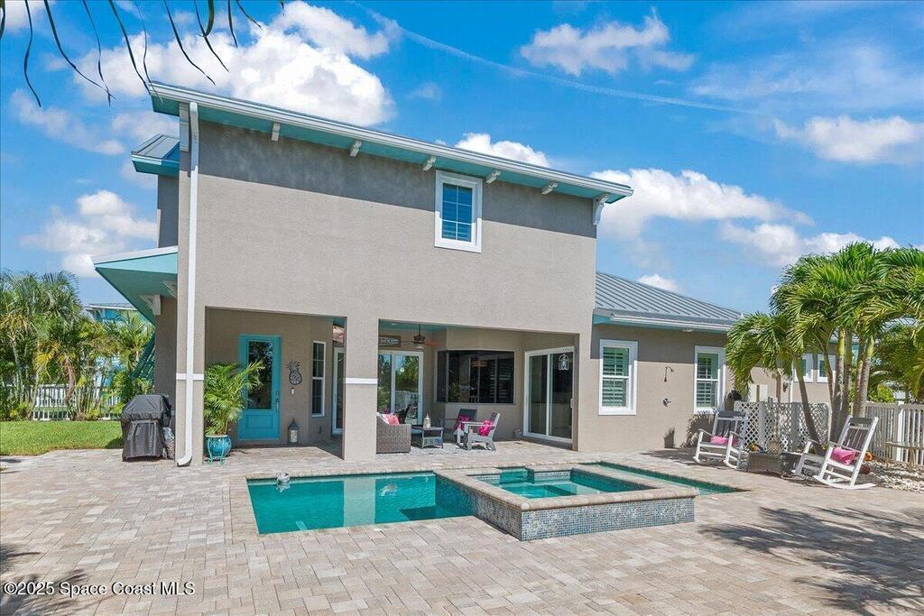 Welcome to this Key West-style custom stunner in the coveted Golf Cottages at Cocoa Beach. Built in 2017, this 2,863 sq. ft. residence sits on a 0.21-acre lot along the Cocoa Beach Golf Course and was designed with comfort, style, and multigenerational living in mind.Inside, you'll find 3 bedrooms and 3.5 baths, including two en suites--one on the main level and another upstairs paired with a second living area and a third bedroom. The soaring custom ceilings include coffered, vaulted, and tongue-and-groove finishes, adding to the home's character and craftsmanship.The gourmet kitchen is a chef's dream, boasting high-end stainless steel appliances including a convection cooktop, double oven, beverage refrigerator, farmhouse sink, and a large quartz island. Its crisp all-white cabinetry is beautifully accented with tan and turquoise design touches that echo Cocoa Beach's coastal charm.Step outside to your own tropical oasis: a saltwater pool with heated spa, surrounded by mature