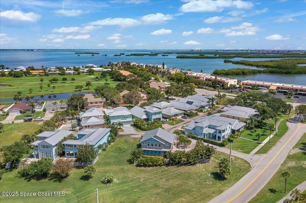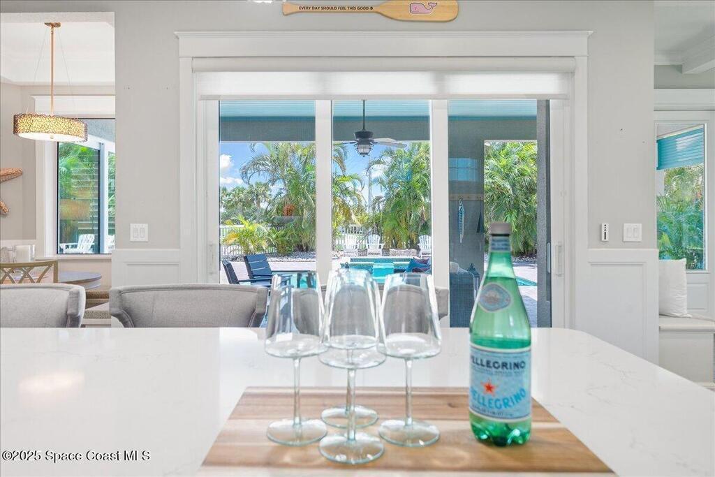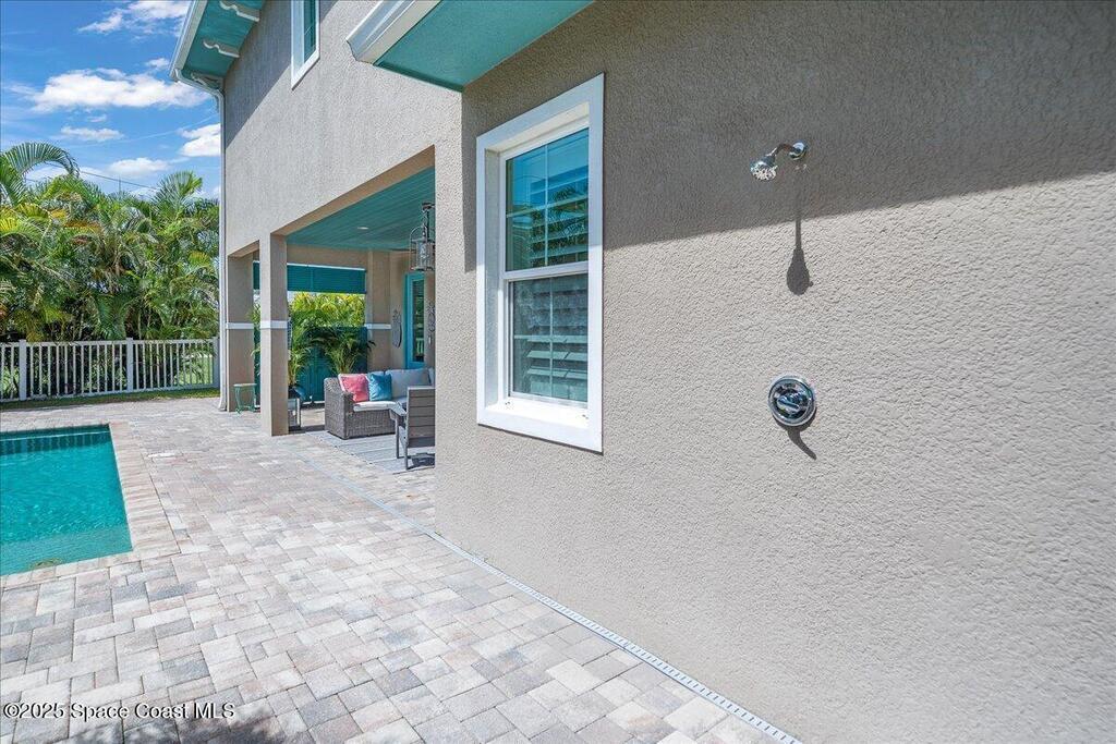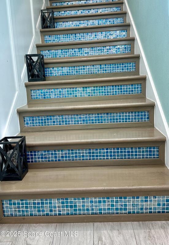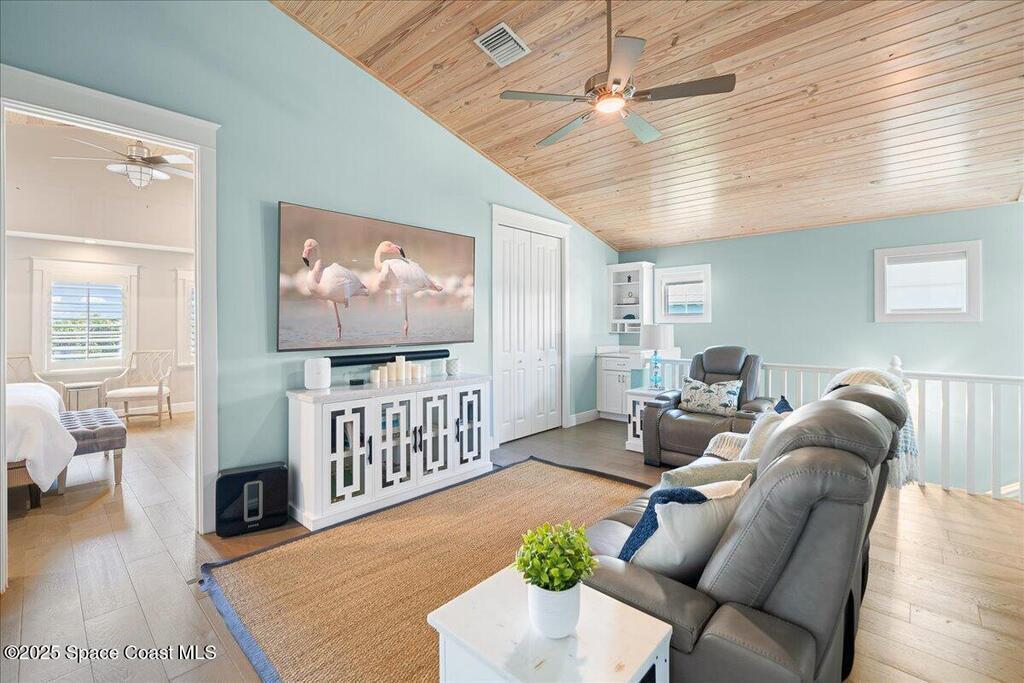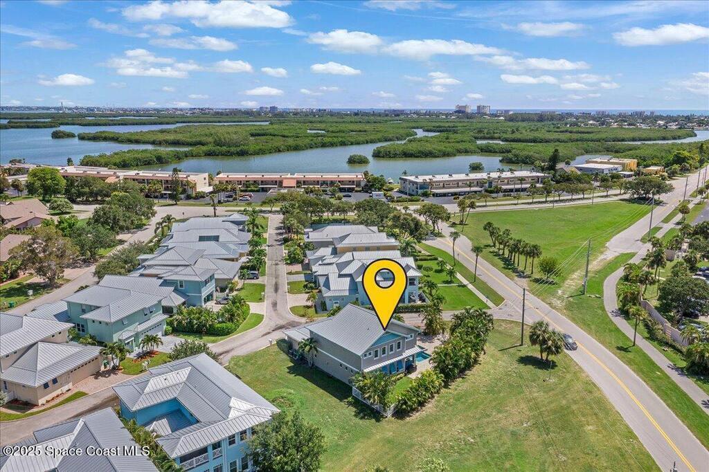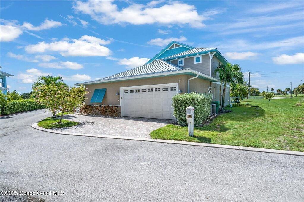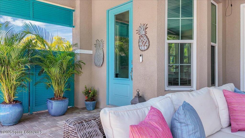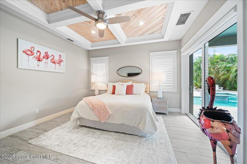 Welcome to this Key West-style custom stunner in the coveted Golf Cottages at Cocoa Beach. Built in 2017, this 2,863 sq. ft. residence sits on a 0.21-acre lot along the Cocoa Beach Golf Course and was designed with comfort, style, and multigenerational living in mind.Inside, you'll find 3 bedrooms and 3.5 baths, including two en suites--one on the main level and another upstairs paired with a second living area and a third bedroom. The soaring custom ceilings include coffered, vaulted, and tongue-and-groove finishes, adding to the home's character and craftsmanship.The gourmet kitchen is a chef's dream, boasting high-end stainless steel appliances including a convection cooktop, double oven, beverage refrigerator, farmhouse sink, and a large quartz island. Its crisp all-white cabinetry is beautifully accented with tan and turquoise design touches that echo Cocoa Beach's coastal charm.Step outside to your own tropical oasis: a saltwater pool with heated spa, surrounded by mature