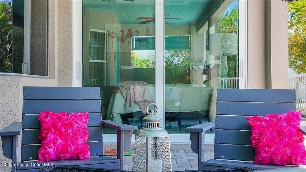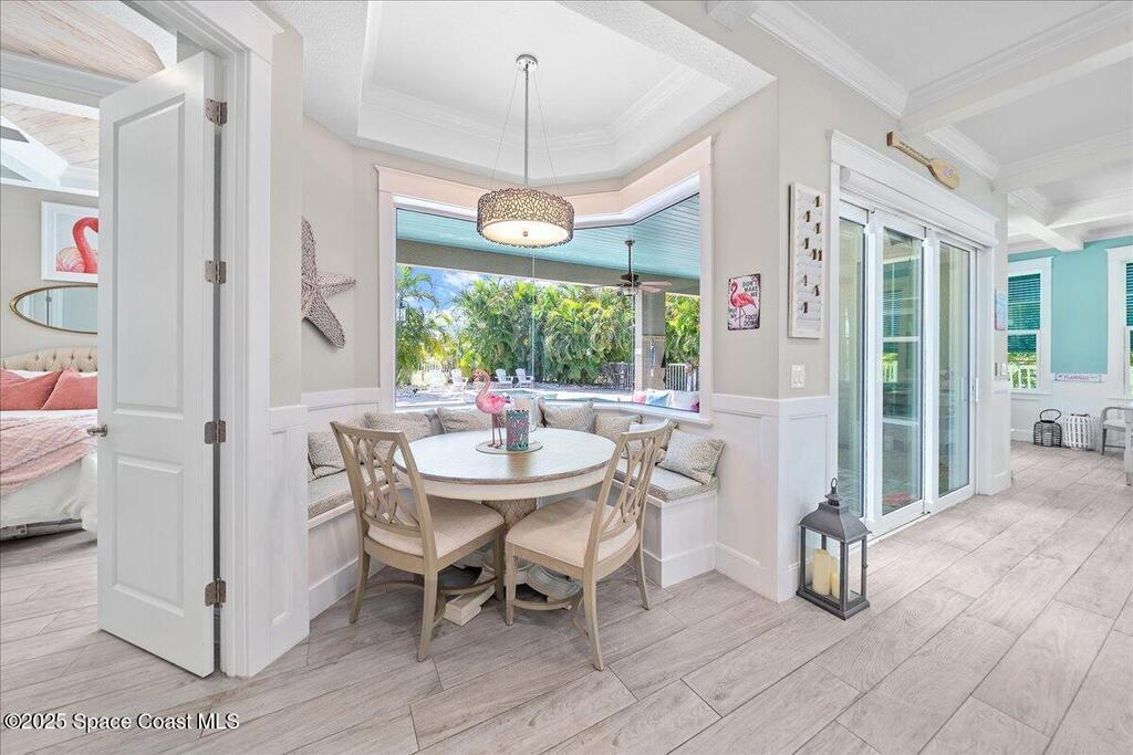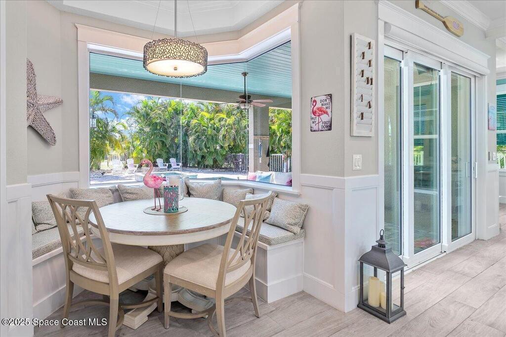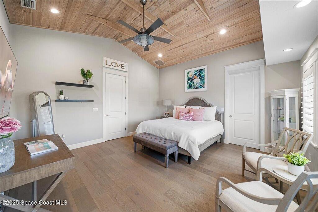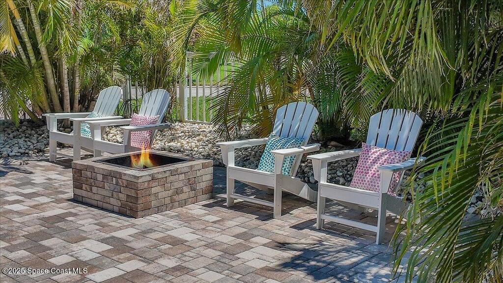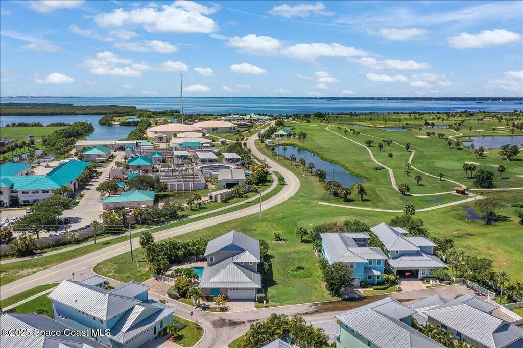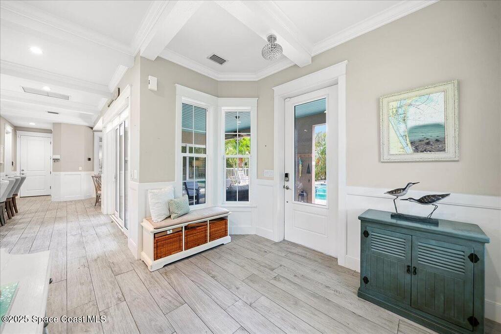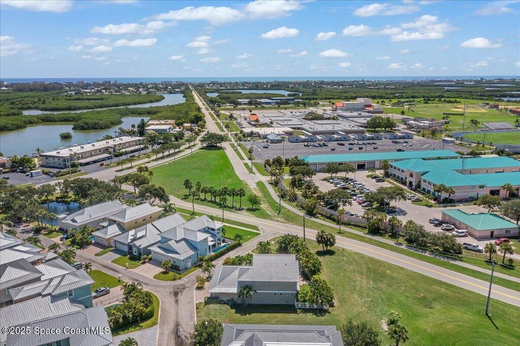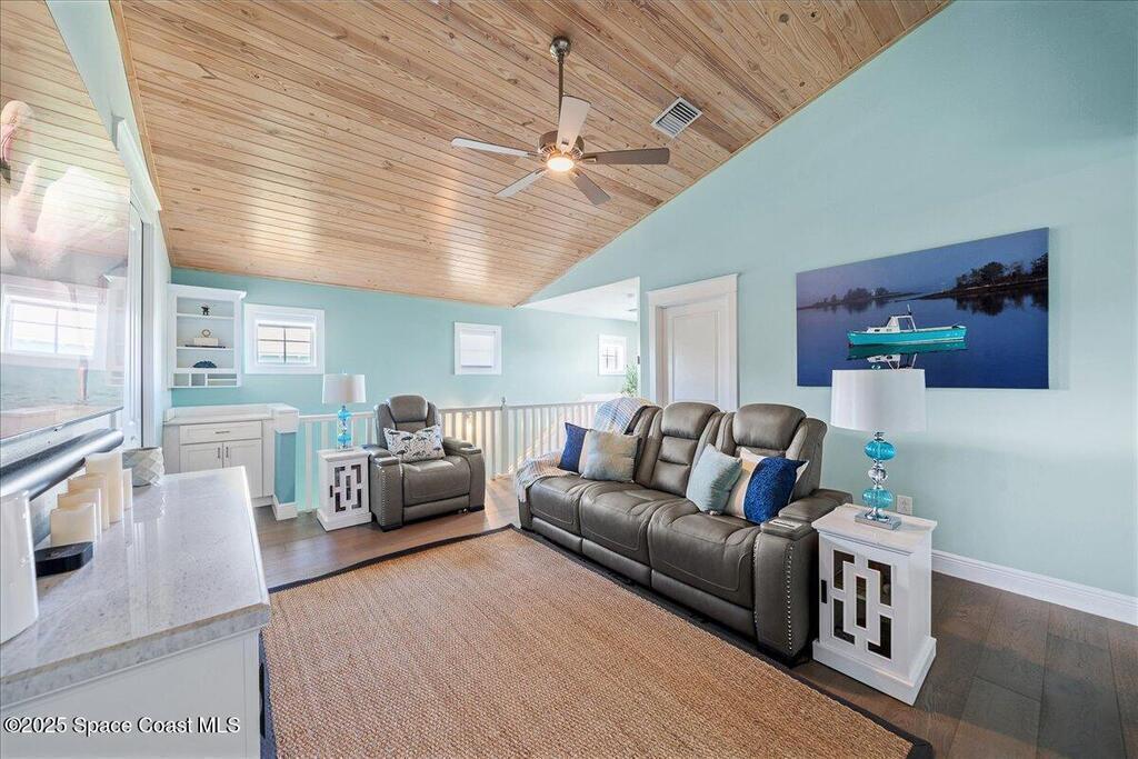 Welcome to this Key West-style custom stunner in the coveted Golf Cottages at Cocoa Beach. Built in 2017, this 2,863 sq. ft. residence sits on a 0.21-acre lot along the Cocoa Beach Golf Course and was designed with comfort, style, and multigenerational living in mind.Inside, you'll find 3 bedrooms and 3.5 baths, including two en suites--one on the main level and another upstairs paired with a second living area and a third bedroom. The soaring custom ceilings include coffered, vaulted, and tongue-and-groove finishes, adding to the home's character and craftsmanship.The gourmet kitchen is a chef's dream, boasting high-end stainless steel appliances including a convection cooktop, double oven, beverage refrigerator, farmhouse sink, and a large quartz island. Its crisp all-white cabinetry is beautifully accented with tan and turquoise design touches that echo Cocoa Beach's coastal charm.Step outside to your own tropical oasis: a saltwater pool with heated spa, surrounded by mature