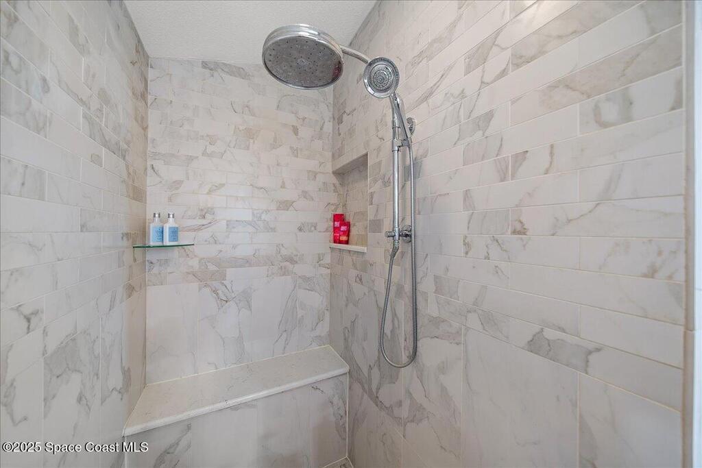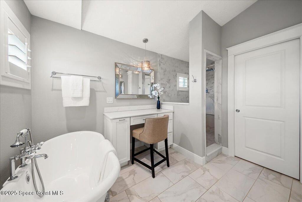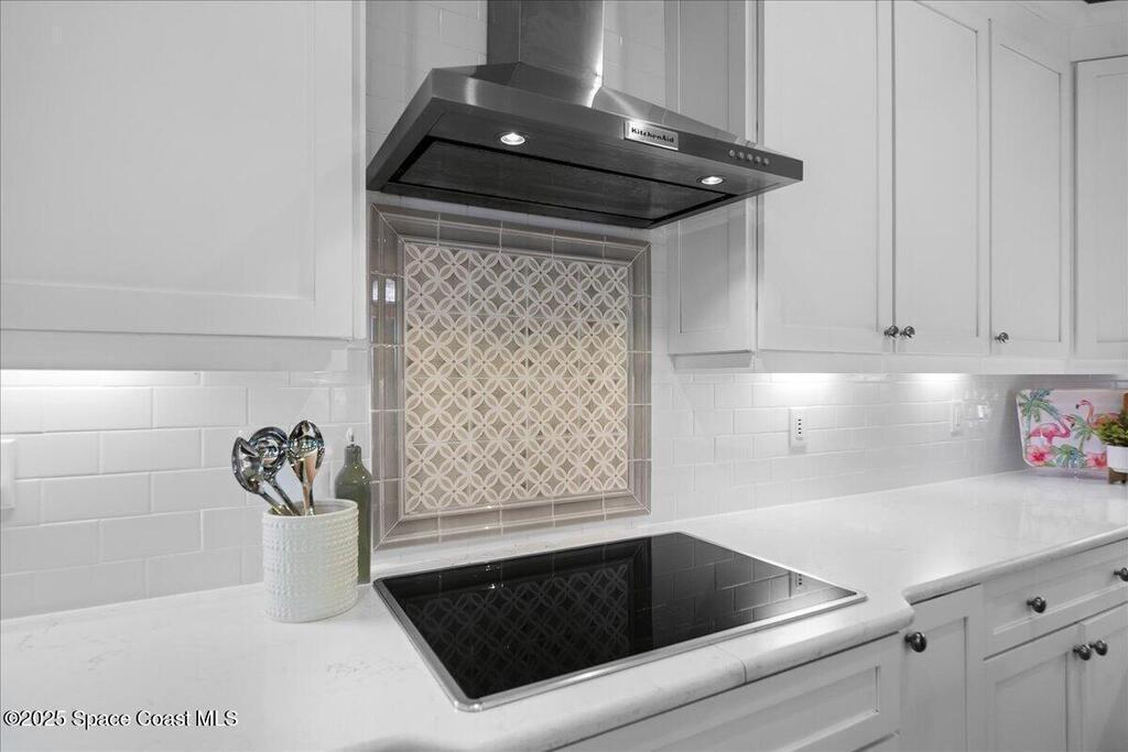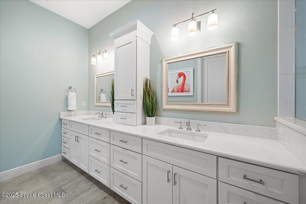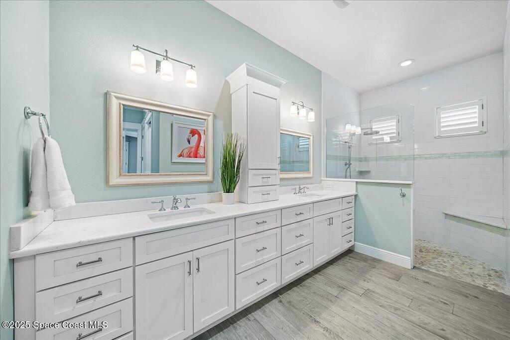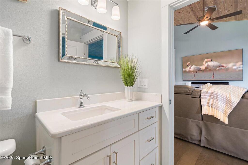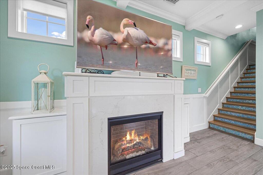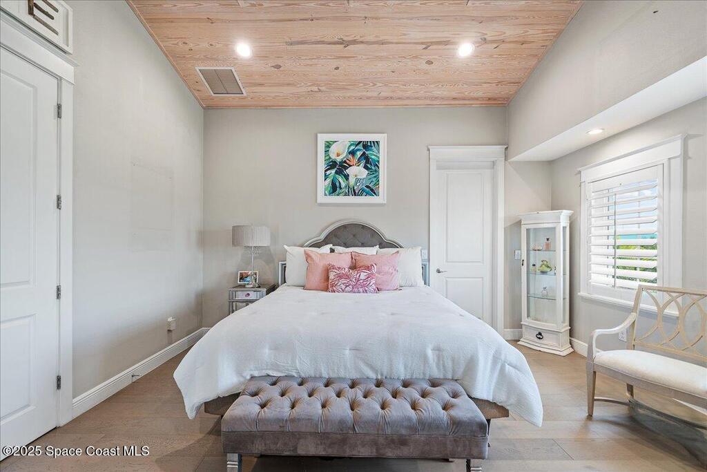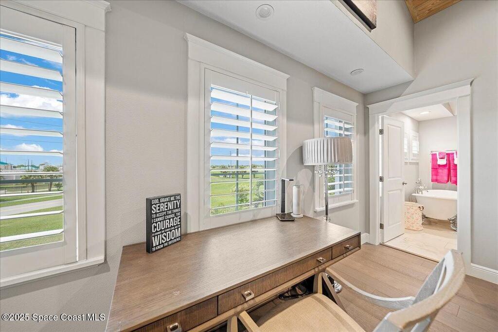 Welcome to this Key West-style custom stunner in the coveted Golf Cottages at Cocoa Beach. Built in 2017, this 2,863 sq. ft. residence sits on a 0.21-acre lot along the Cocoa Beach Golf Course and was designed with comfort, style, and multigenerational living in mind.Inside, you'll find 3 bedrooms and 3.5 baths, including two en suites--one on the main level and another upstairs paired with a second living area and a third bedroom. The soaring custom ceilings include coffered, vaulted, and tongue-and-groove finishes, adding to the home's character and craftsmanship.The gourmet kitchen is a chef's dream, boasting high-end stainless steel appliances including a convection cooktop, double oven, beverage refrigerator, farmhouse sink, and a large quartz island. Its crisp all-white cabinetry is beautifully accented with tan and turquoise design touches that echo Cocoa Beach's coastal charm.Step outside to your own tropical oasis: a saltwater pool with heated spa, surrounded by mature