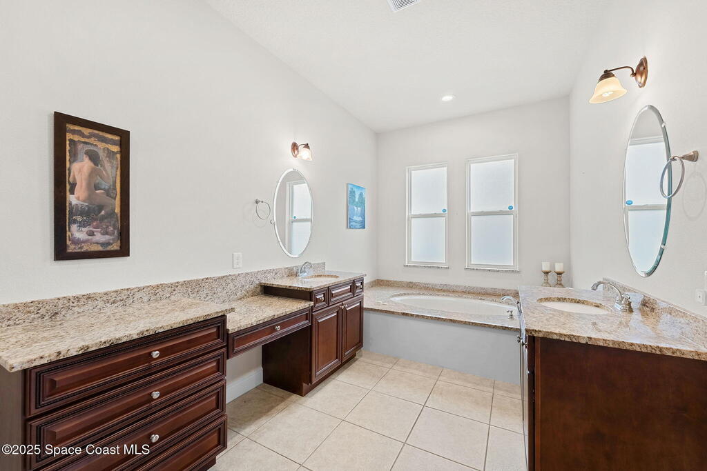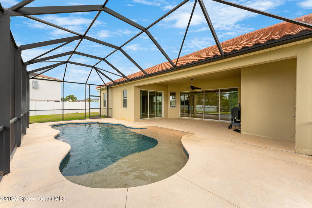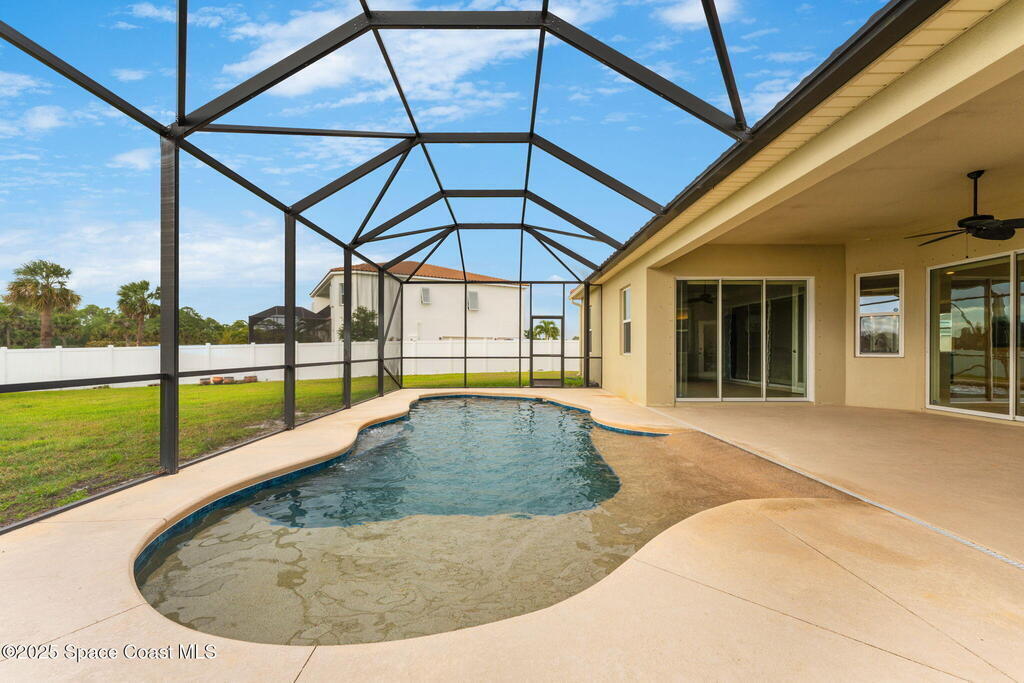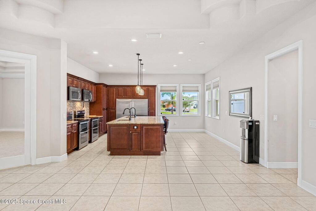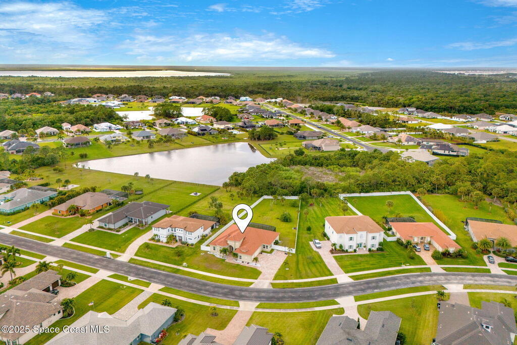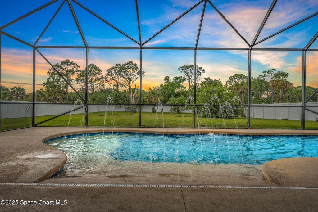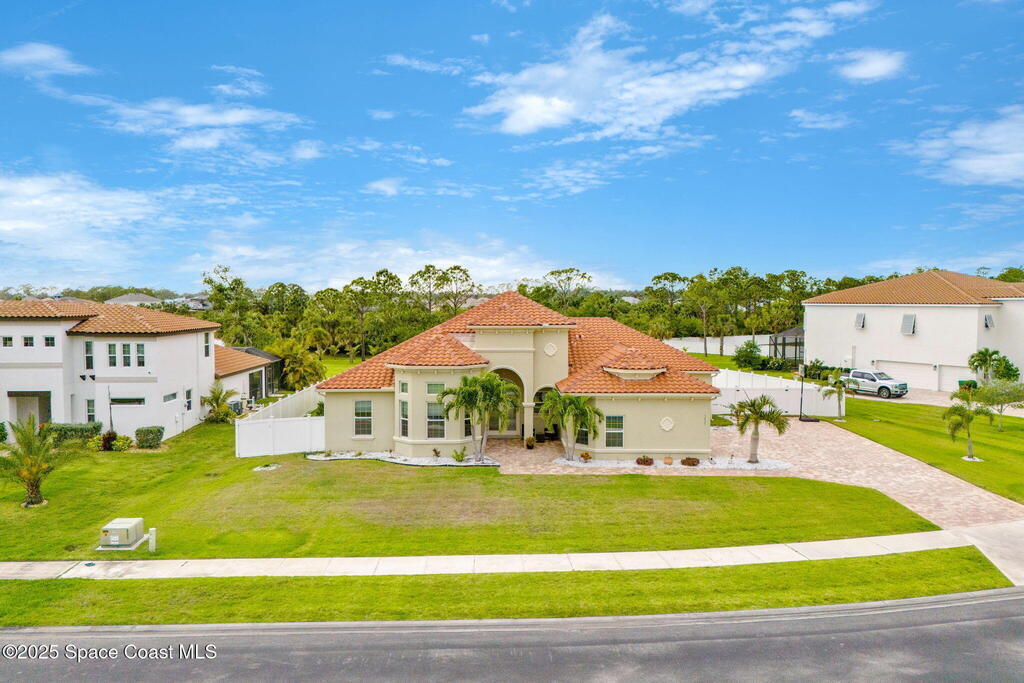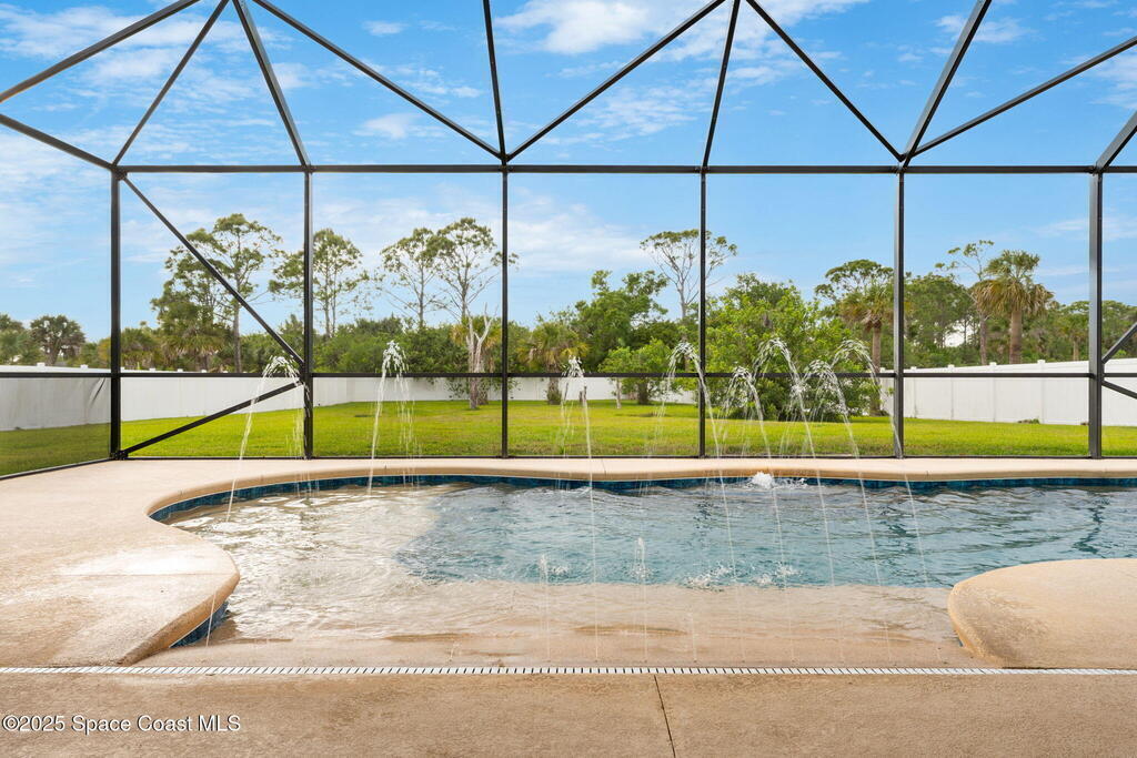 Stunning newer construction 4BR/4BA pool home in gated Woodshire Preserve! Set on a 0.68-acre lot, this 3,193 sq ft home impresses with soaring 12'-14' ceilings, an open split-bedroom layout, and custom saltwater pool featuring beach (zero) entry and decorative fountain. The gourmet ''Kosher'' kitchen includes a butler's pantry with prep sink, perfect for entertaining. The spacious primary suite offers a luxurious ensuite with soaking tub, walk-in shower, and dual vanities. Generous secondary bedrooms, oversized laundry room with utility sink, and tile flooring throughout main areas adds comfort and functionality. A/C has 8 years remaining on 10-year warranty. Located near top-rated Brevard County schools and just minutes from shopping, dining, golf, and medical in the heart of Viera. This home blends space, elegance and convenience--inside and out.