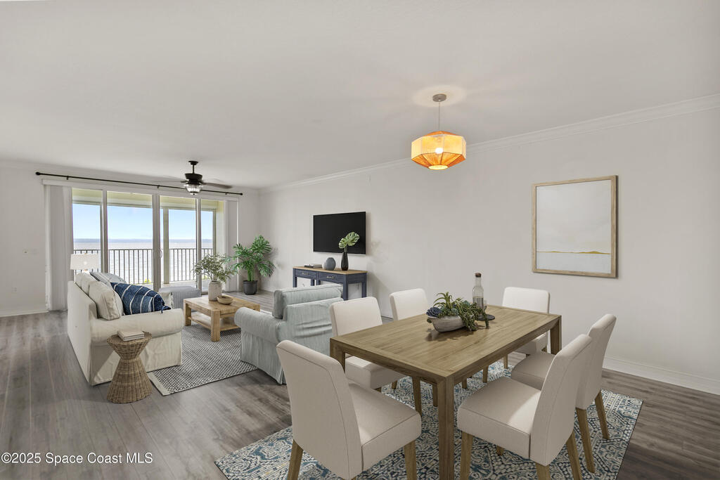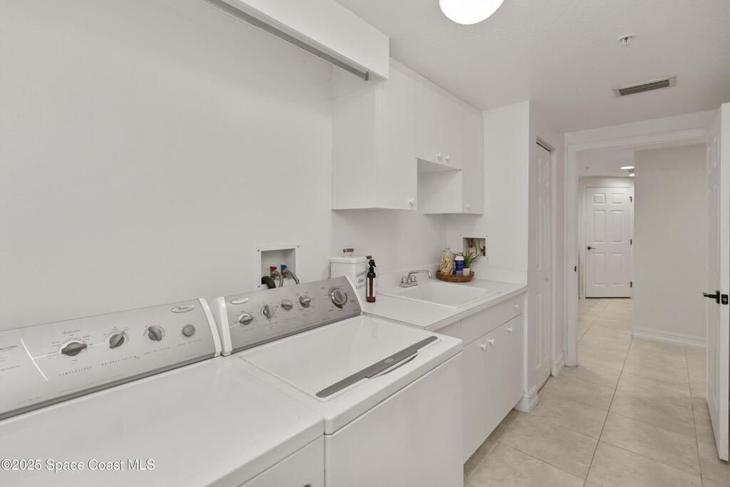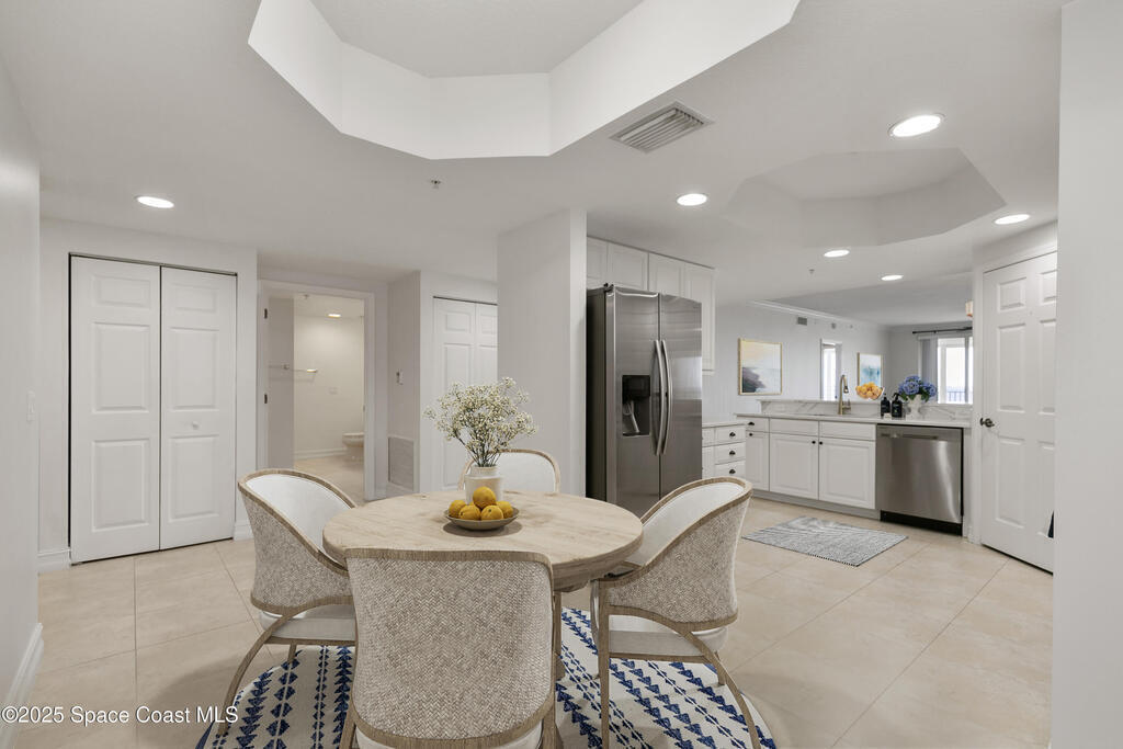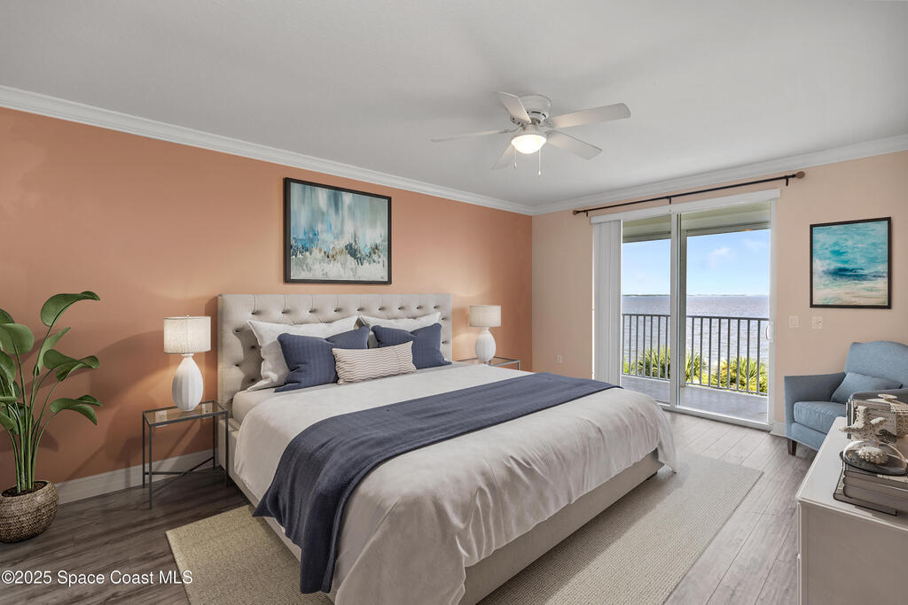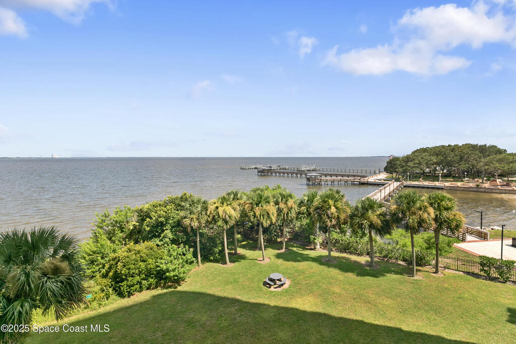 Stunning 3BD/2BA condo in coveted Building 7 with breathtaking views of the Indian River and Kennedy Space Center. This spacious unit features an open floor plan, white kitchen cabinets, quartz countertops, and stainless-steel appliances. Enjoy incredible water views from main living areas and the primary suite. The huge in-unit laundry room and newer HVAC add comfort and convenience. One-car garage provides ample storage. HOA reserve requirements have been fully met, offering buyers peace of mind.Resort-style amenities include pool, spa, fitness center, sauna, community room with kitchen, pickleball and basketball courts, private dock, plus regular social events hosted by the association. This unit is located close to visitor parking and within walking distance to Historic Downtown Titusville's shops, restaurants, coffee spots, playhouse, and art studio. This is luxury coastal living at its best! Some photos virtually staged