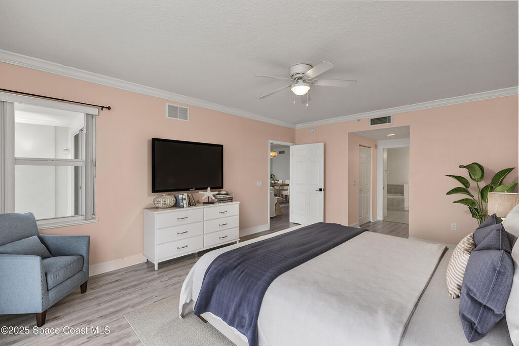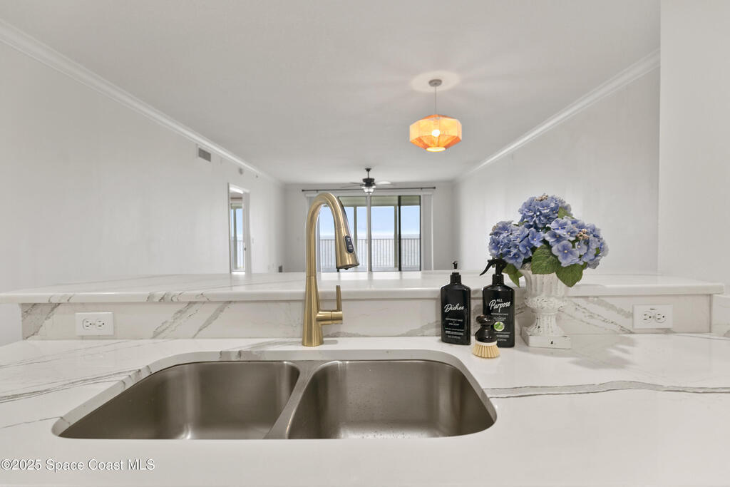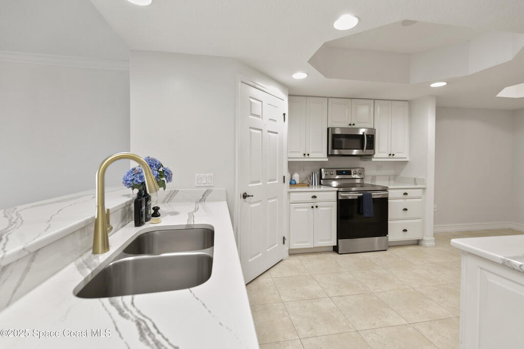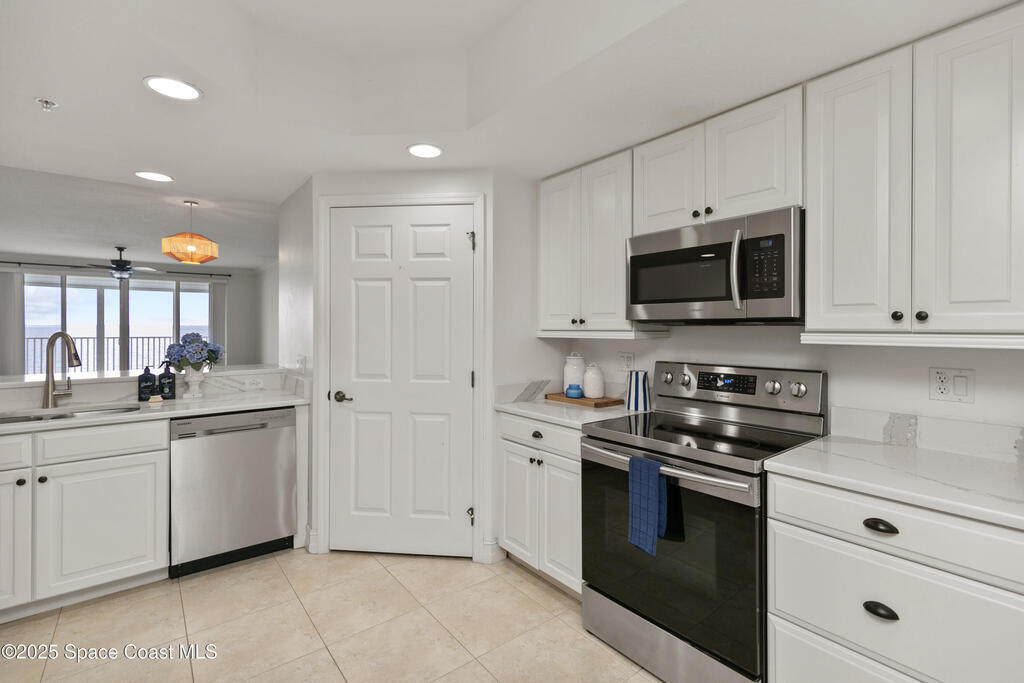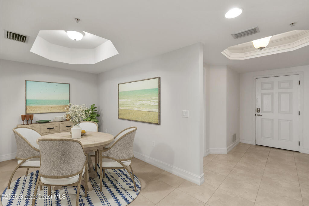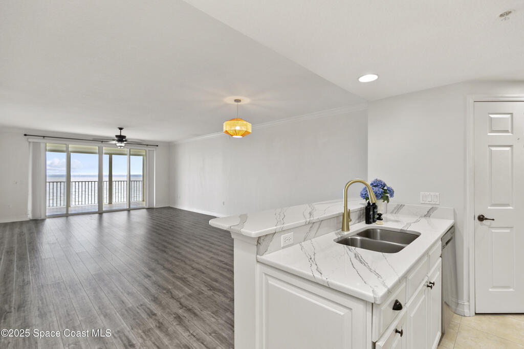 Stunning 3BD/2BA condo in coveted Building 7 with breathtaking views of the Indian River and Kennedy Space Center. This spacious unit features an open floor plan, white kitchen cabinets, quartz countertops, and stainless-steel appliances. Enjoy incredible water views from main living areas and the primary suite. The huge in-unit laundry room and newer HVAC add comfort and convenience. One-car garage provides ample storage. HOA reserve requirements have been fully met, offering buyers peace of mind.Resort-style amenities include pool, spa, fitness center, sauna, community room with kitchen, pickleball and basketball courts, private dock, plus regular social events hosted by the association. This unit is located close to visitor parking and within walking distance to Historic Downtown Titusville's shops, restaurants, coffee spots, playhouse, and art studio. This is luxury coastal living at its best! Some photos virtually staged