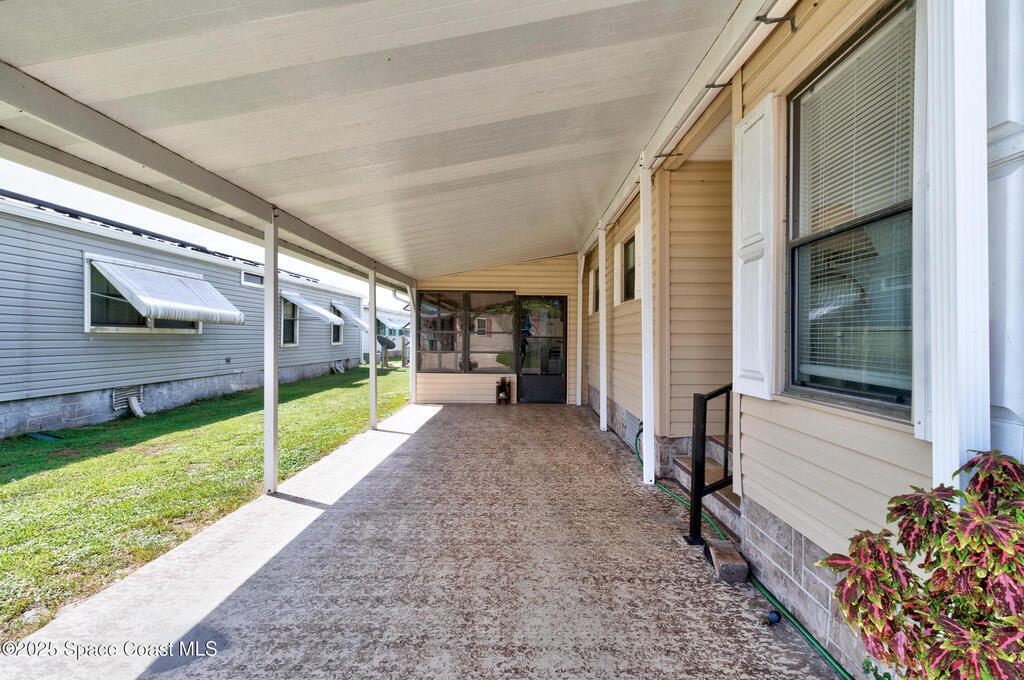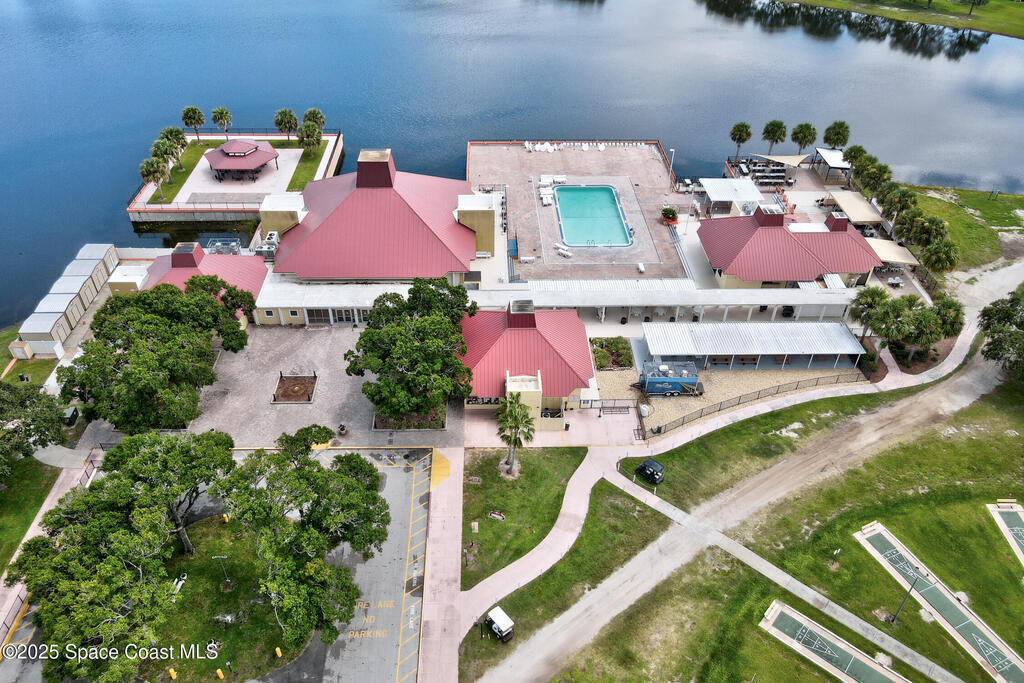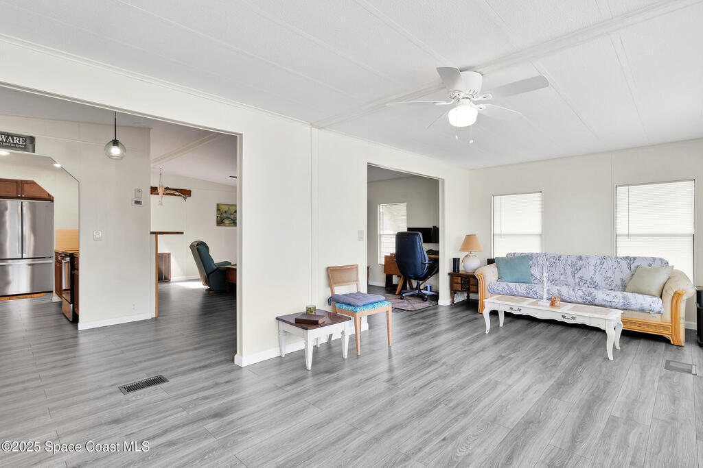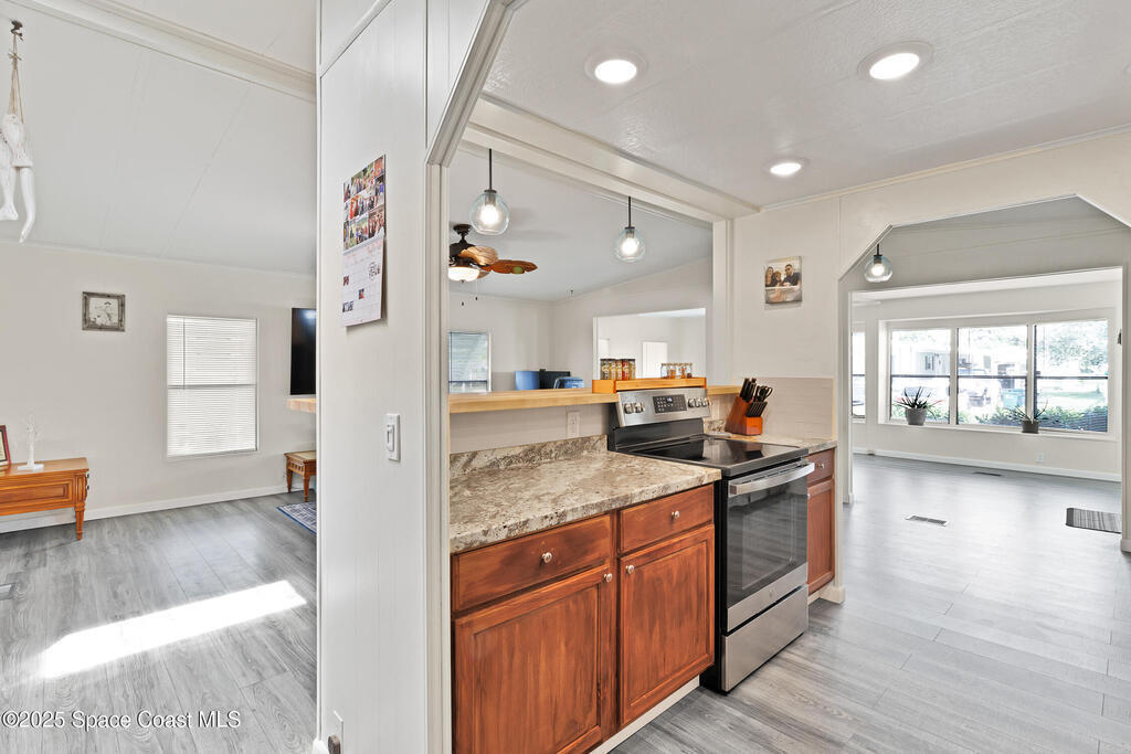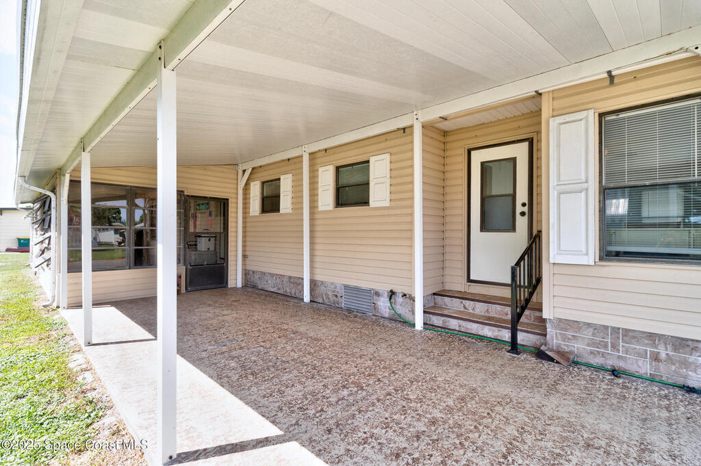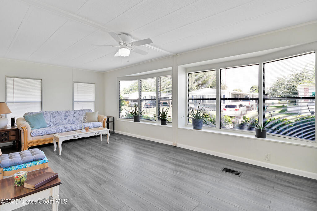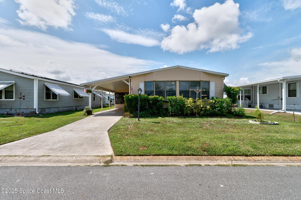 Inviting layout with lots of windows and open floor plan. The kitchen was remodeled and extended in 2023. New cabinets and countertop installed in addition to new stainless steel appliances. New 150-amp electric panel. New vinyl plank waterproof flooring. 5 new ceiling fans. Newer roof. AC 2017. Storm panels & shutters included for your protection. Golf cart and pet friendly community with no lot rent. Lots of amenities and social clubs to keep you busy. Great location in Barefoot Bay and all the way around. Walking distance to the clubhouse and pool and can you believe - you can even watch the shuttle lunches right from your living room?!