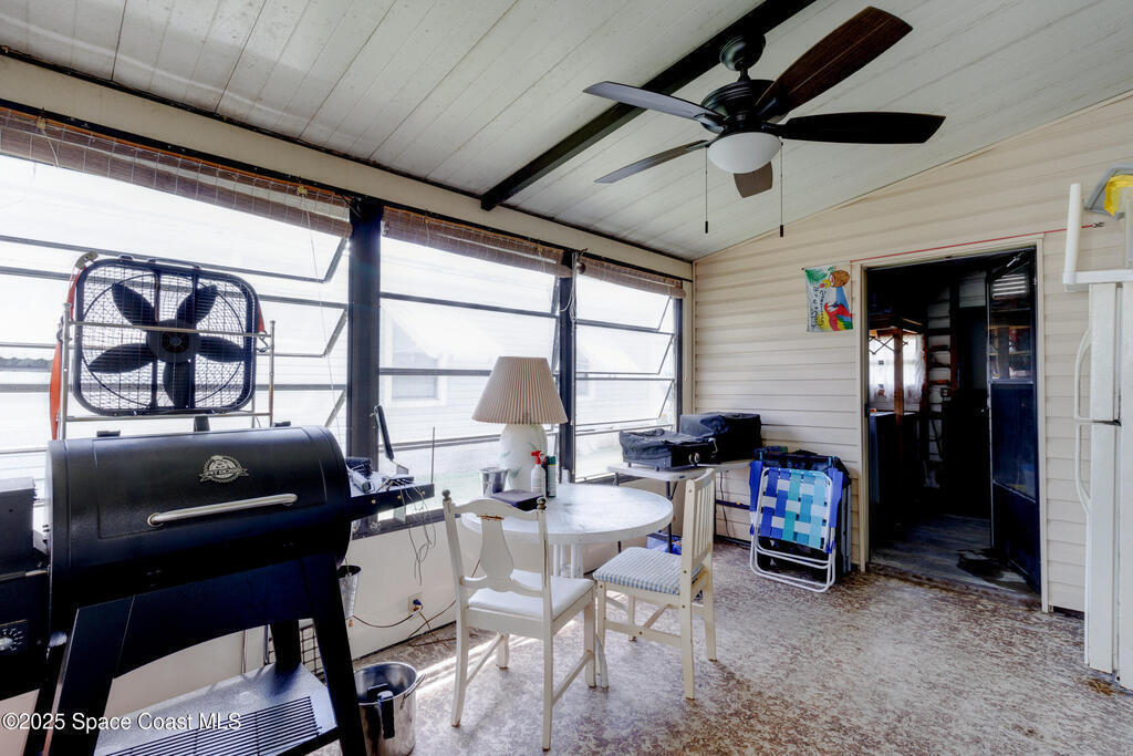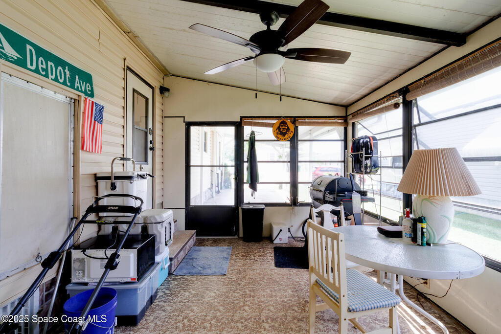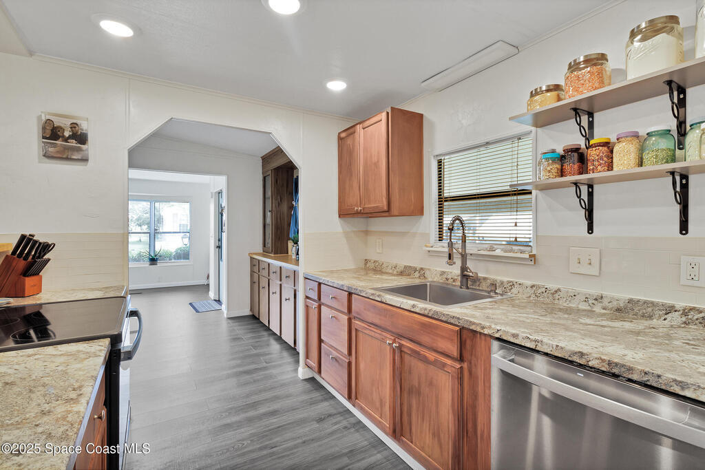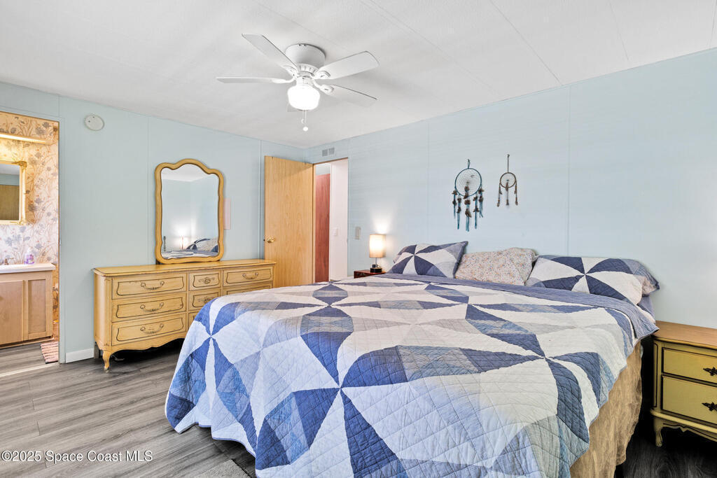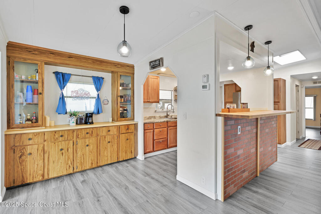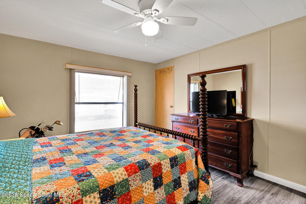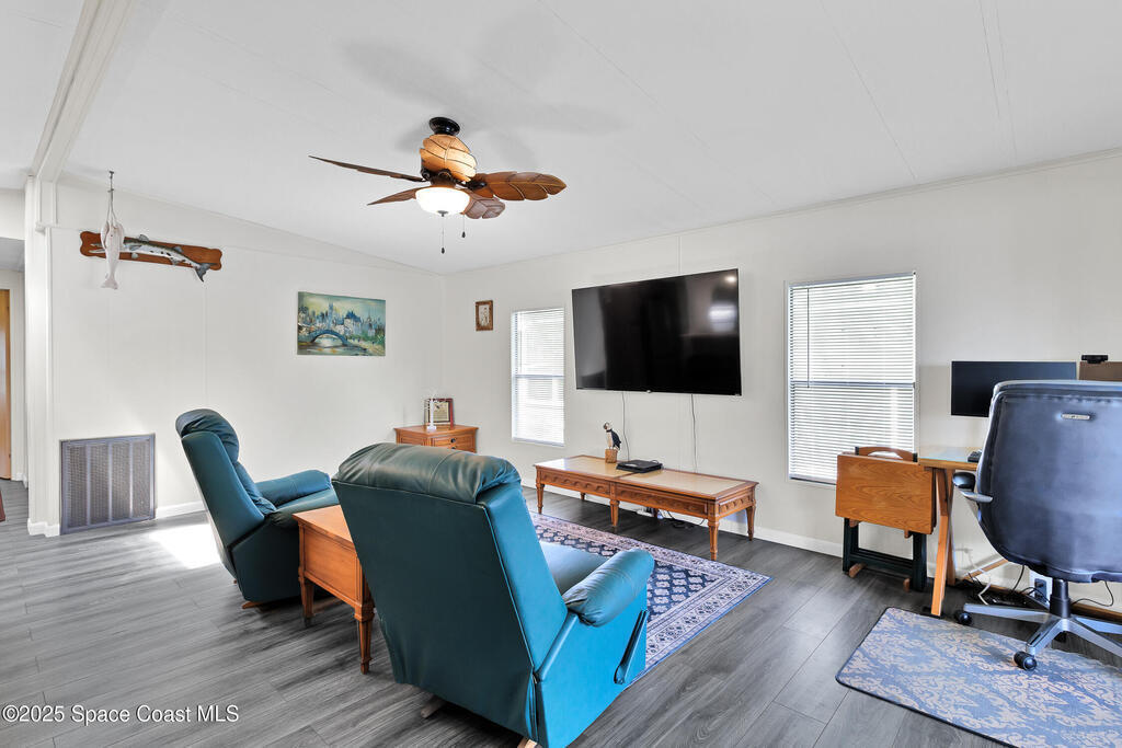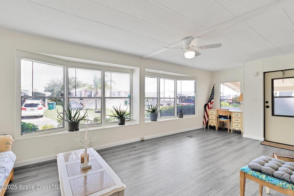 Inviting layout with lots of windows and open floor plan. The kitchen was remodeled and extended in 2023. New cabinets and countertop installed in addition to new stainless steel appliances. New 150-amp electric panel. New vinyl plank waterproof flooring. 5 new ceiling fans. Newer roof. AC 2017. Storm panels & shutters included for your protection. Golf cart and pet friendly community with no lot rent. Lots of amenities and social clubs to keep you busy. Great location in Barefoot Bay and all the way around. Walking distance to the clubhouse and pool and can you believe - you can even watch the shuttle lunches right from your living room?!