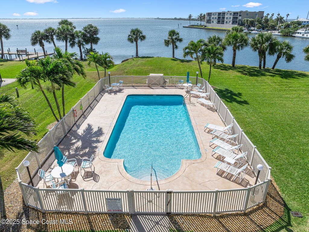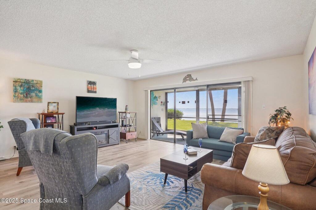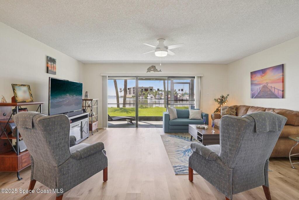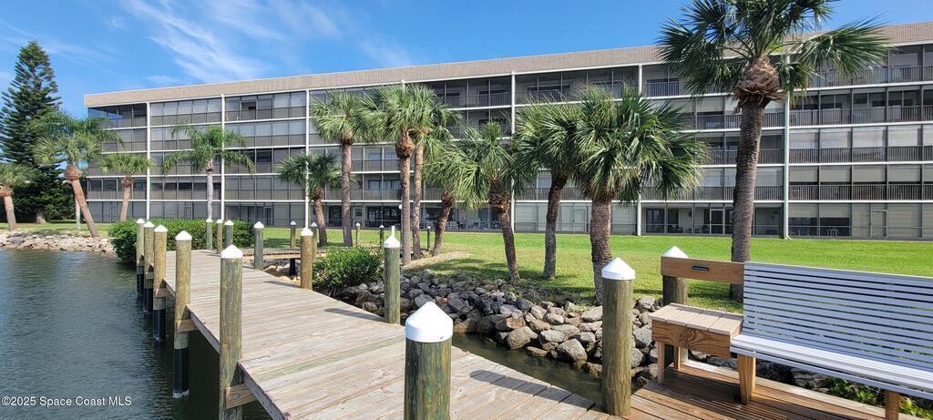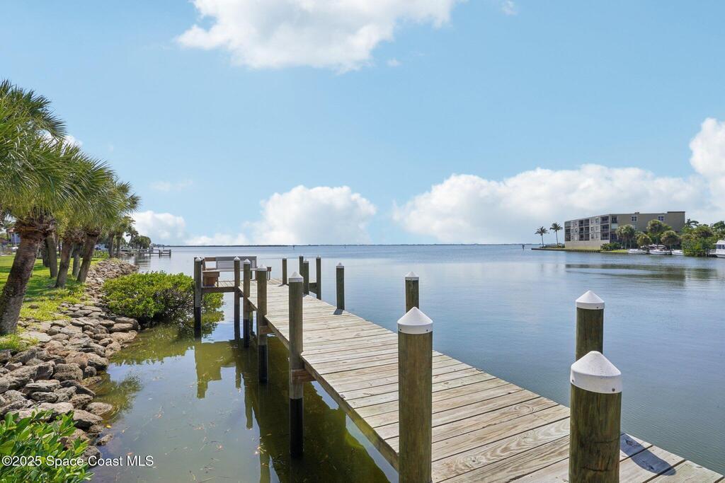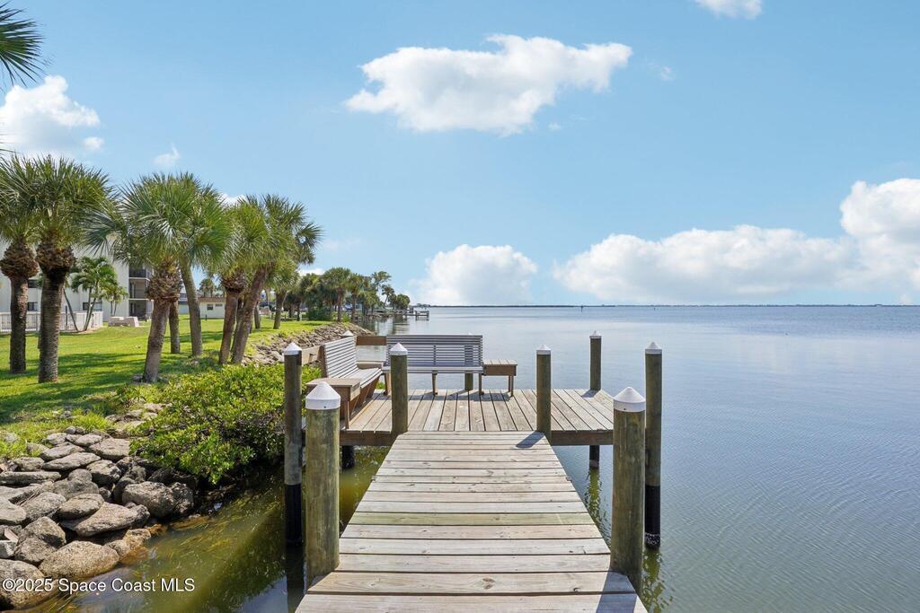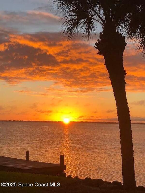 Imagine waking up to sparkling Waterfront views on the Banana River, where every day feels like Paradise. This direct Riverfront 1st-floor Cocoa Beach condo offers carefree, fully furnished living--no stairs, no elevator & your garage just steps away. From the moment you enter, water views fill the open floor plan through oversized sliders to your private balcony. Freshly updated with neutral paint, vinyl wood-look floors, remodeled kitchen with granite, cabinets & stainless appliances. Both baths are updated, including the owner's suite and the walk-in shower. Holidays are magical--decorate your balcony & gather with friends to watch the dazzling Christmas Boat Parade. Enjoy sunrise beach walks, surfing, kayaking, paddleboarding, fishing from the dock, or relaxing at your riverside pool. End each day with breathtaking sunsets & a cold drink. With festivals, art shows, Surfing Santa's & boat races nearby--your dream waterfront oasis awaits! AC 2021 & hurricane shutters.