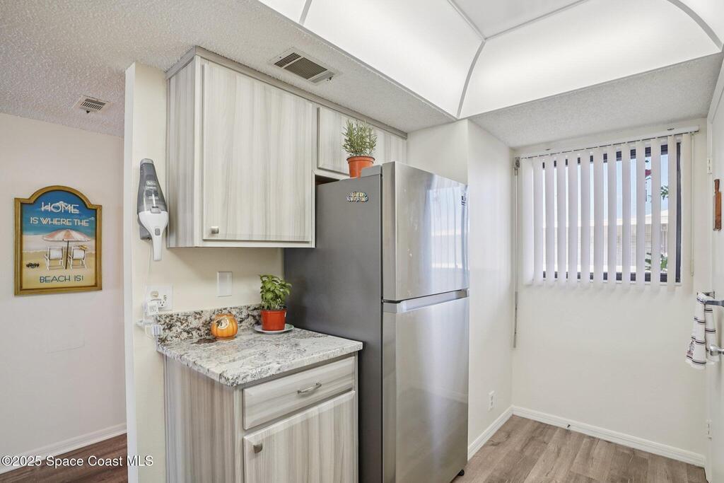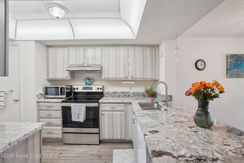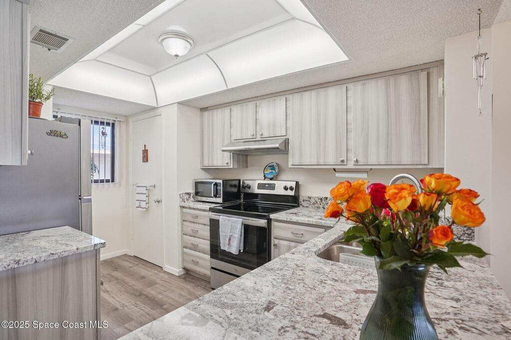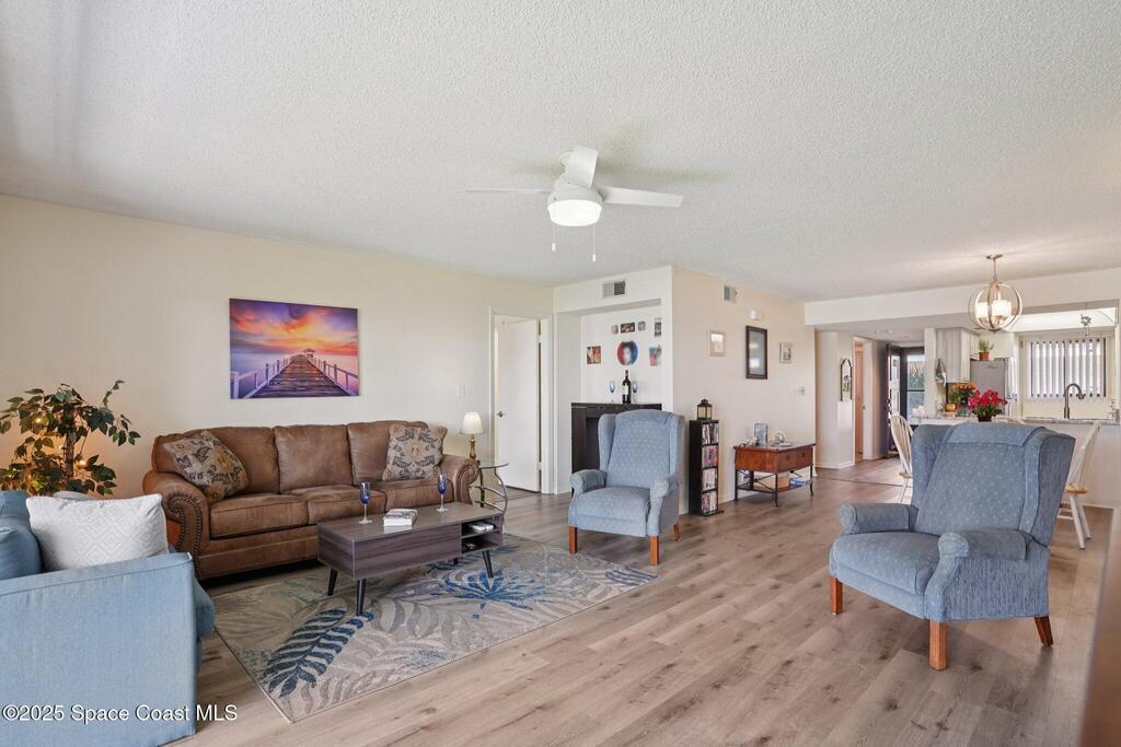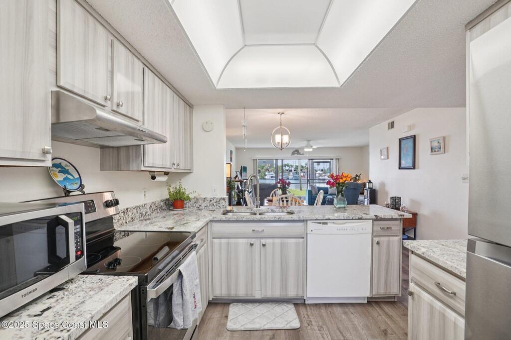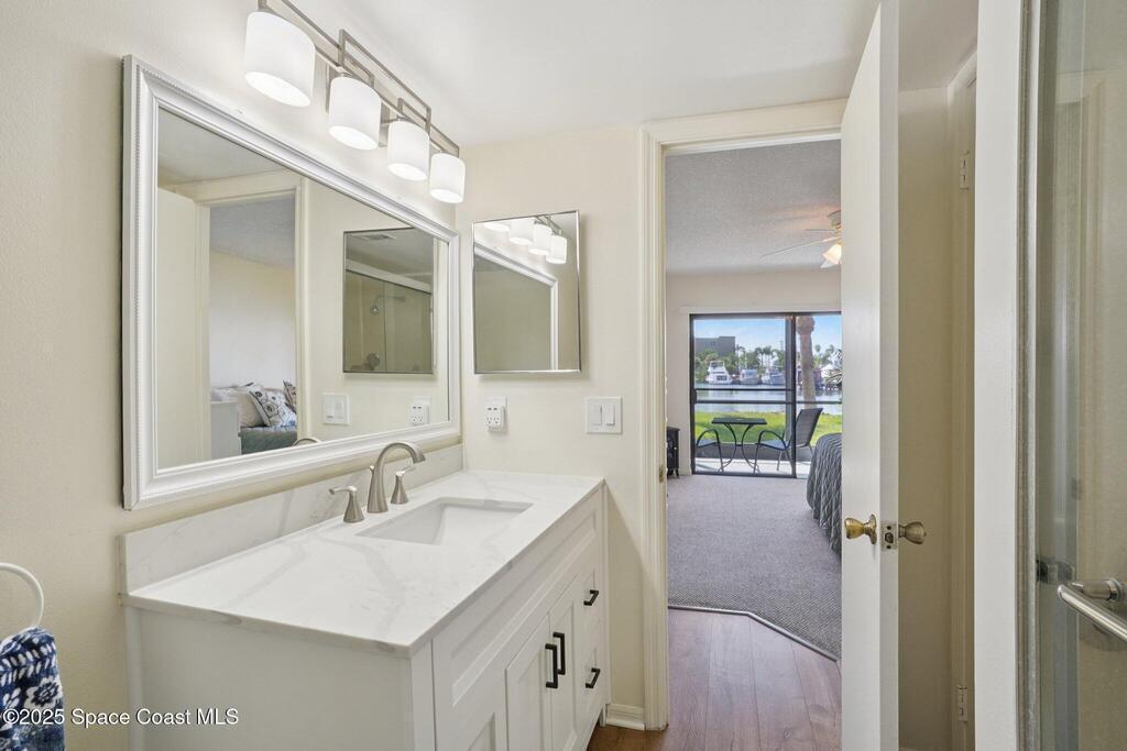 Imagine waking up to sparkling Waterfront views on the Banana River, where every day feels like Paradise. This direct Riverfront 1st-floor Cocoa Beach condo offers carefree, fully furnished living--no stairs, no elevator & your garage just steps away. From the moment you enter, water views fill the open floor plan through oversized sliders to your private balcony. Freshly updated with neutral paint, vinyl wood-look floors, remodeled kitchen with granite, cabinets & stainless appliances. Both baths are updated, including the owner's suite and the walk-in shower. Holidays are magical--decorate your balcony & gather with friends to watch the dazzling Christmas Boat Parade. Enjoy sunrise beach walks, surfing, kayaking, paddleboarding, fishing from the dock, or relaxing at your riverside pool. End each day with breathtaking sunsets & a cold drink. With festivals, art shows, Surfing Santa's & boat races nearby--your dream waterfront oasis awaits! AC 2021 & hurricane shutters.