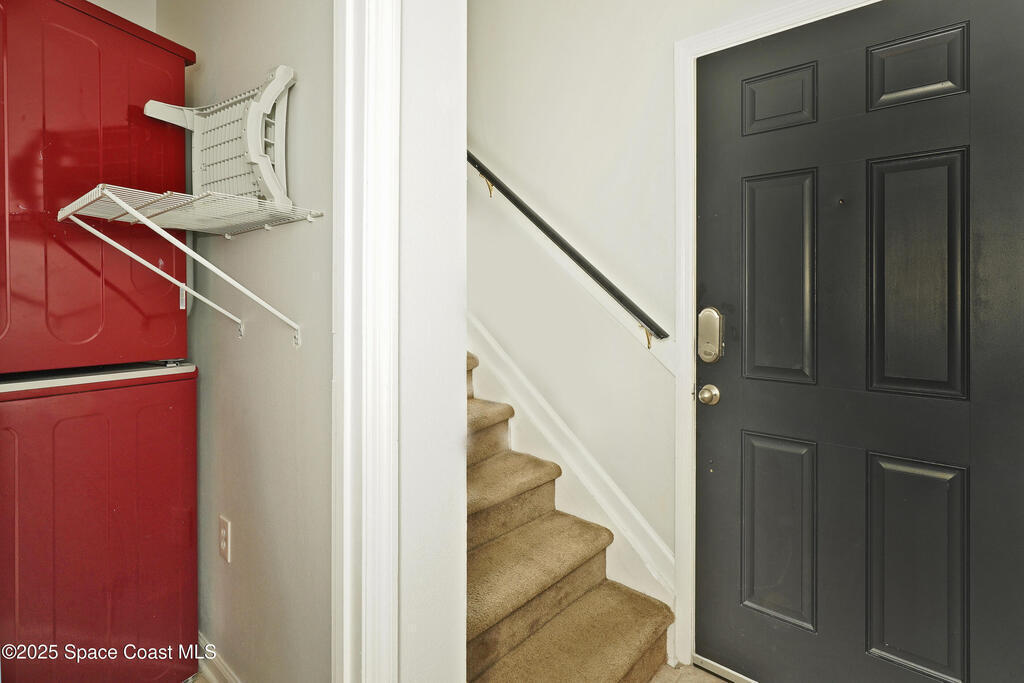 This nice, second floor, 2 bedroom, 2 bath, Rockledge unit is in a gated community and has an open plan for you and your family. The 2 bedrooms are bright witth wood and carpet. The kitchen has a wide counter area and electric, stainless appliances and there's a dining area within the spacious living room. The master bedroom has large a walk-in closet and attached bathroom. There is a laundry room at the bottom of the stairs just inside the one car garage. And you will find a community pool, kids, playground just a short walk from the unit. This unit is close to shopping, schools, churches, restaurants and entertainment including golf courses and parks. Just a 12 mile drive to the beach and 40 minutes to Orlando.