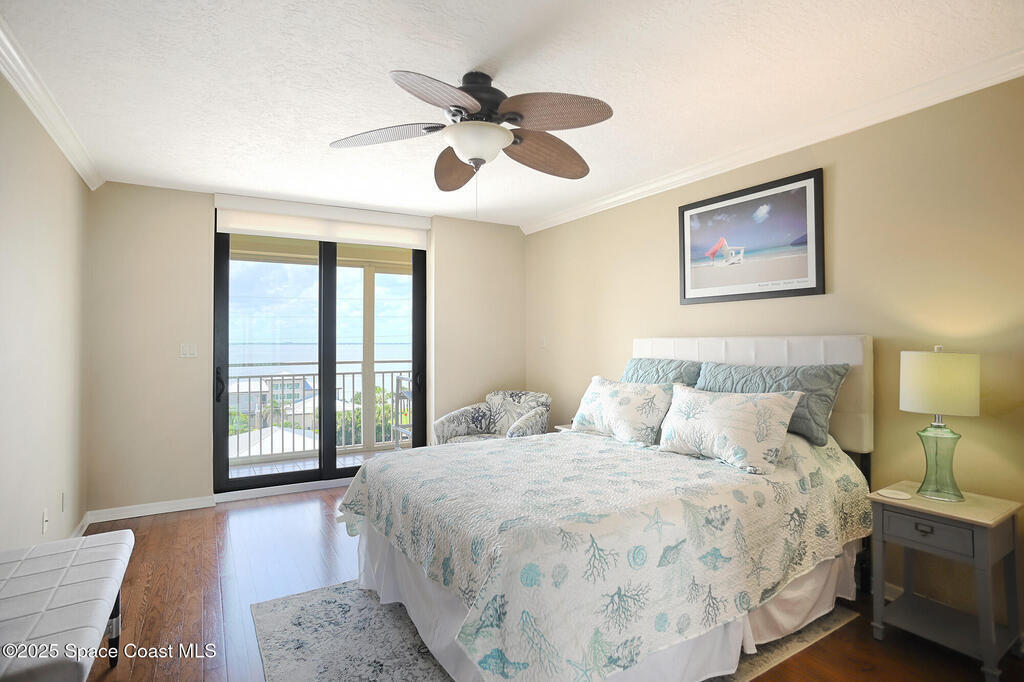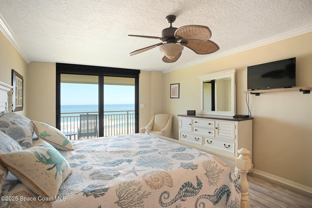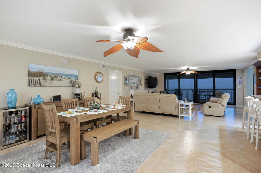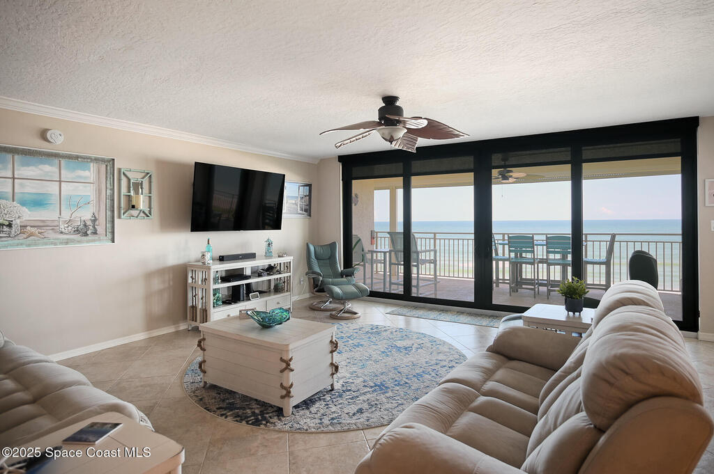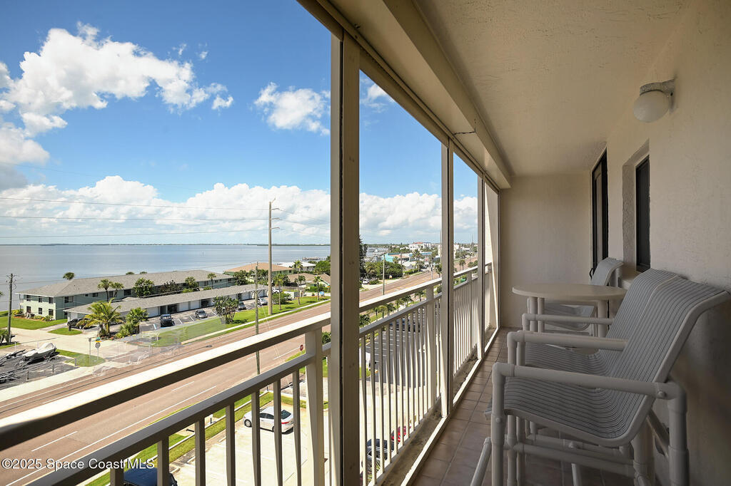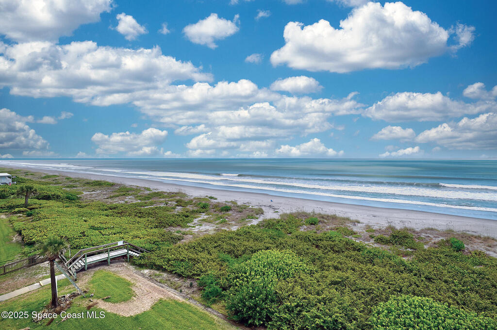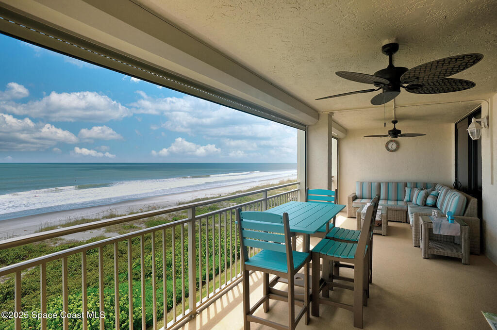 A classic Florida lifestyle awaits you in this beautifully remodeled, spacious 6th floor oceanfront home. A rare opportunity w/East & West facing balconies to enjoy ocean sunrises and Banana River sunsets. This open, well-appointed kitchen is a chef's dream - coffered ceiling, cream wooden beadboard cabinets, antiqued styled paned glass, quality soft close dovetailed drawers, pull-out shelving & drawers. Hi-end appliances - Thermador oven, microwave & warming drawer; Bosch DW; SS LG ThinQ refrigerator; 5 burner induction stove. Floor to ceiling hurricane impact sliders w/cooling fabric blinds. Renovated Primary bath w/double shower heads, lg jacuzzi tub & double sinks. More features: renovated laundry room w/cabinets, closet organizer systems, crown molding & electric shutters. Oversized garage space w/more room than typical & private storage closet. Both Milestone & SIRS are complete and in place for peace of mind. Come explore the quiet & secluded nature that is south Cocoa Beach.