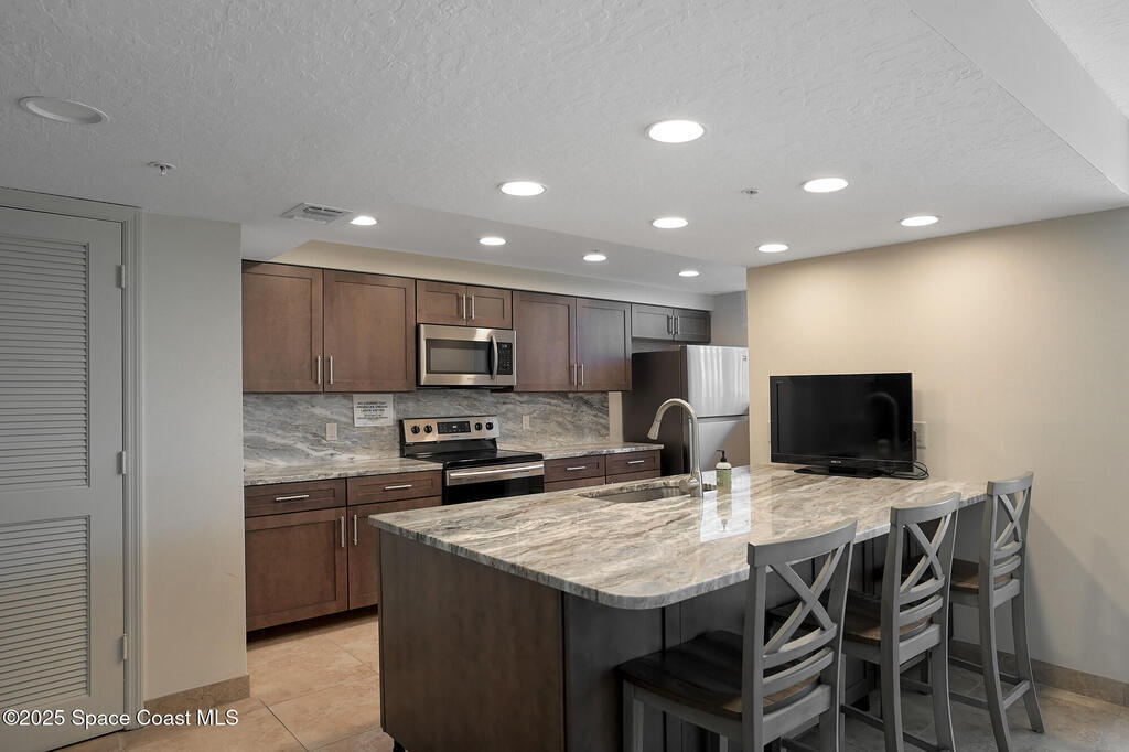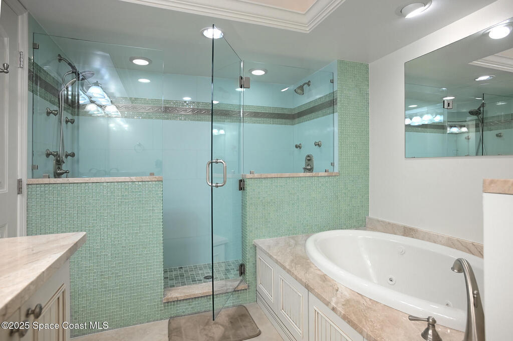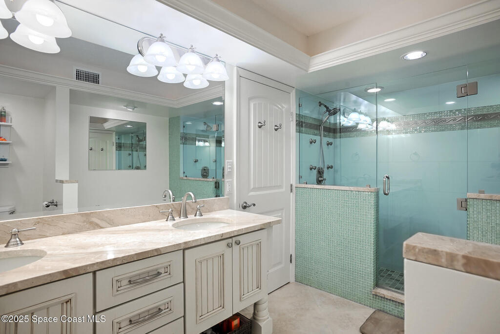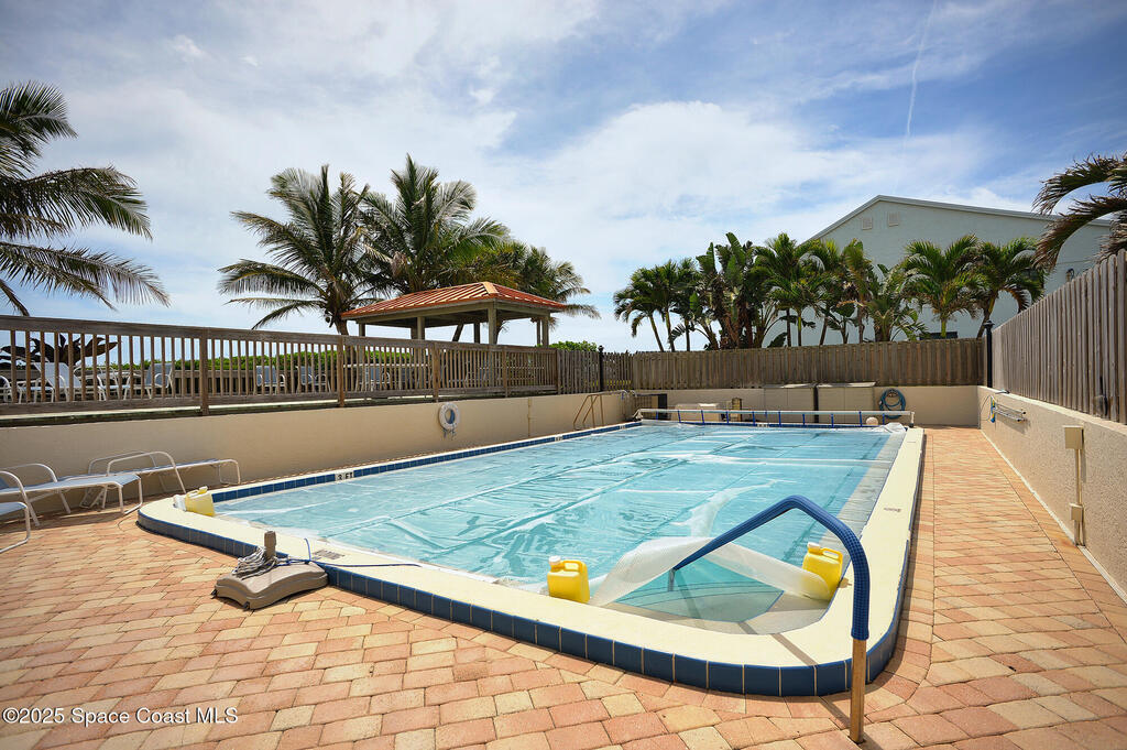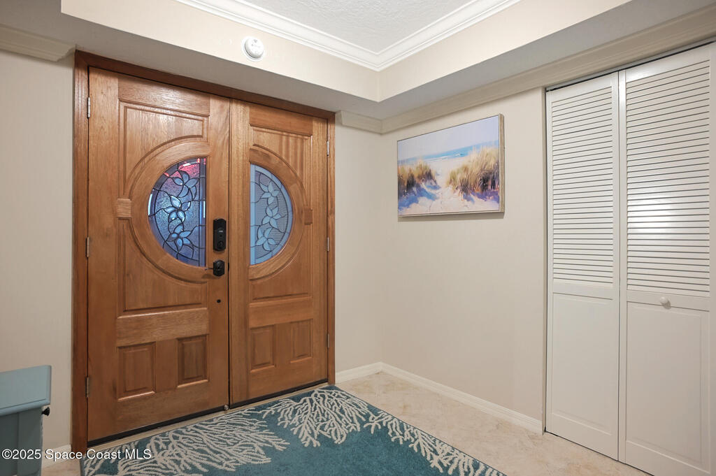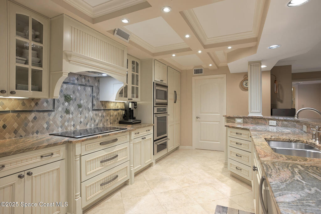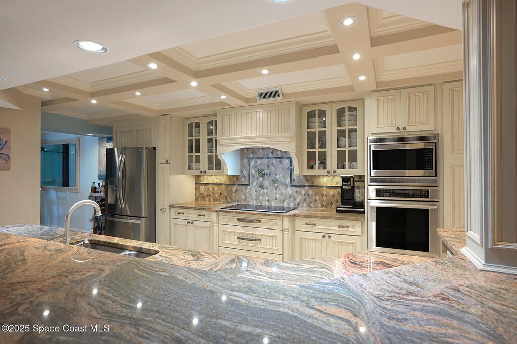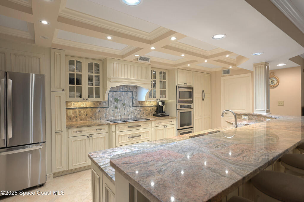 A classic Florida lifestyle awaits you in this beautifully remodeled, spacious 6th floor oceanfront home. A rare opportunity w/East & West facing balconies to enjoy ocean sunrises and Banana River sunsets. This open, well-appointed kitchen is a chef's dream - coffered ceiling, cream wooden beadboard cabinets, antiqued styled paned glass, quality soft close dovetailed drawers, pull-out shelving & drawers. Hi-end appliances - Thermador oven, microwave & warming drawer; Bosch DW; SS LG ThinQ refrigerator; 5 burner induction stove. Floor to ceiling hurricane impact sliders w/cooling fabric blinds. Renovated Primary bath w/double shower heads, lg jacuzzi tub & double sinks. More features: renovated laundry room w/cabinets, closet organizer systems, crown molding & electric shutters. Oversized garage space w/more room than typical & private storage closet. Both Milestone & SIRS are complete and in place for peace of mind. Come explore the quiet & secluded nature that is south Cocoa Beach.